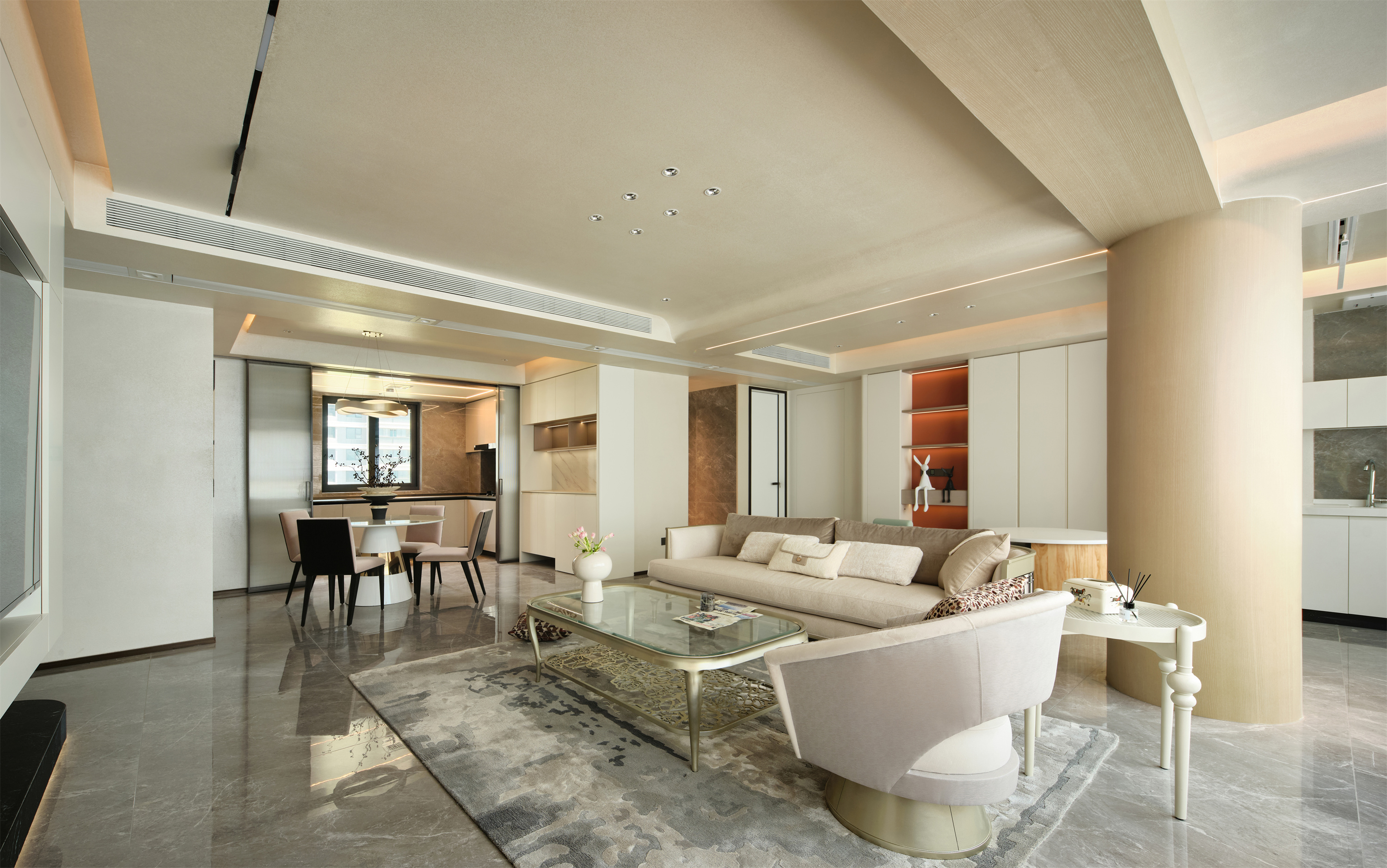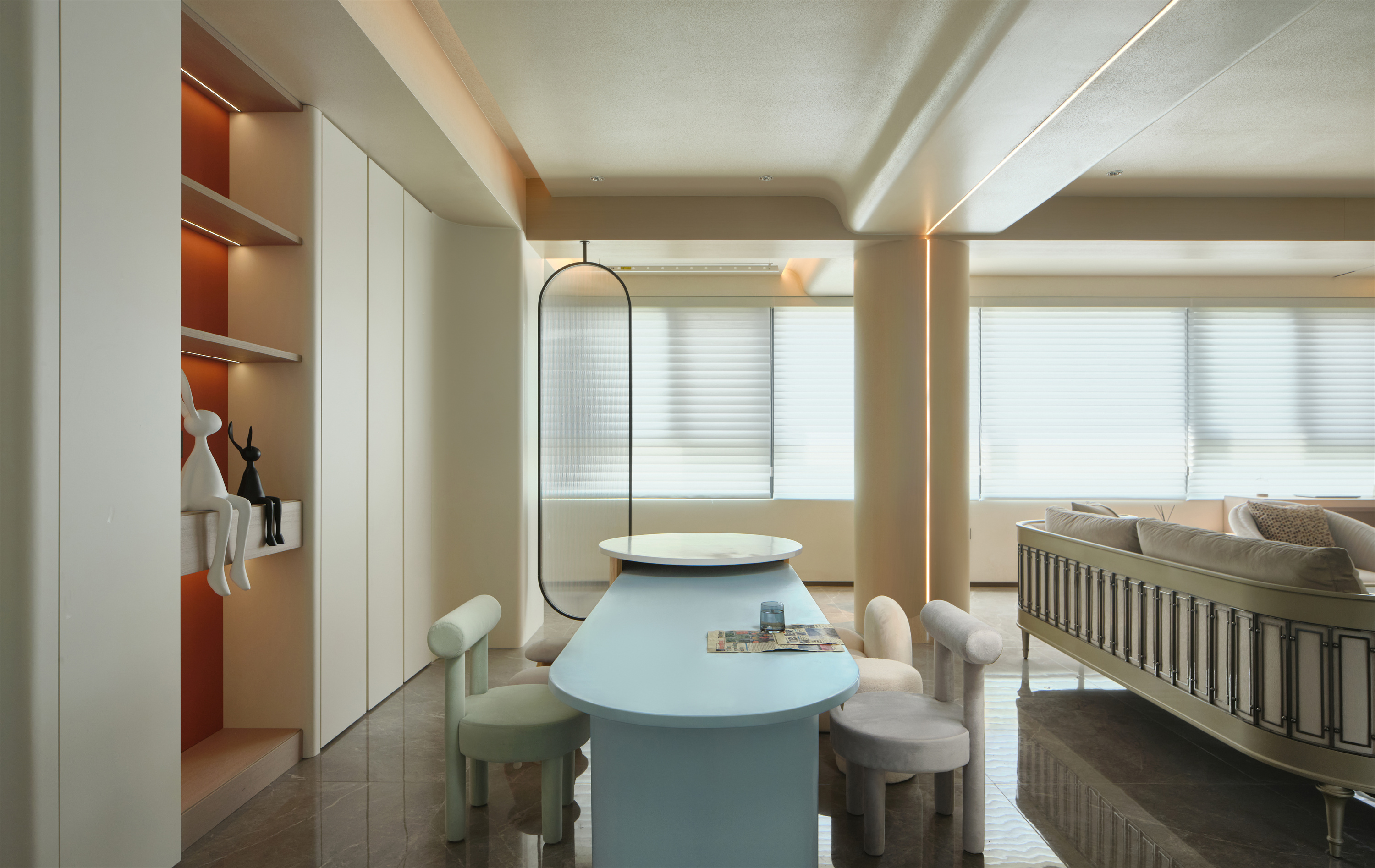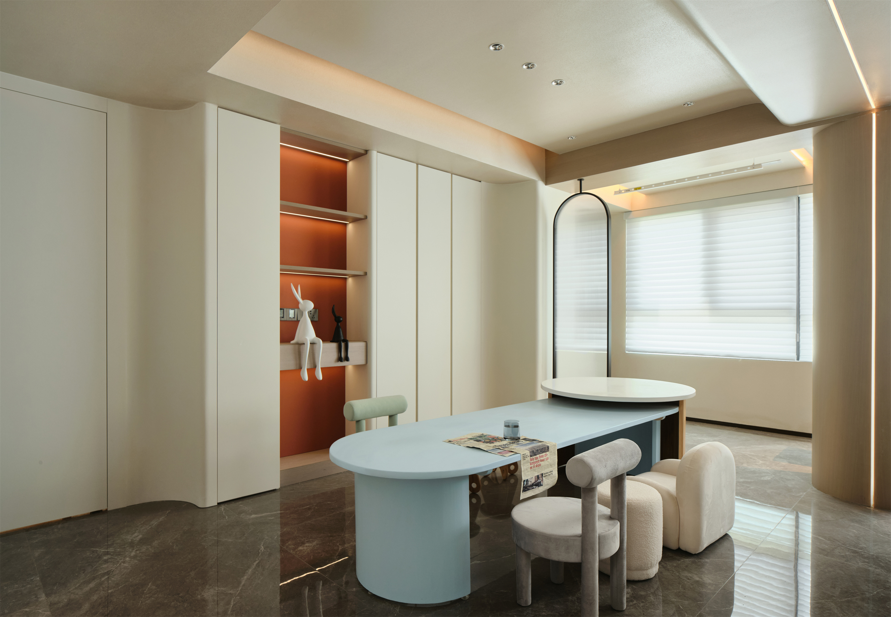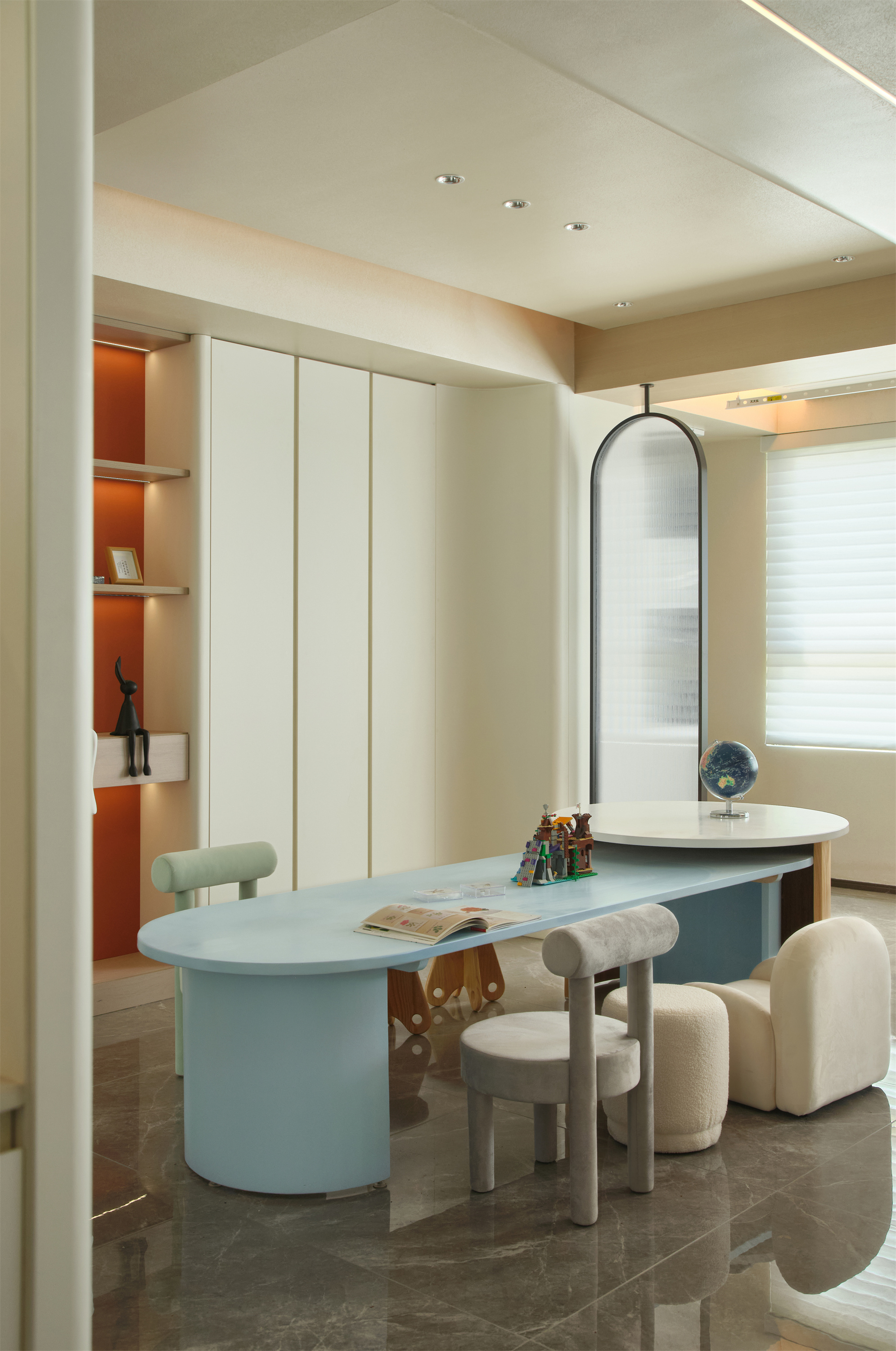 空间布局:全屋整体采用低饱和度的柔和色调为基底,米白木作代替原厚重木纹,局部采用少量深色石材点缀,圆弧曲面的柱形,结合顶面淡木纹包梁,更增一份艺术与自然。少量橙色搭配孩童的天蓝色家具,丰富空间视觉效果。