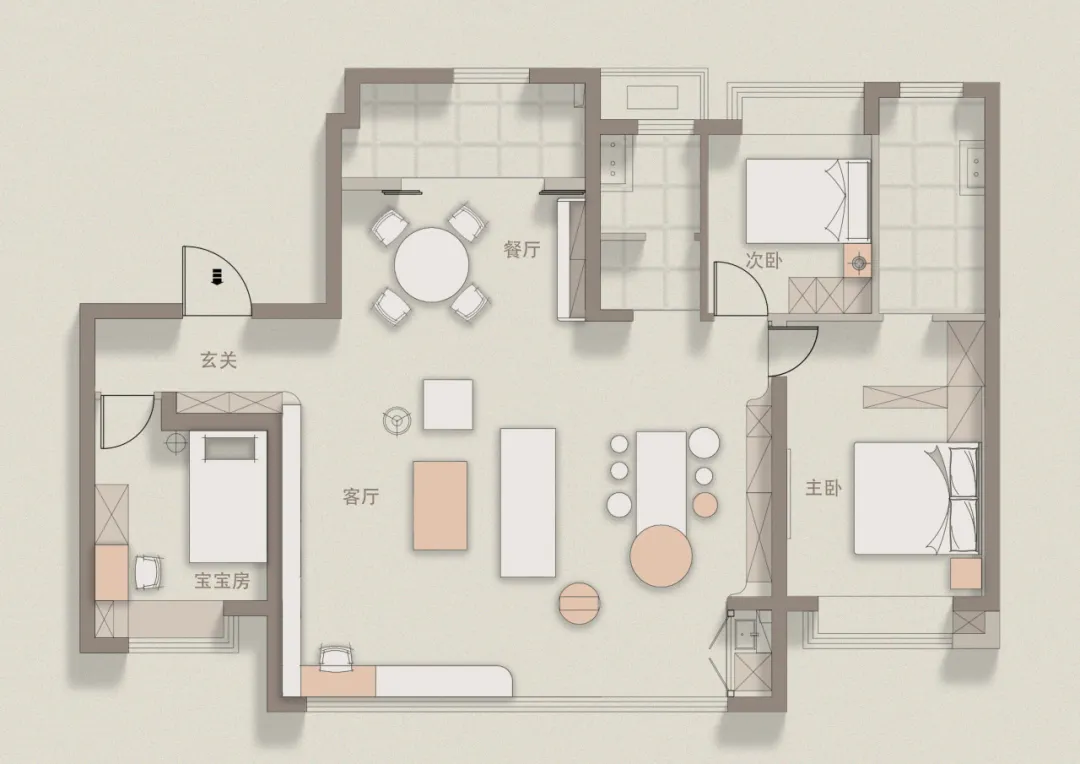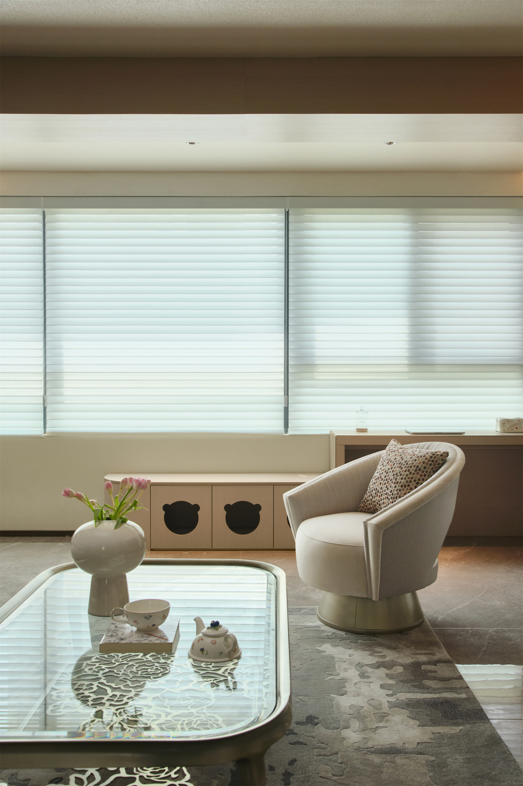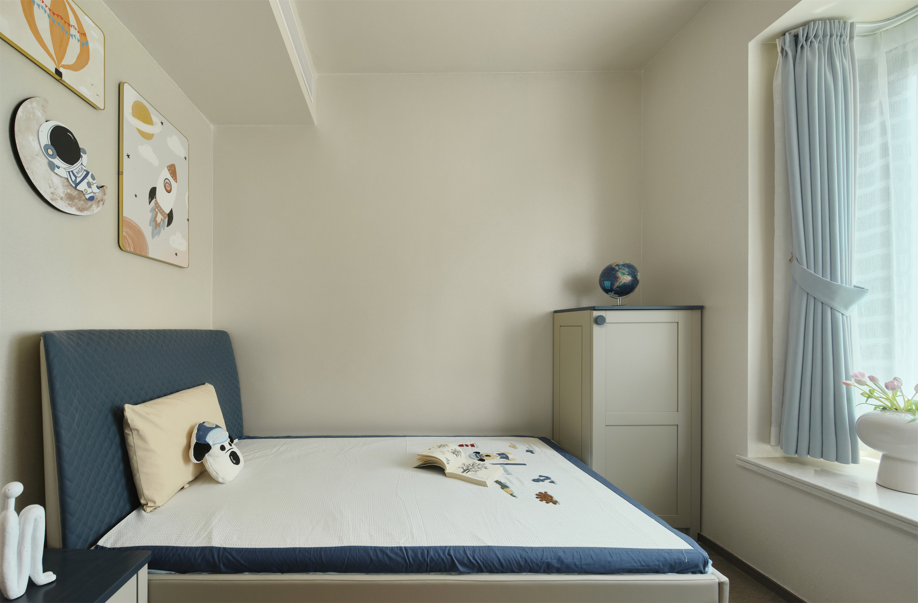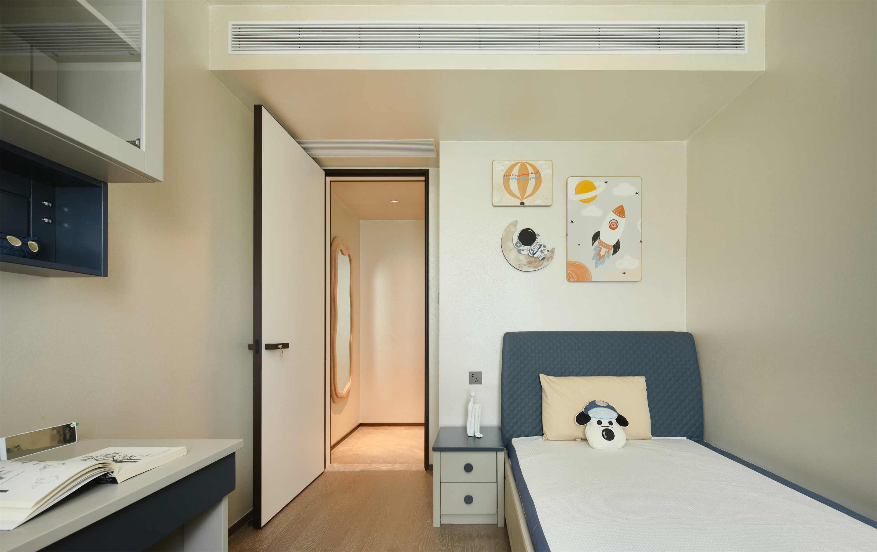 空间布局:全屋整体采用低饱和度的柔和色调为基底,米白木作代替原厚重木纹,局部采用少量深色石材点缀,圆弧曲面的柱形,结合顶面淡木纹包梁,更增一份艺术与自然。少量橙色搭配孩童的天蓝色家具,丰富空间视觉效果。