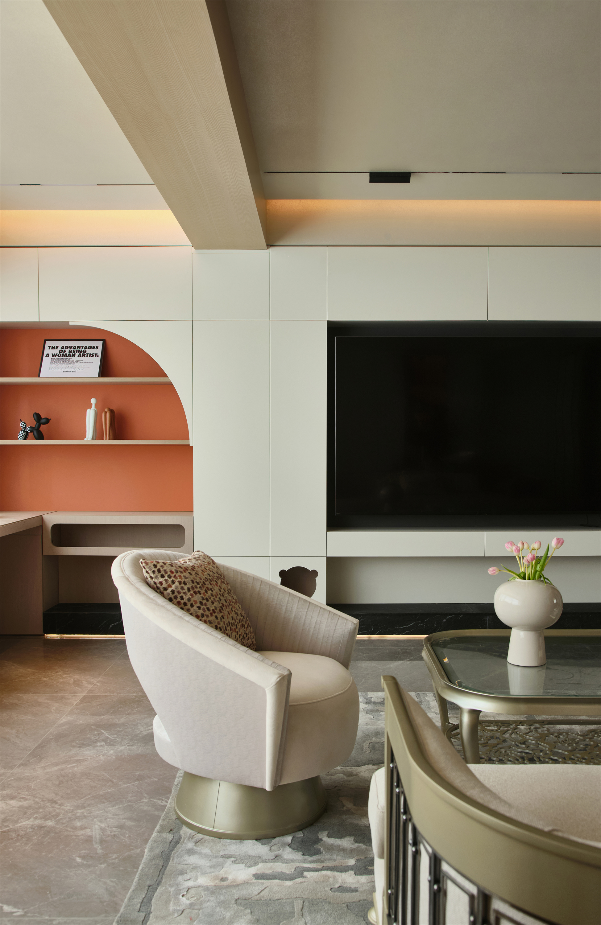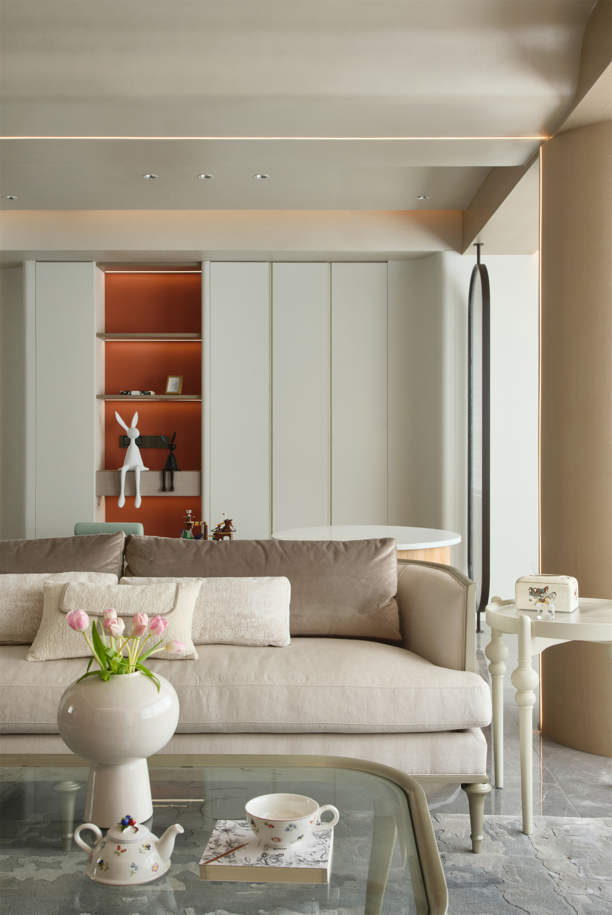玄关柜延伸至客厅,转角处采用弧形曲面过渡,更显自然温馨;