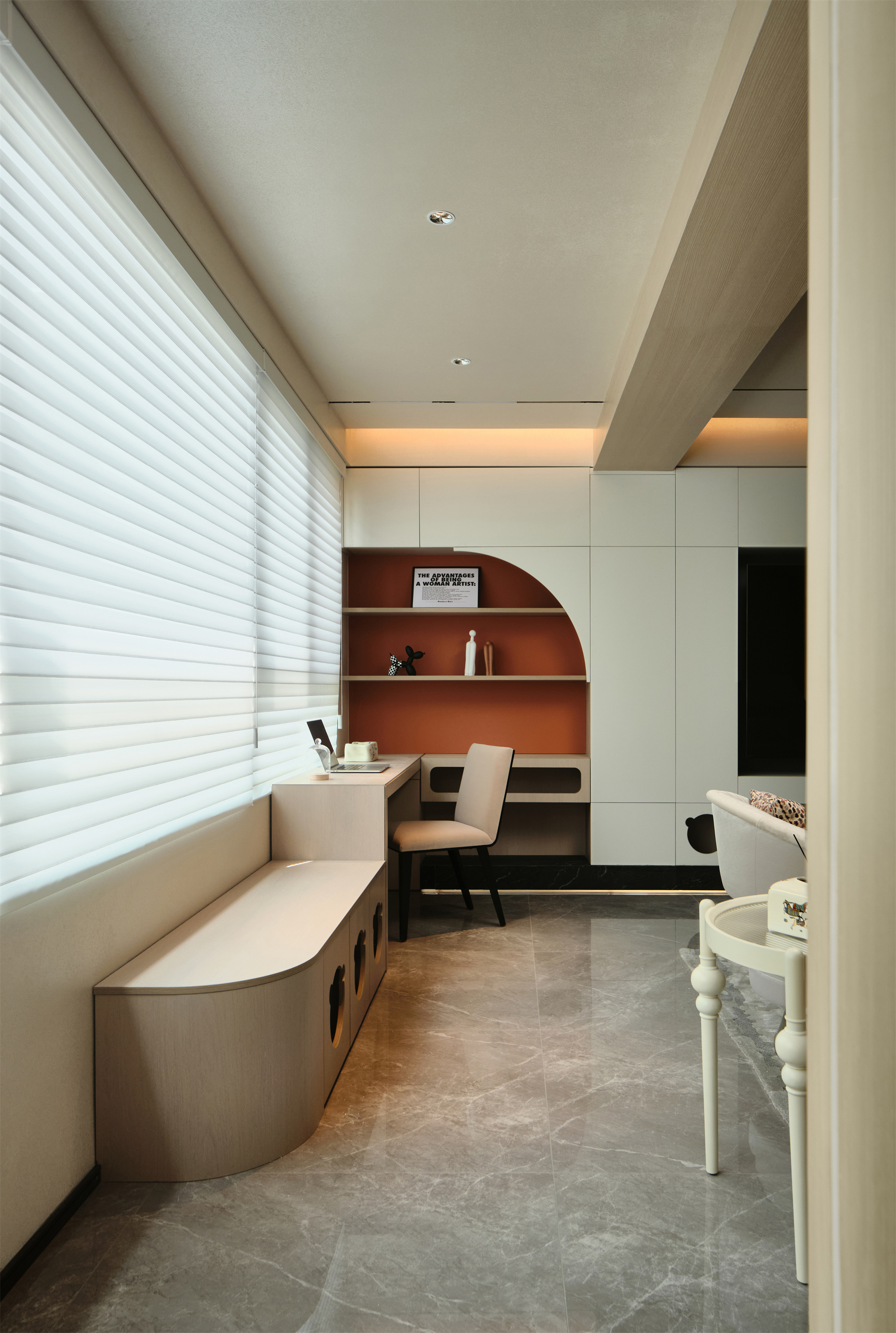 靠窗区的小卡座便于家长陪伴孩子学习,并与客厅沙发布置形成围合的沟通氛围;