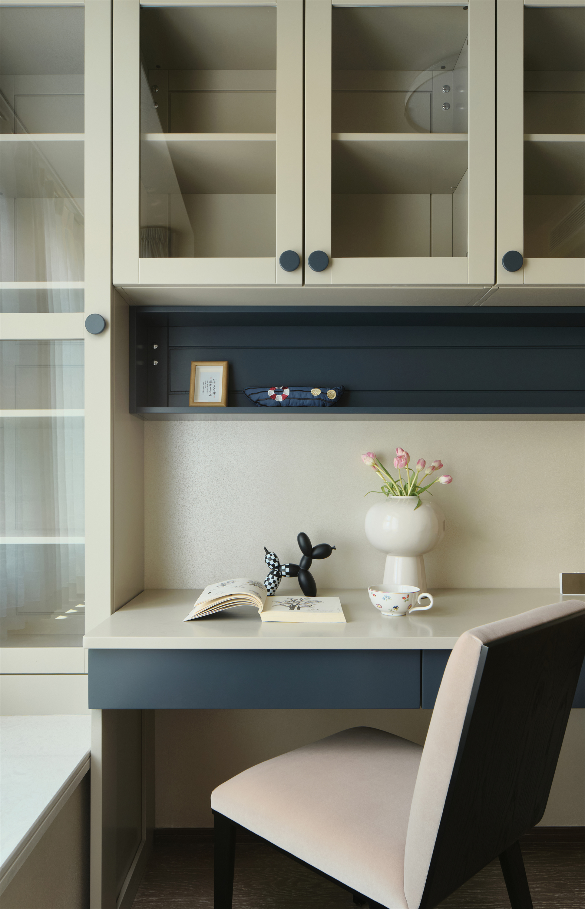 玩具桌后方布置的收纳暗柜既美观又实用,局部敞开的开放架,有助于培养孩子更好的学会收拾和收纳玩具。 -