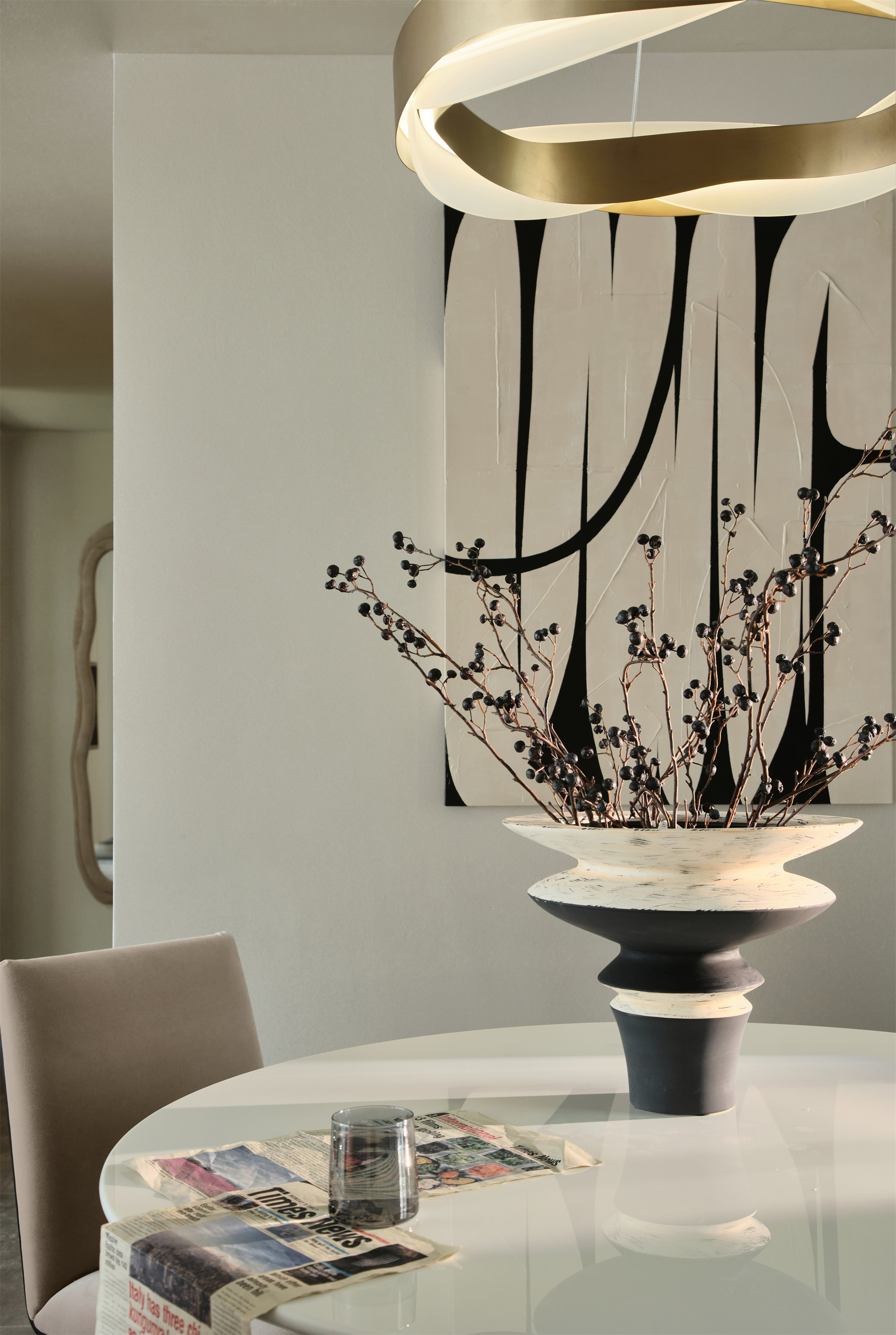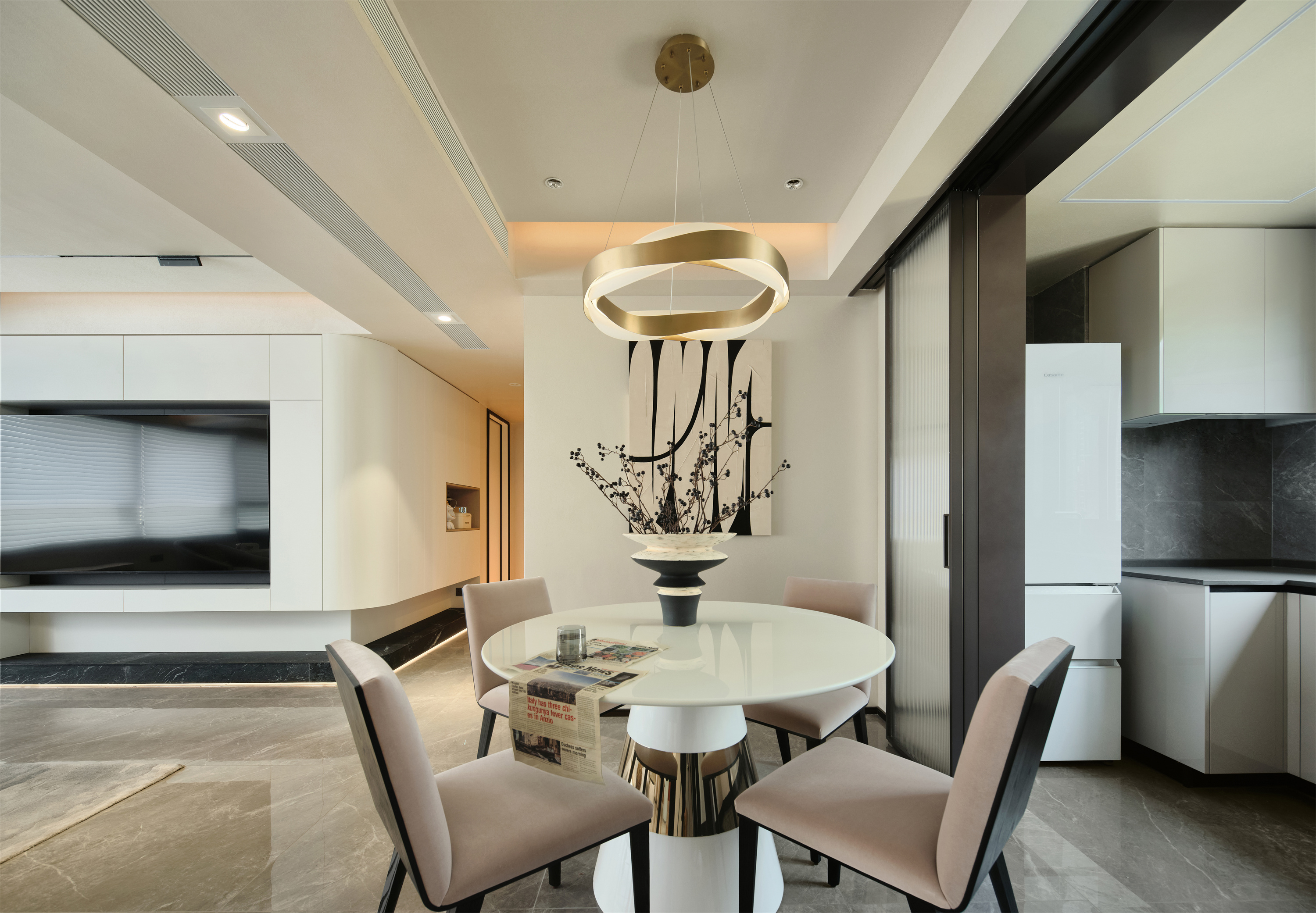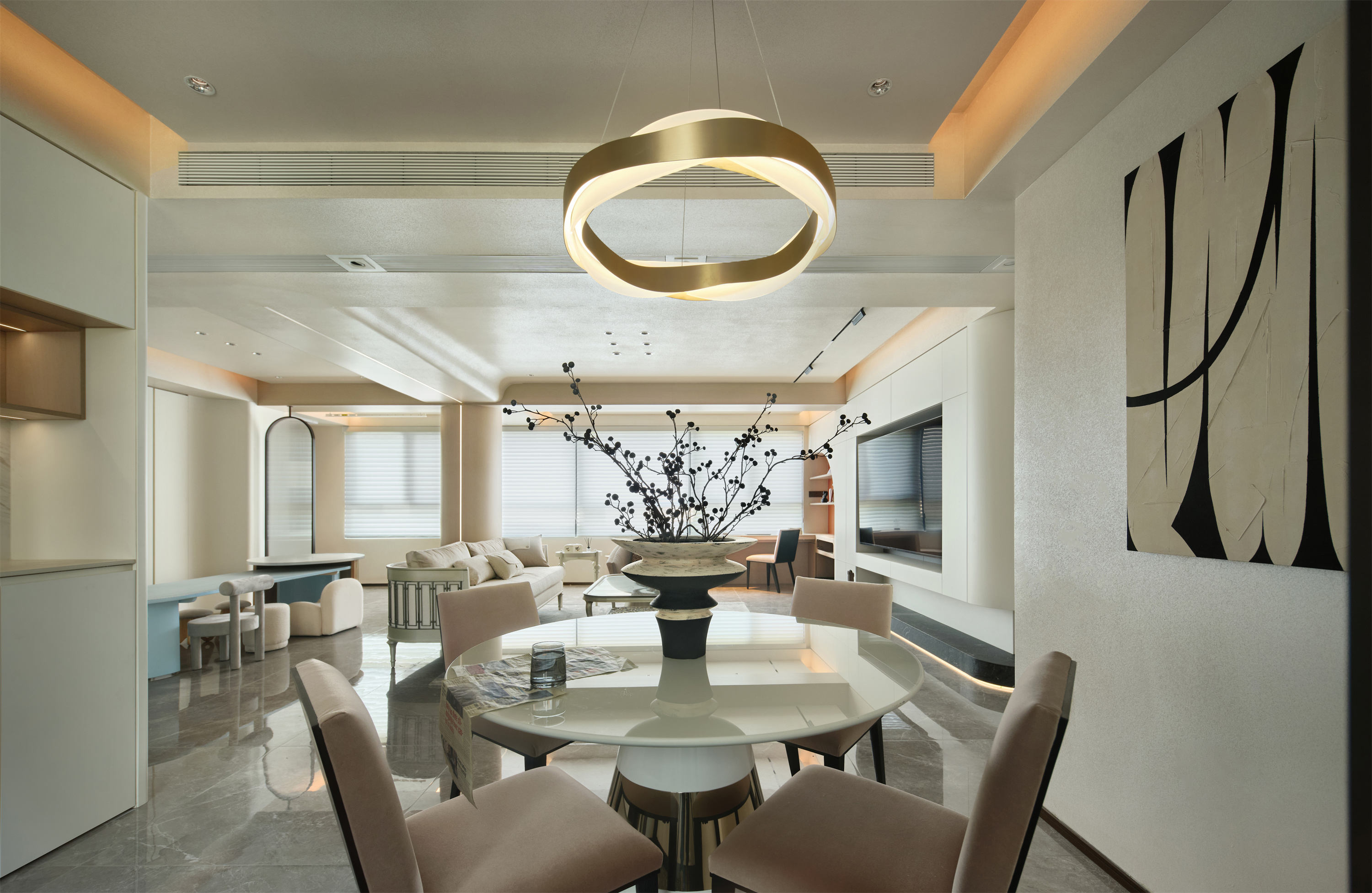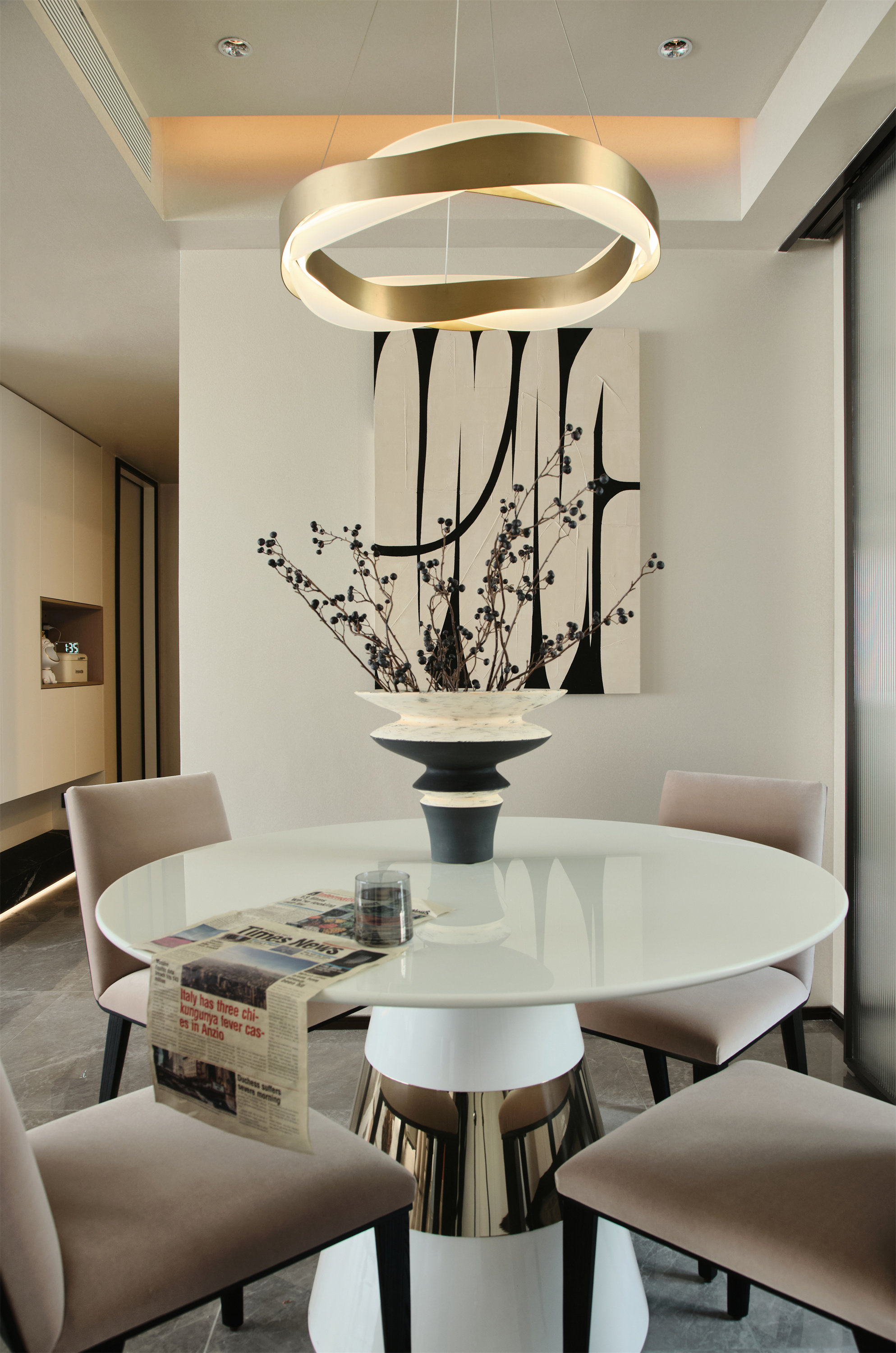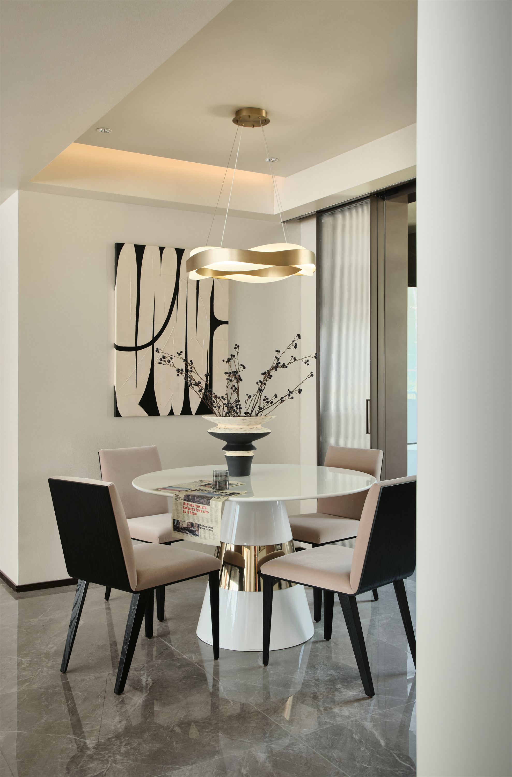 餐厅布置圆桌,搭配精致圆形金属吊灯,精致不乏高级,顶面留有暖色光带,氛围感满满;