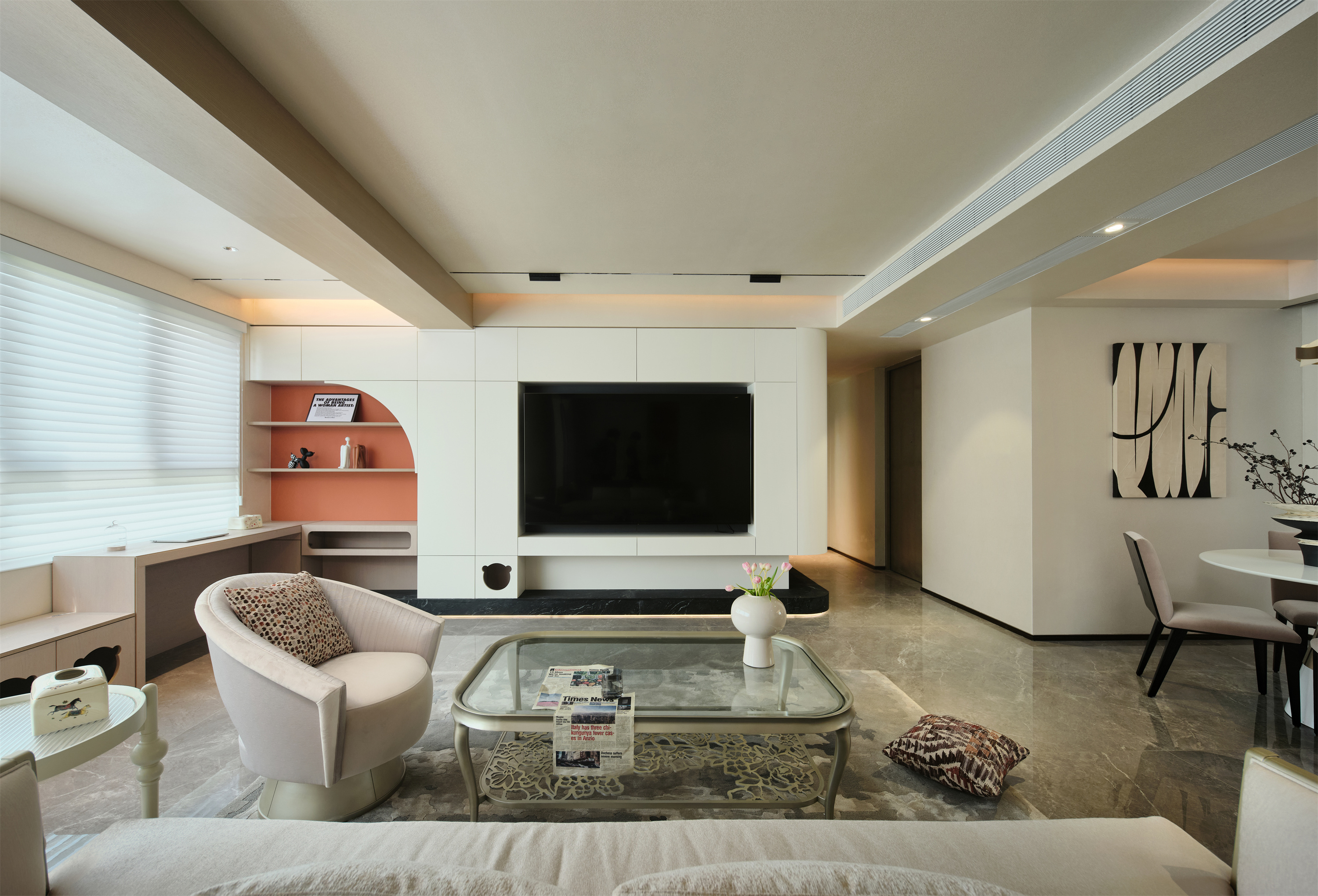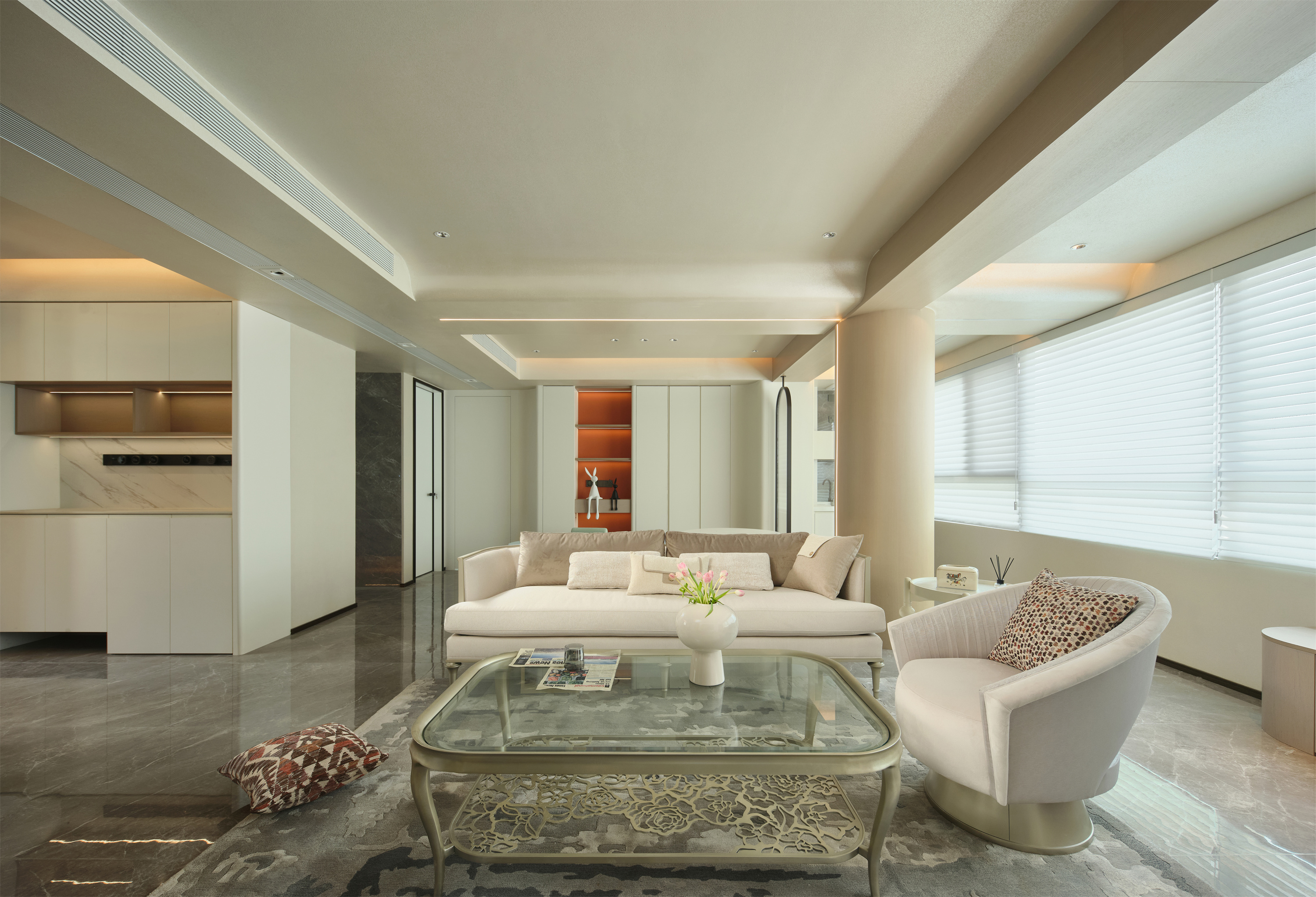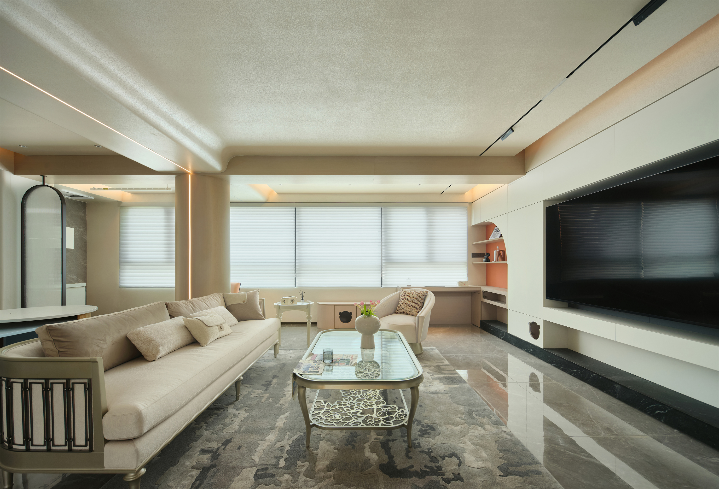 大梁采用曲面吊顶柔和视觉,无主灯的设计采用线性光带增加灯光层次;