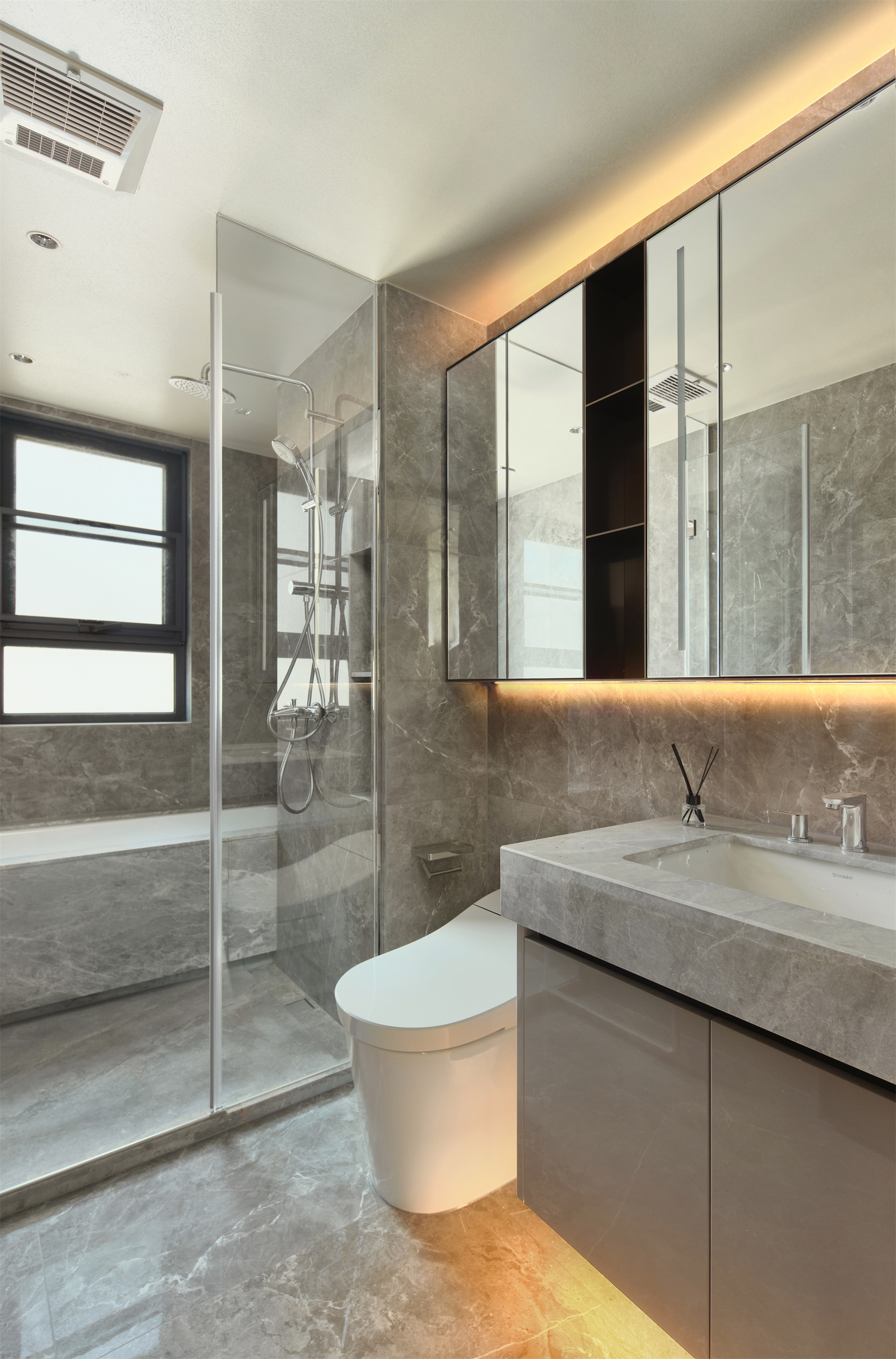 原房墙地以灰色为主,用色较暗,配以厚重木纹,与白色石材和顶面形成对比,略显冷调。每个人理想的家不同,经分析本案设计以打造温馨、精致且不失活泼的调性结合现代生活理念的布局方式呈现。 -