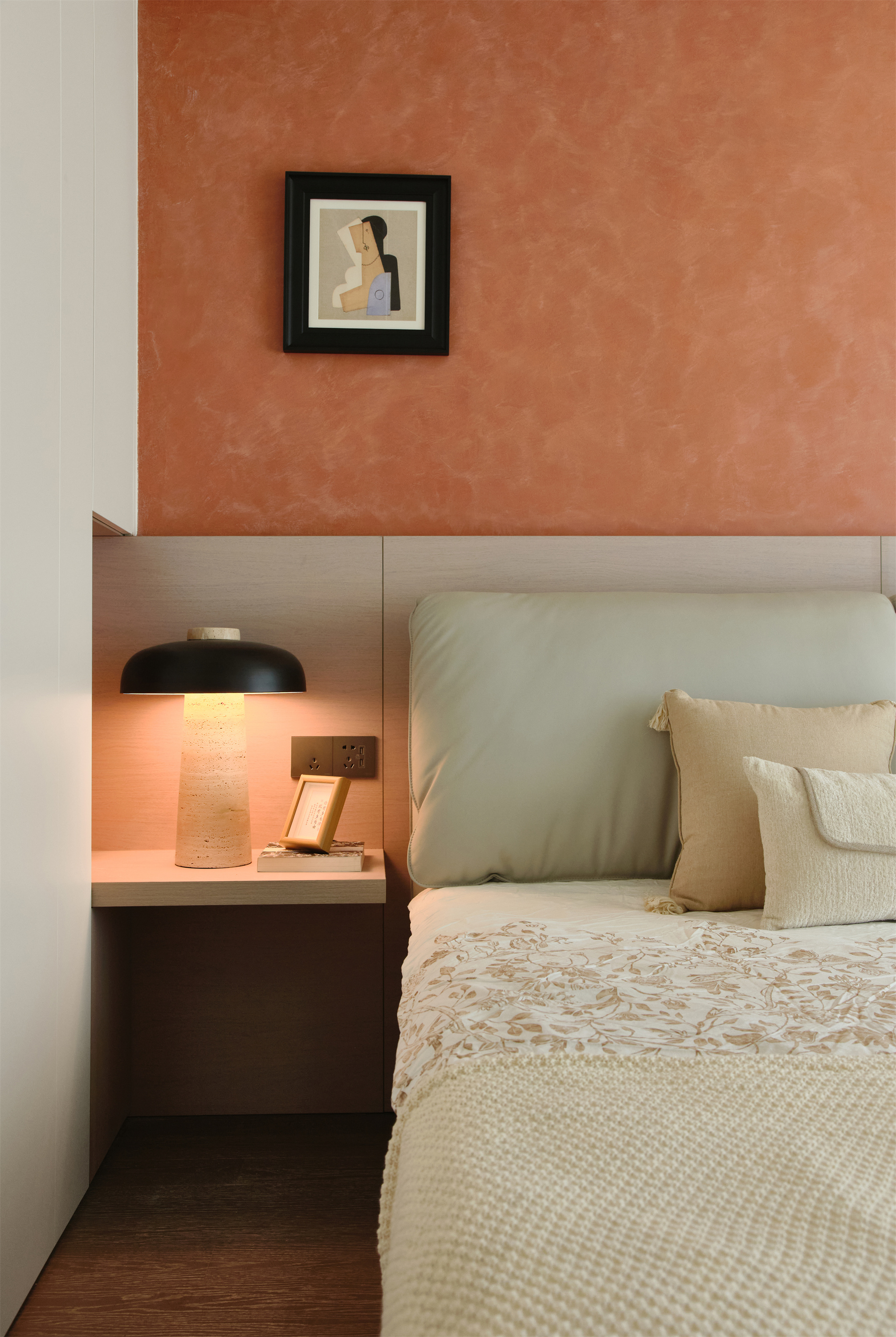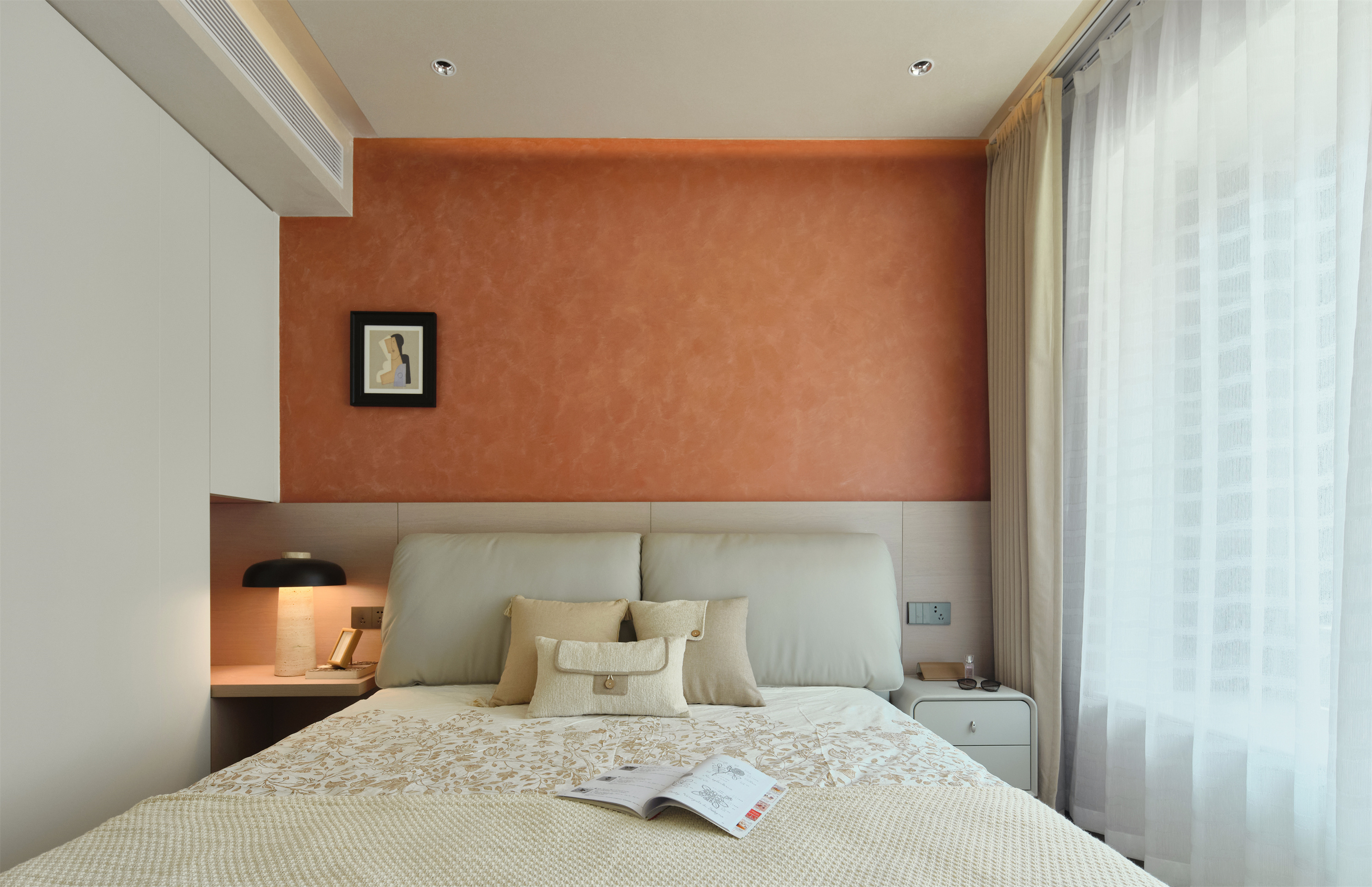 主卧设置L型敞开衣帽区,收纳衣柜结合床背景板,空间延伸的悬挑床头柜方便使用,让空间更为宽敞;