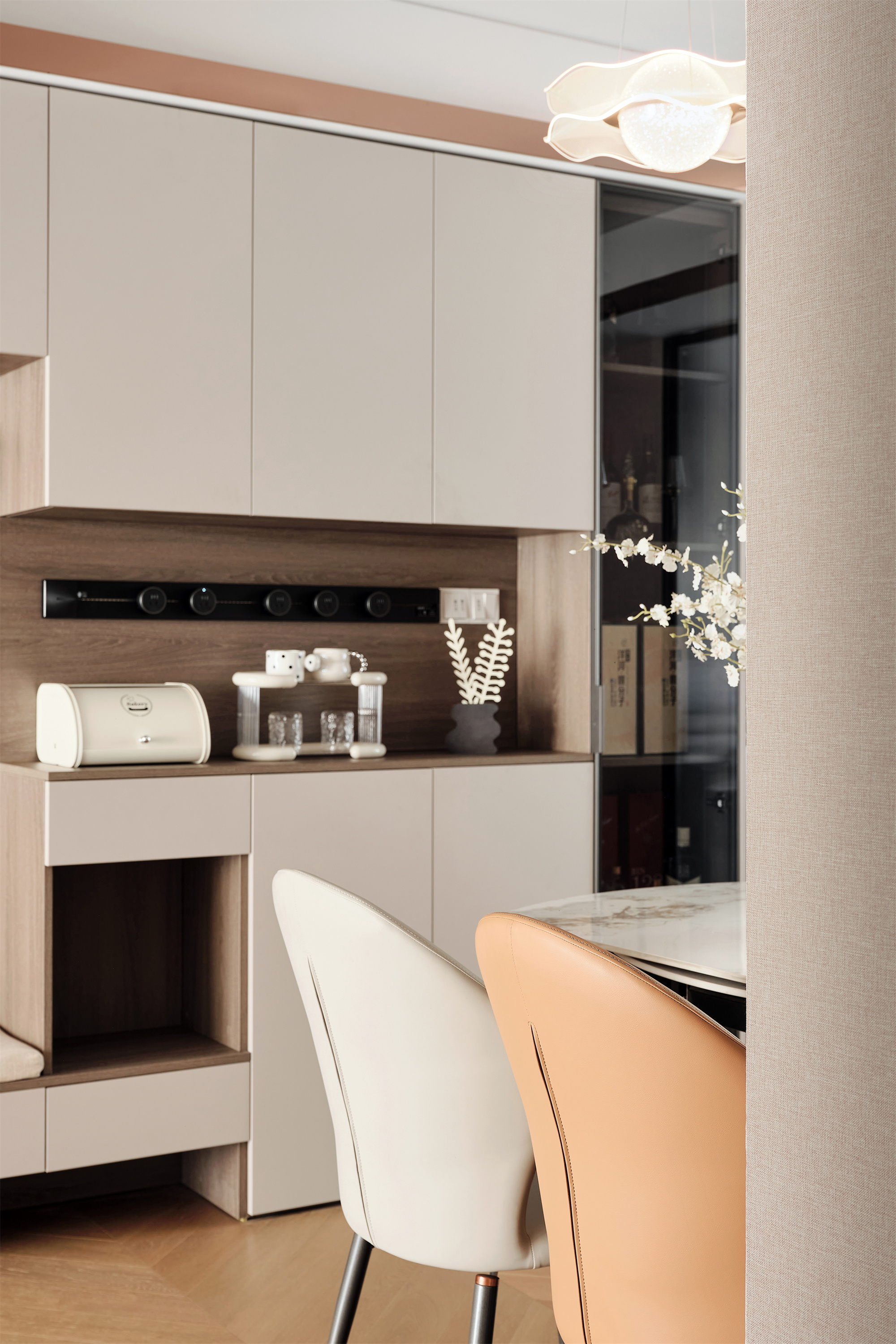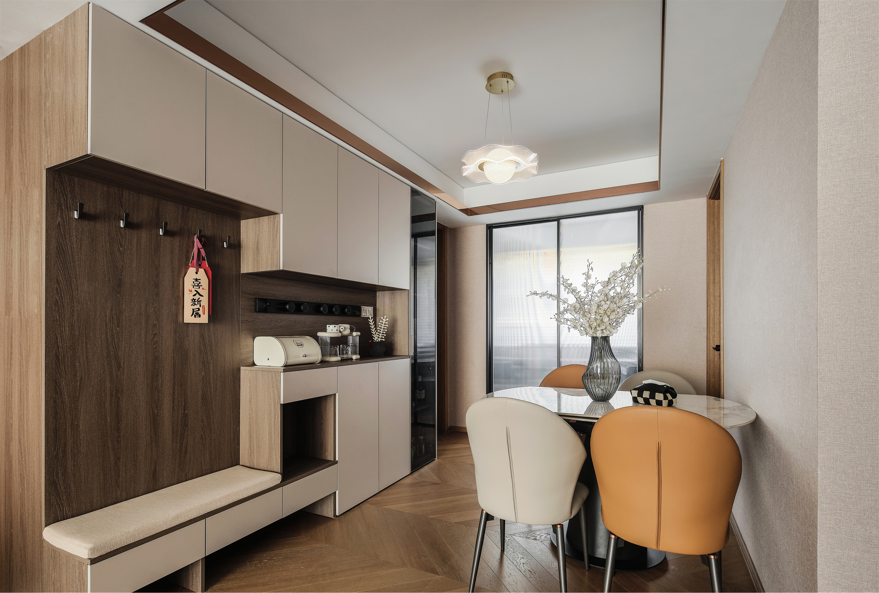 餐厅设计组合薄柜,满足玄关收纳和补充茶水台的使用功能;