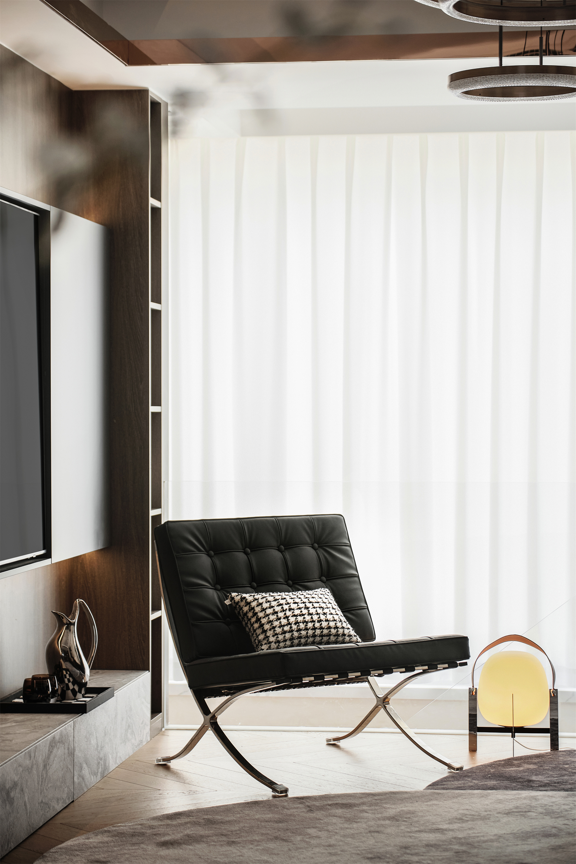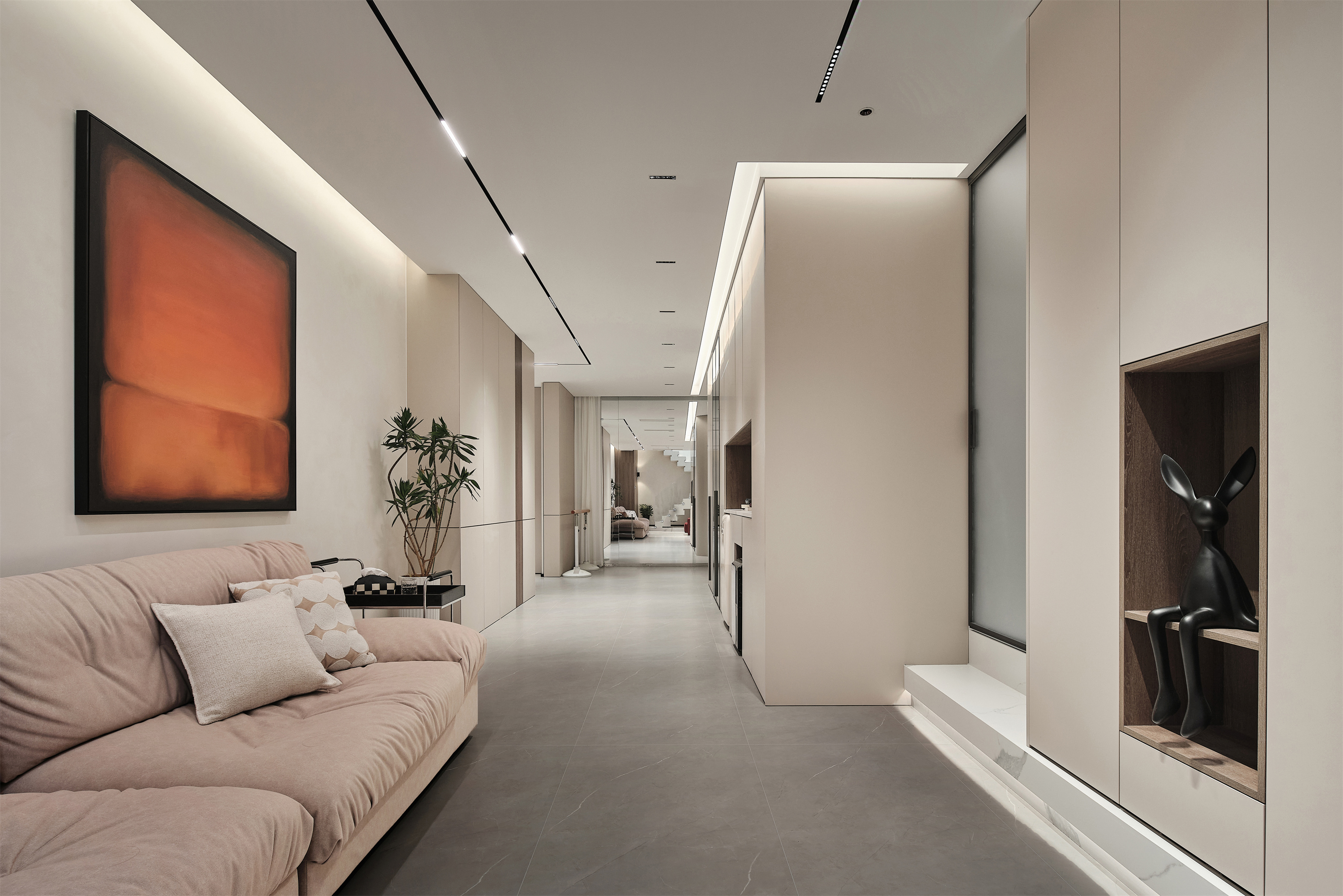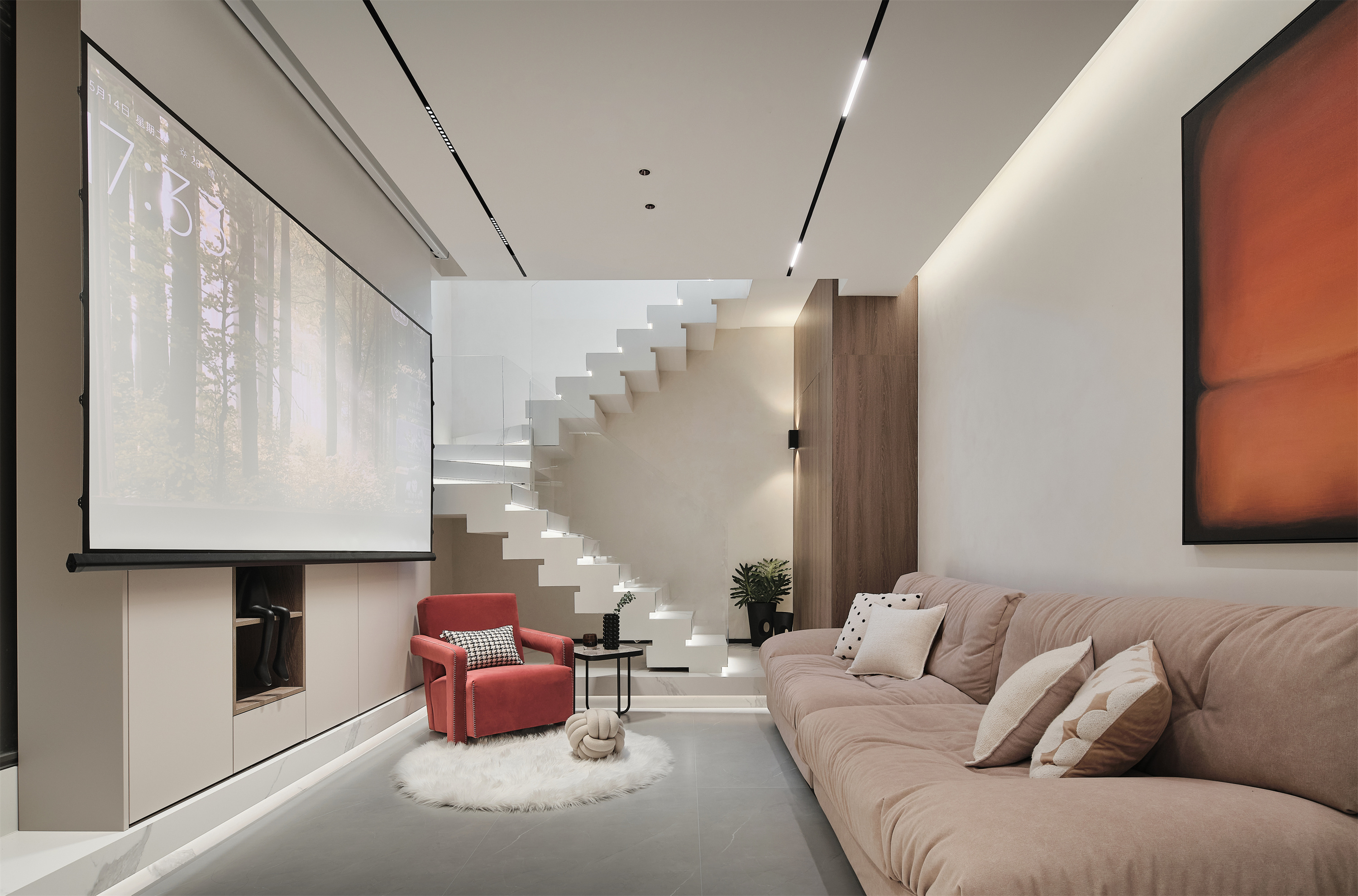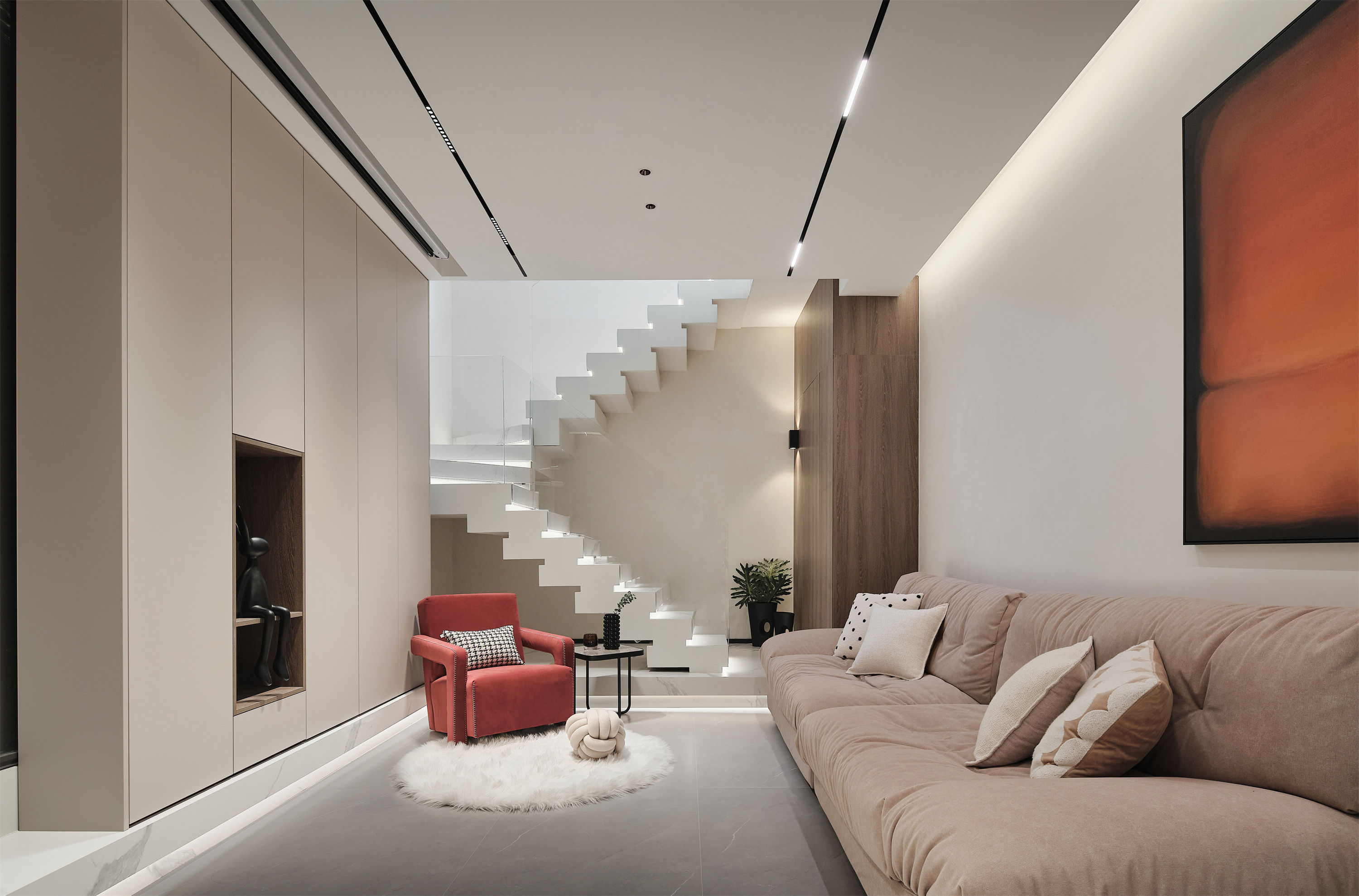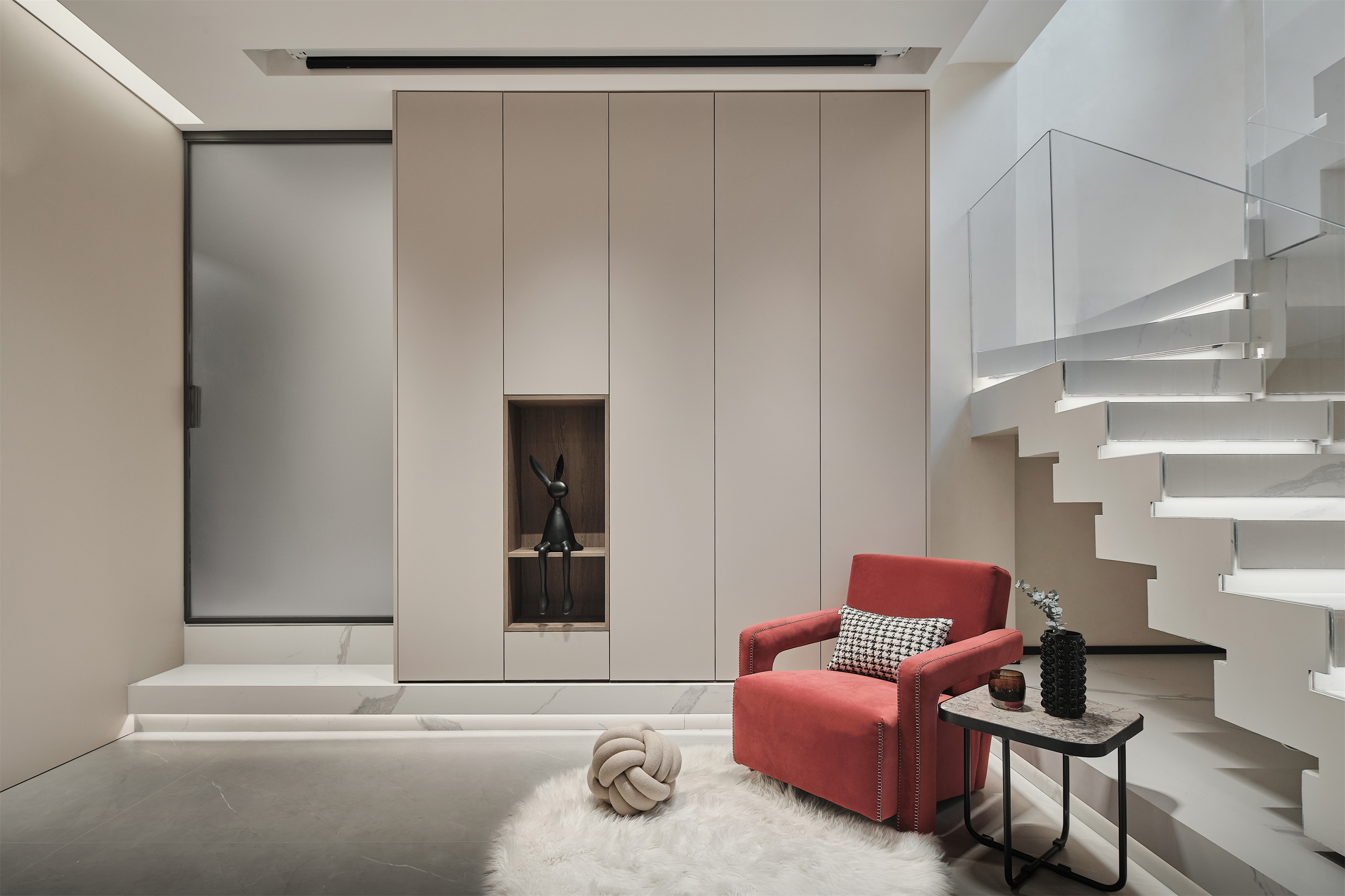 竖向空间中楼梯承载建筑上下层是功能,横向空间中则是艺术。三米层高的楼梯采用叠错玻璃扶手造型,丰富视觉的同时在负一层空间中更为通透;