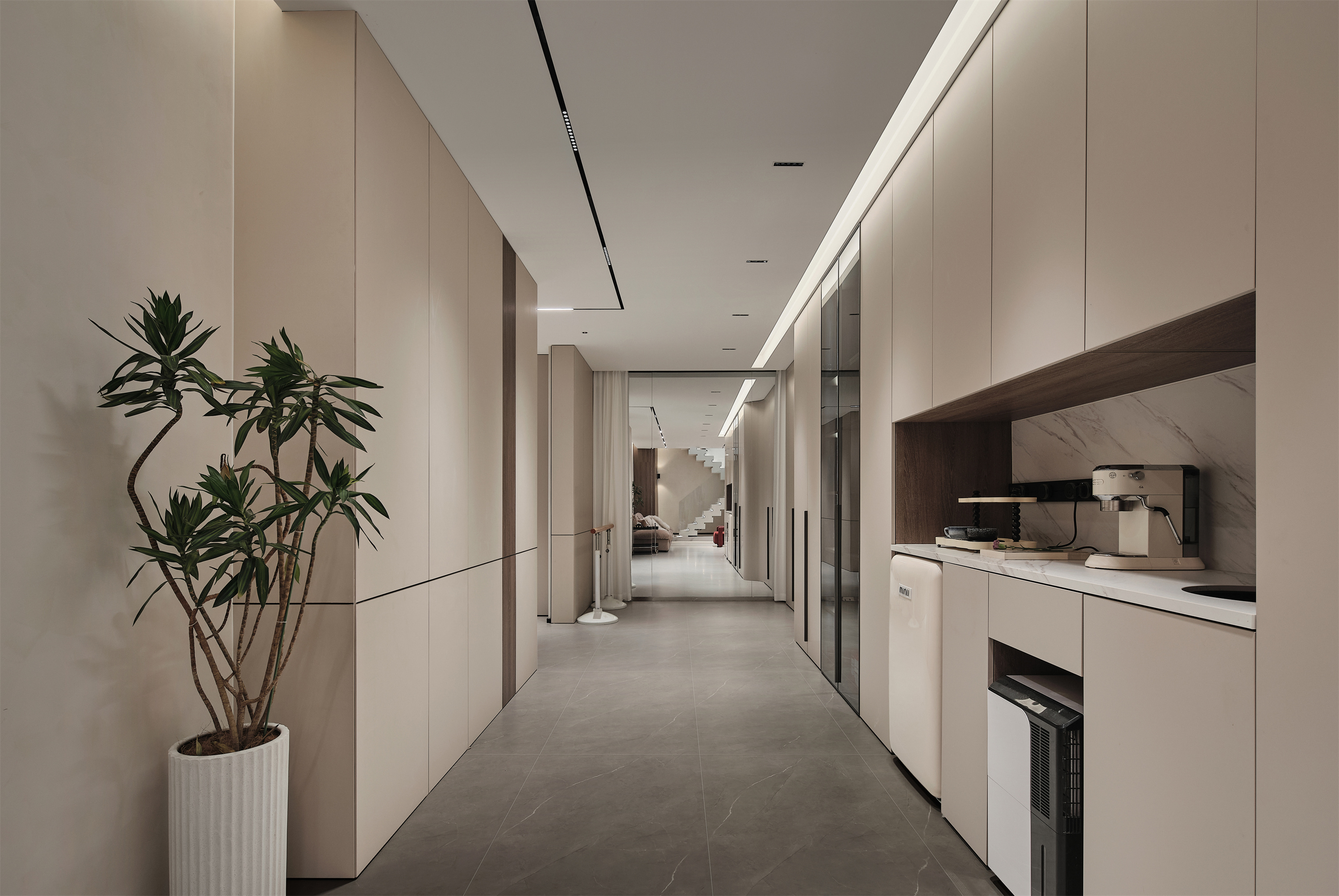 将原楼梯处设计为休闲厅的茶水台,结合整面暗柜,满足居家收纳;