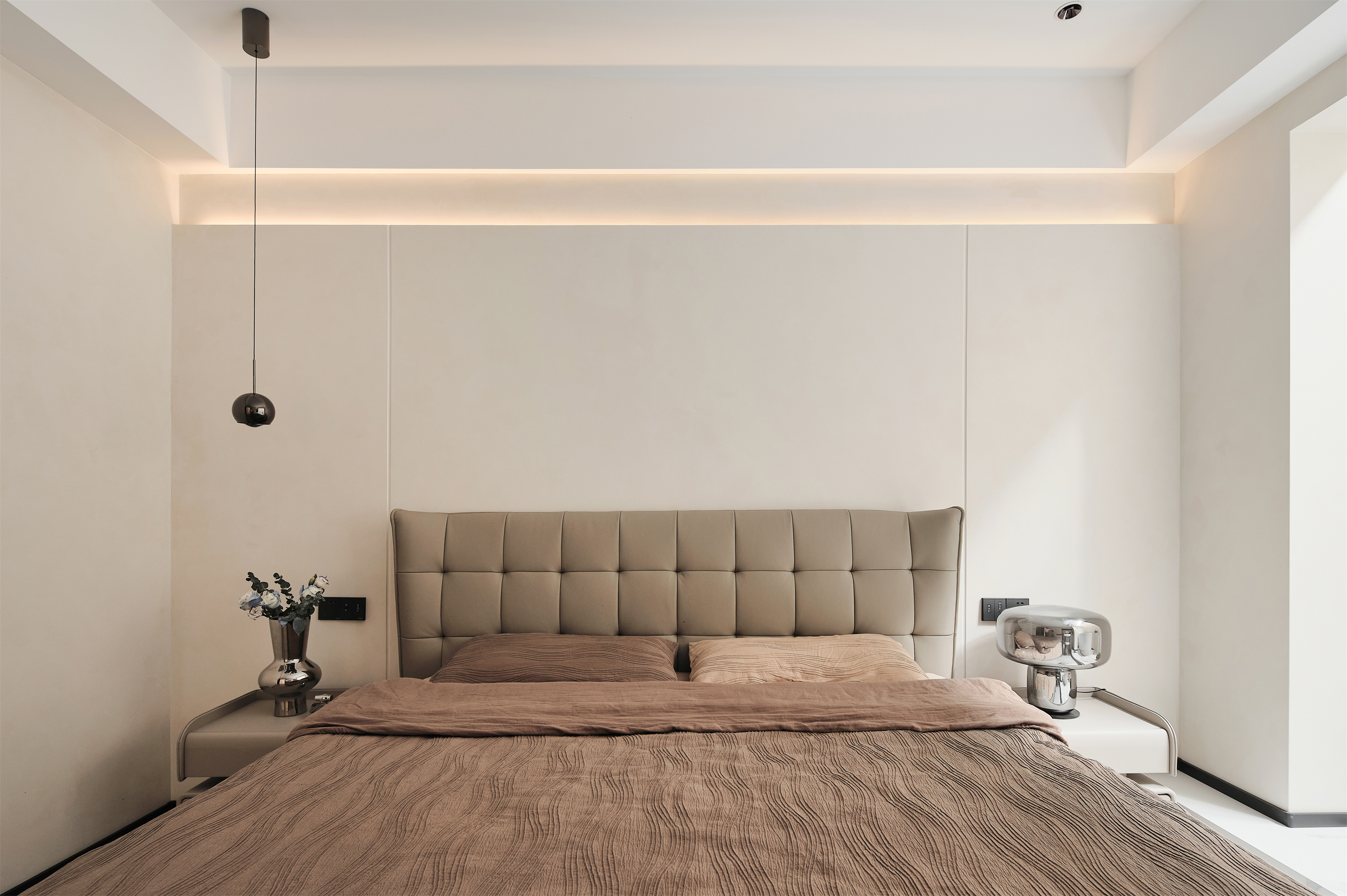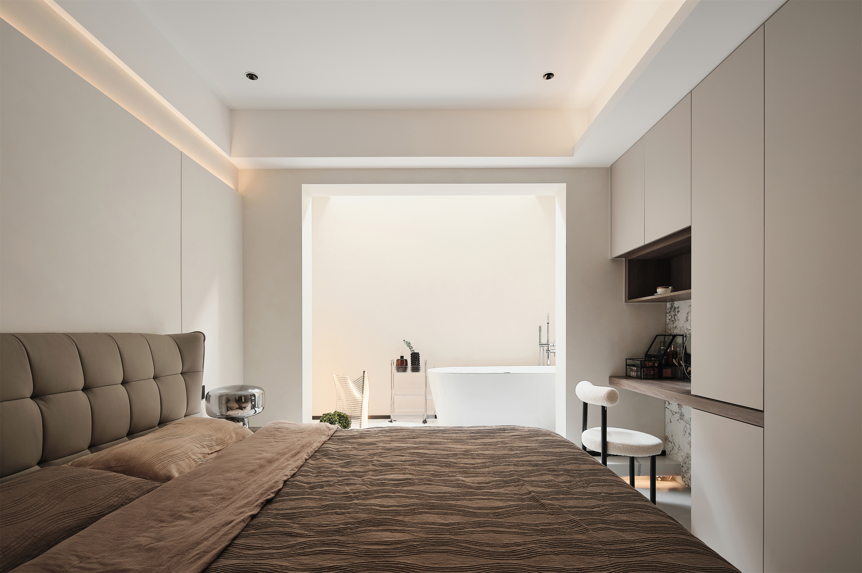 南边天井阳台边设置卧室,整体区域抬高,增加氛围灯光,隐藏口袋玻璃吊轨移门,可开可合,提升居住舒适度;