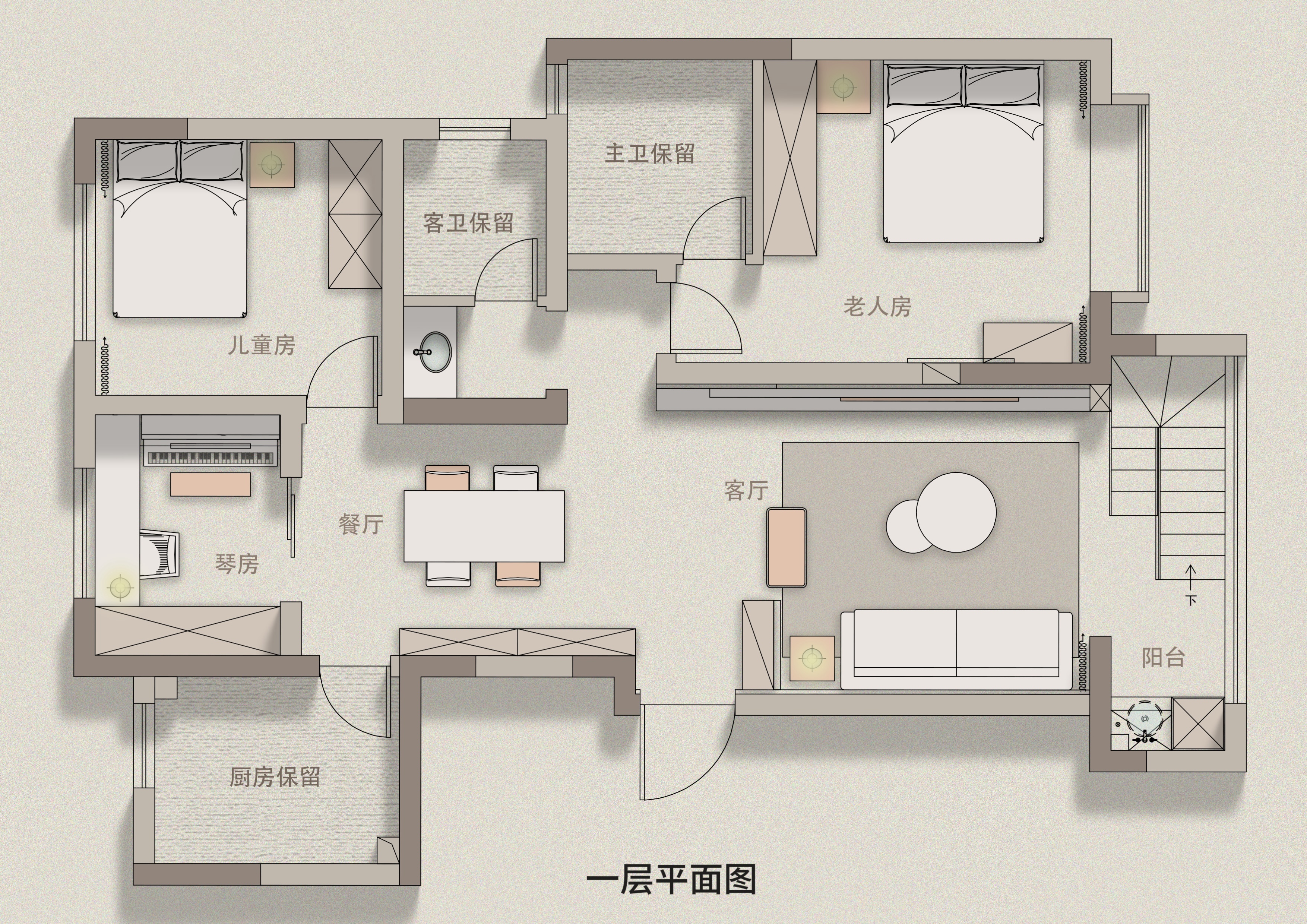 碍于一层精装修布局地暖问题,将楼梯改造至南边阳台,不仅优化了客厅空间布局,同时南边阳光引入负一层,也改善了负一层空间的狭长问题。 -