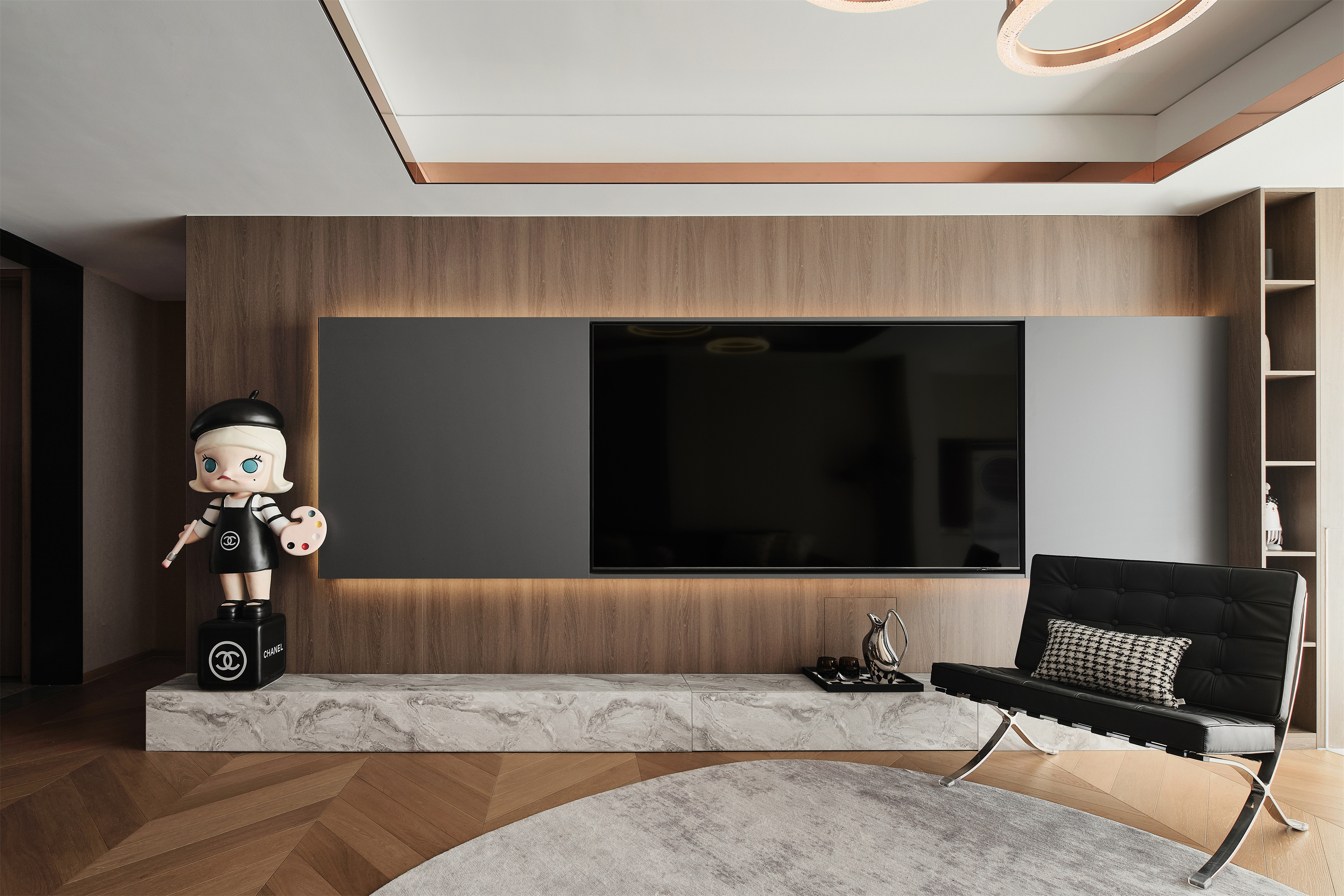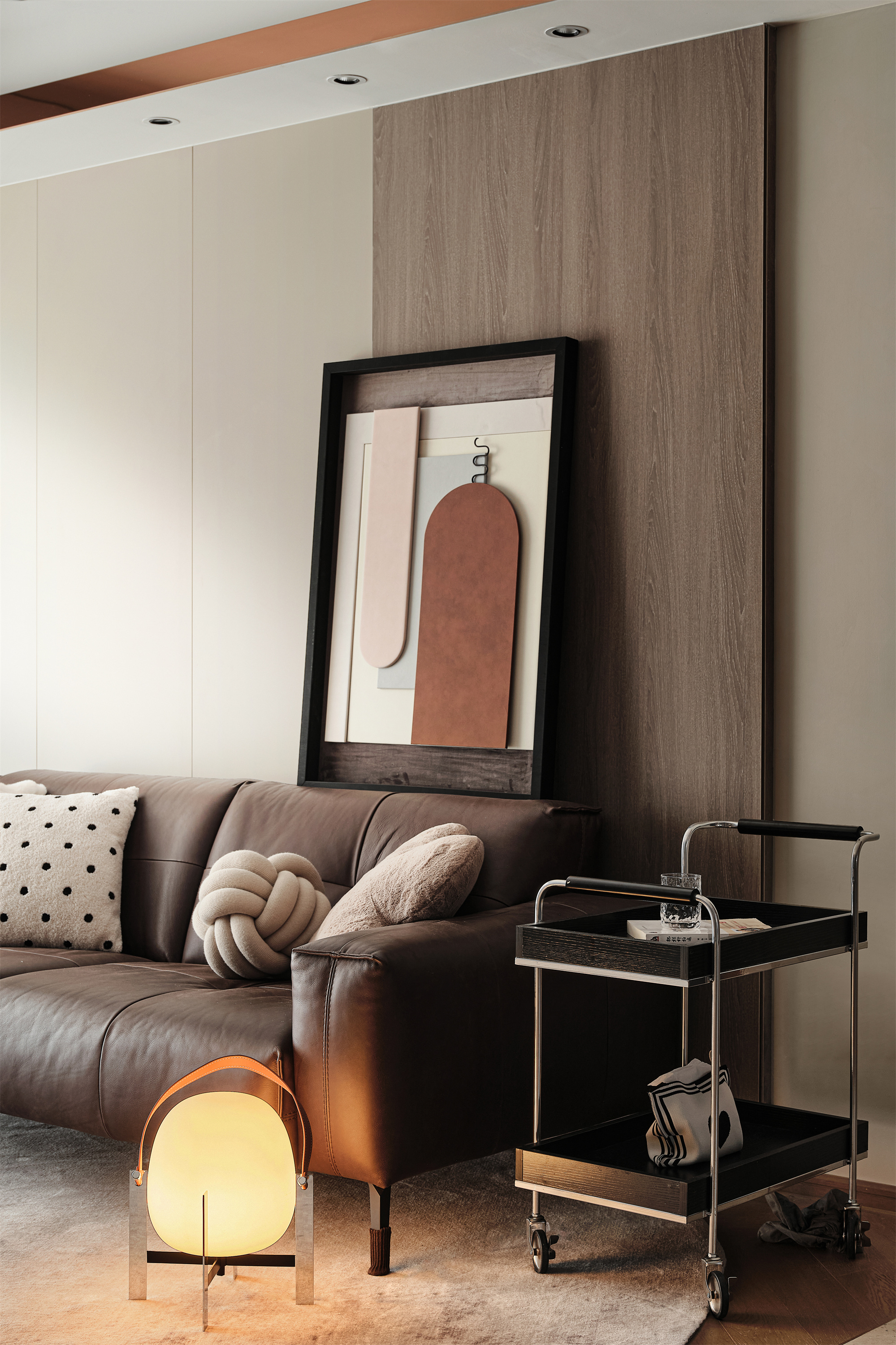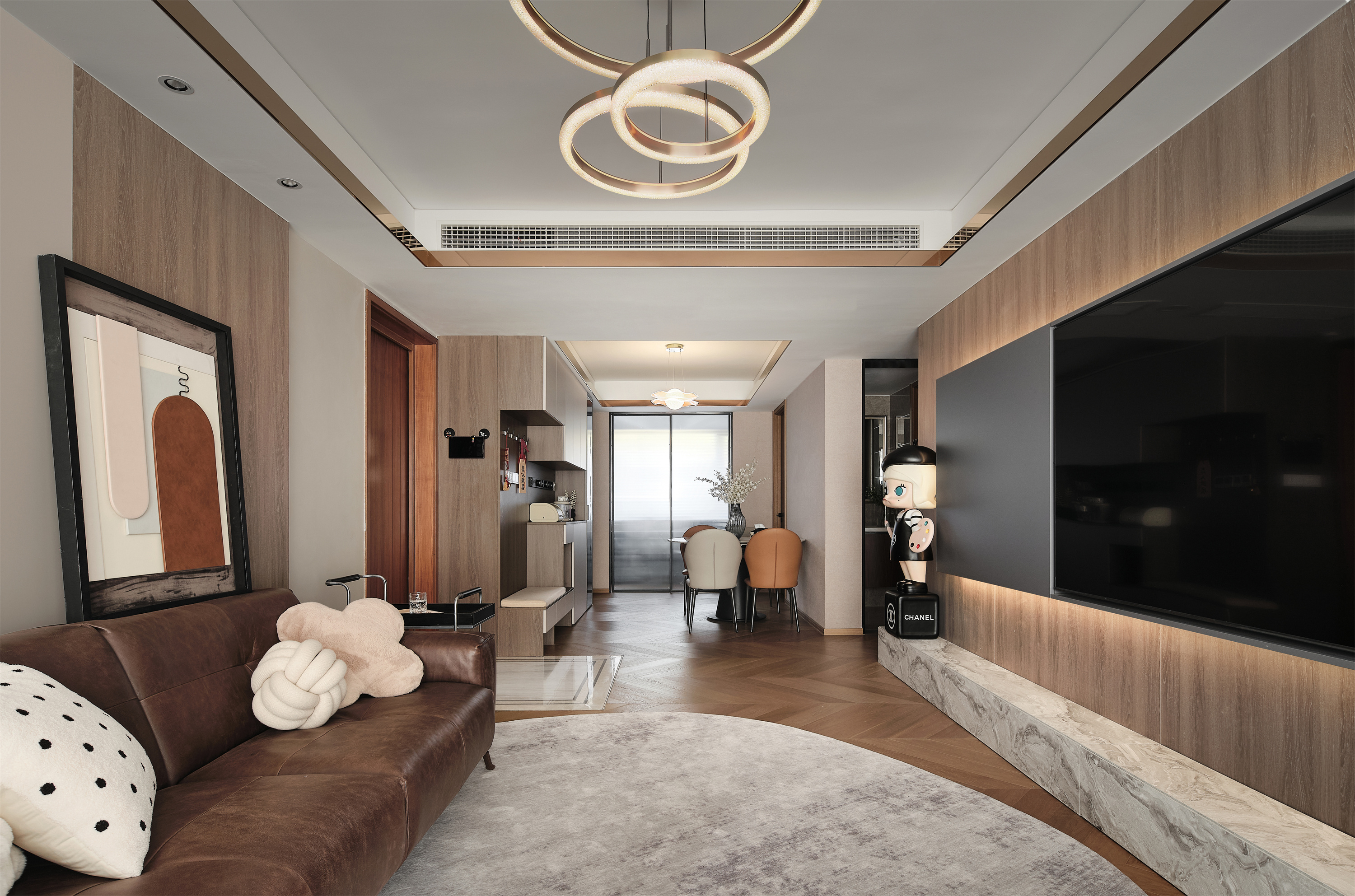 沙发背景局部木饰面呼应电视背景,几何块面的现代画,调和空间色调;