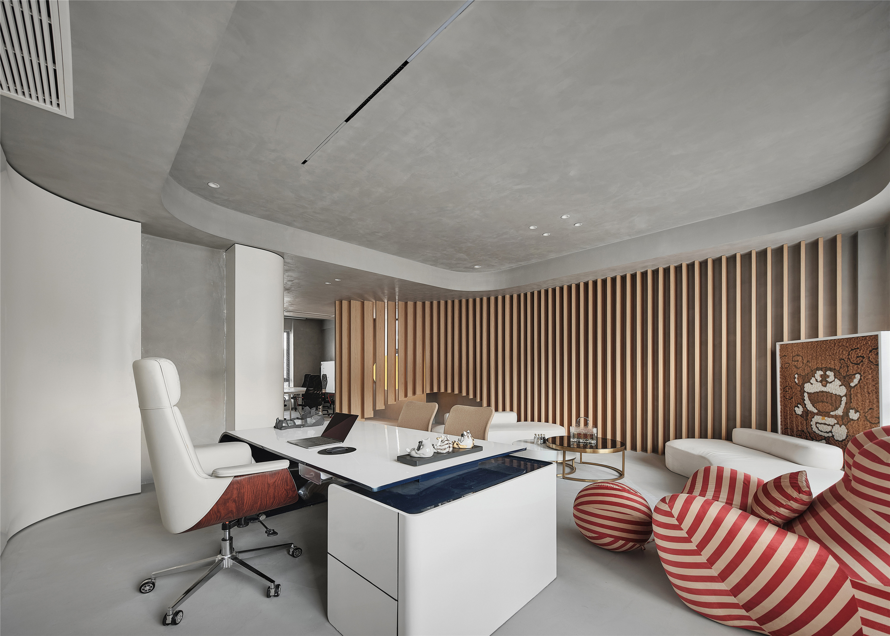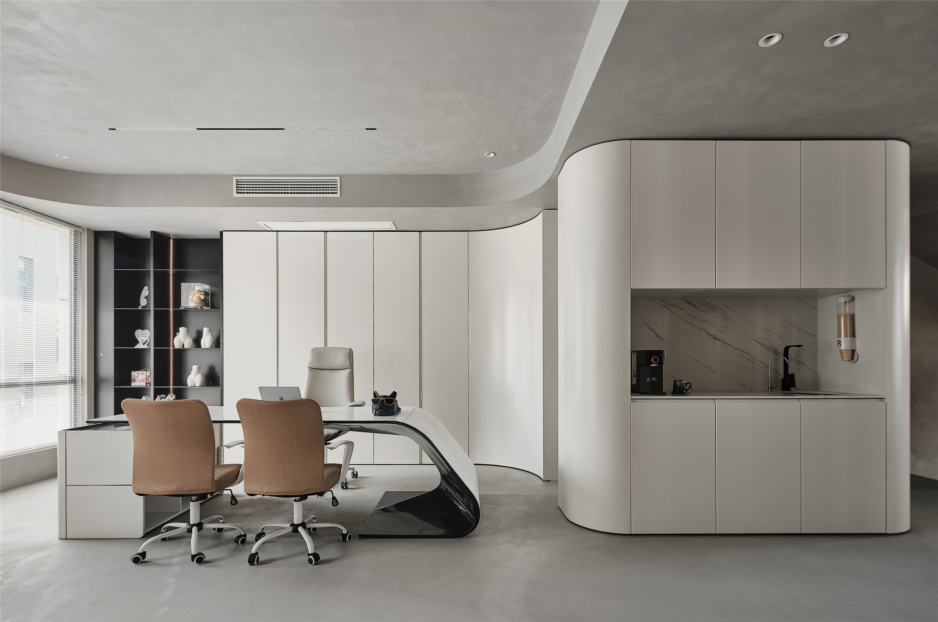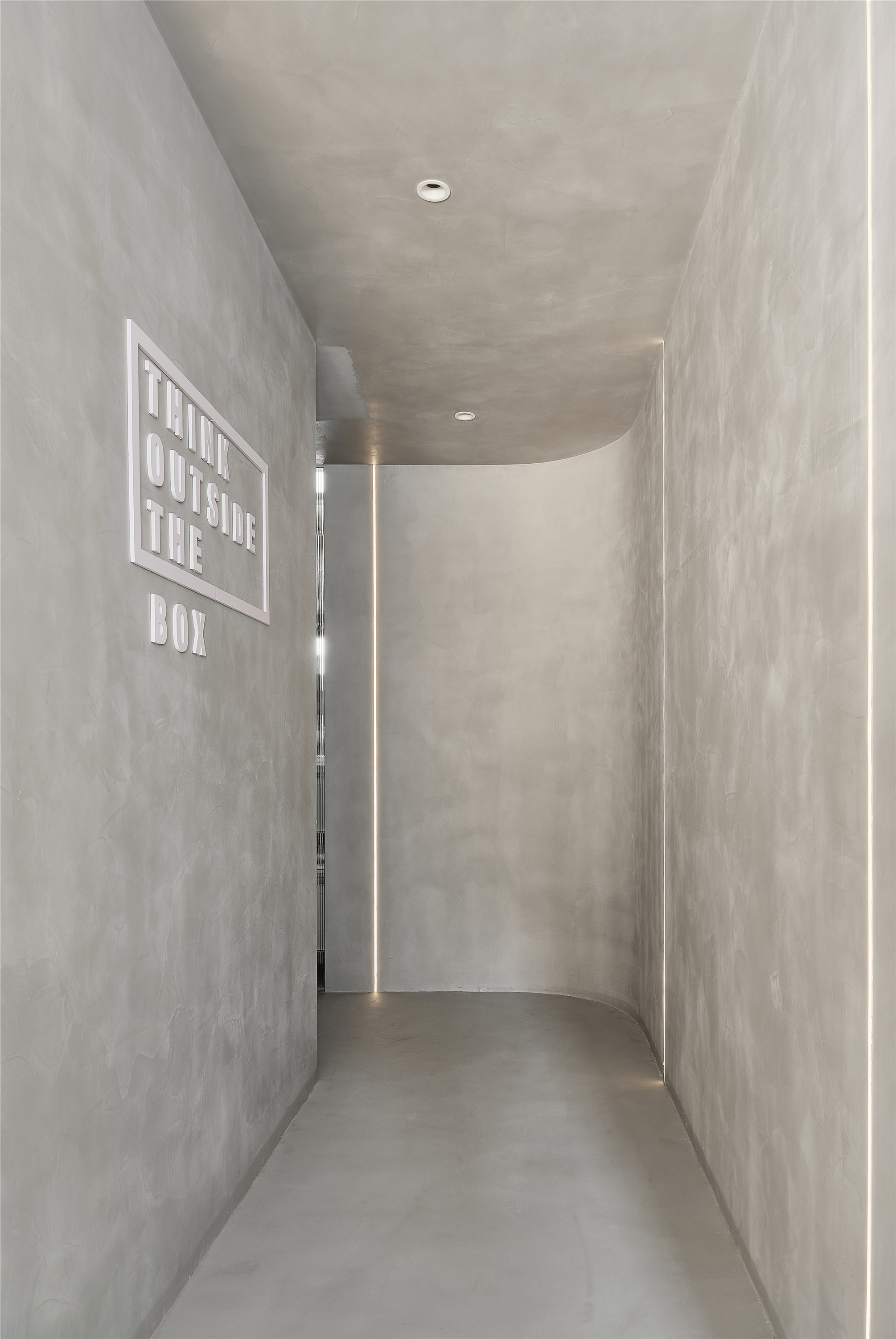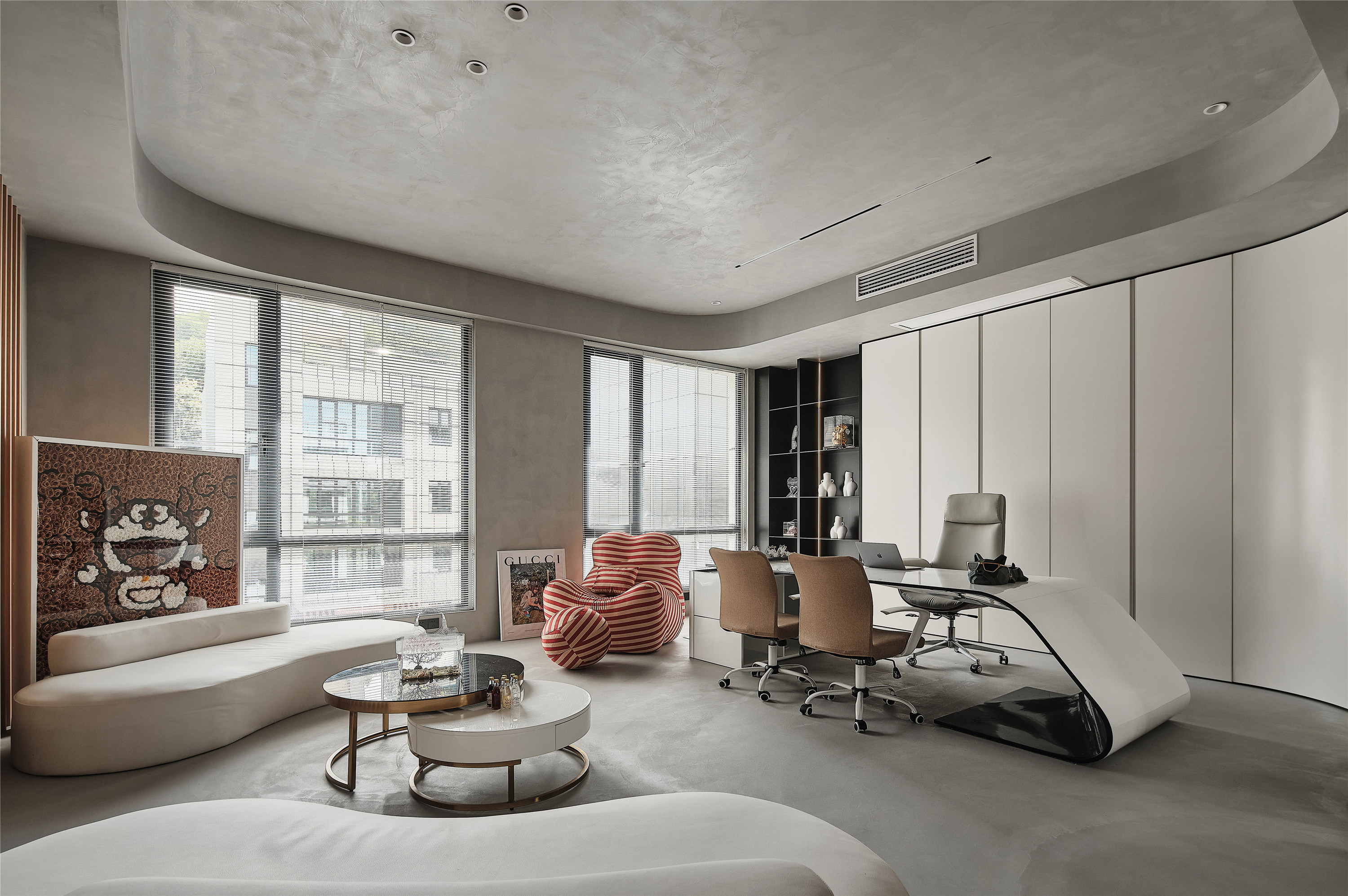 采用灰色调为主,弧形曲面和结构的造型打造艺术气息,打造符合年轻团队的创意空间。