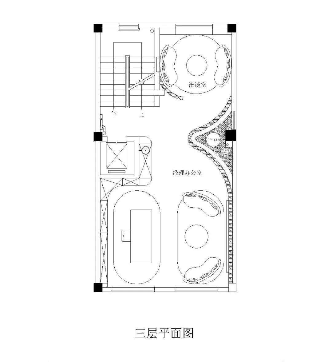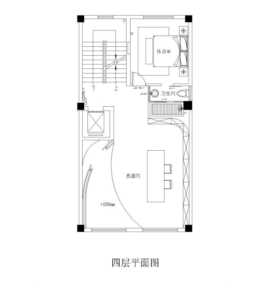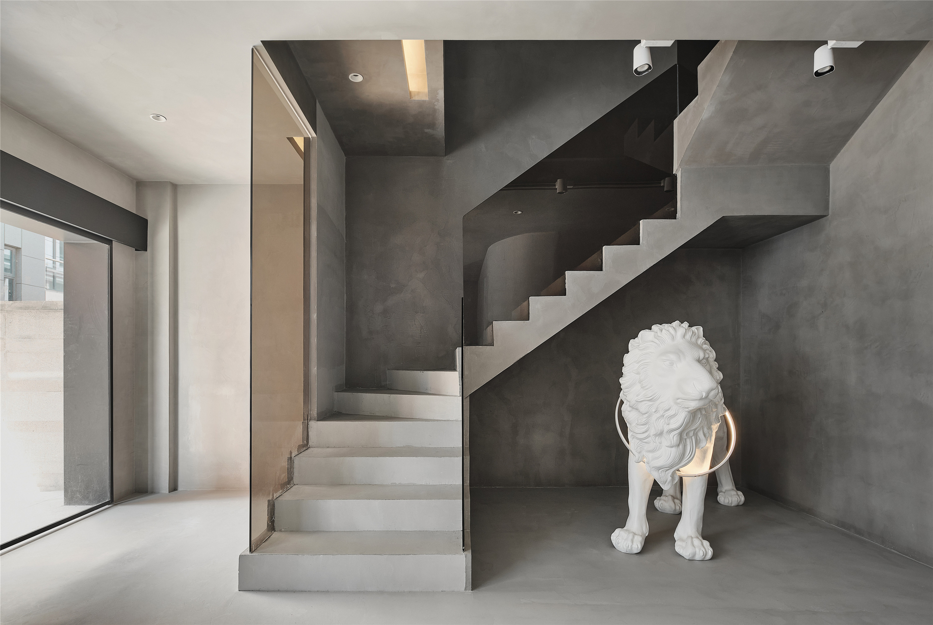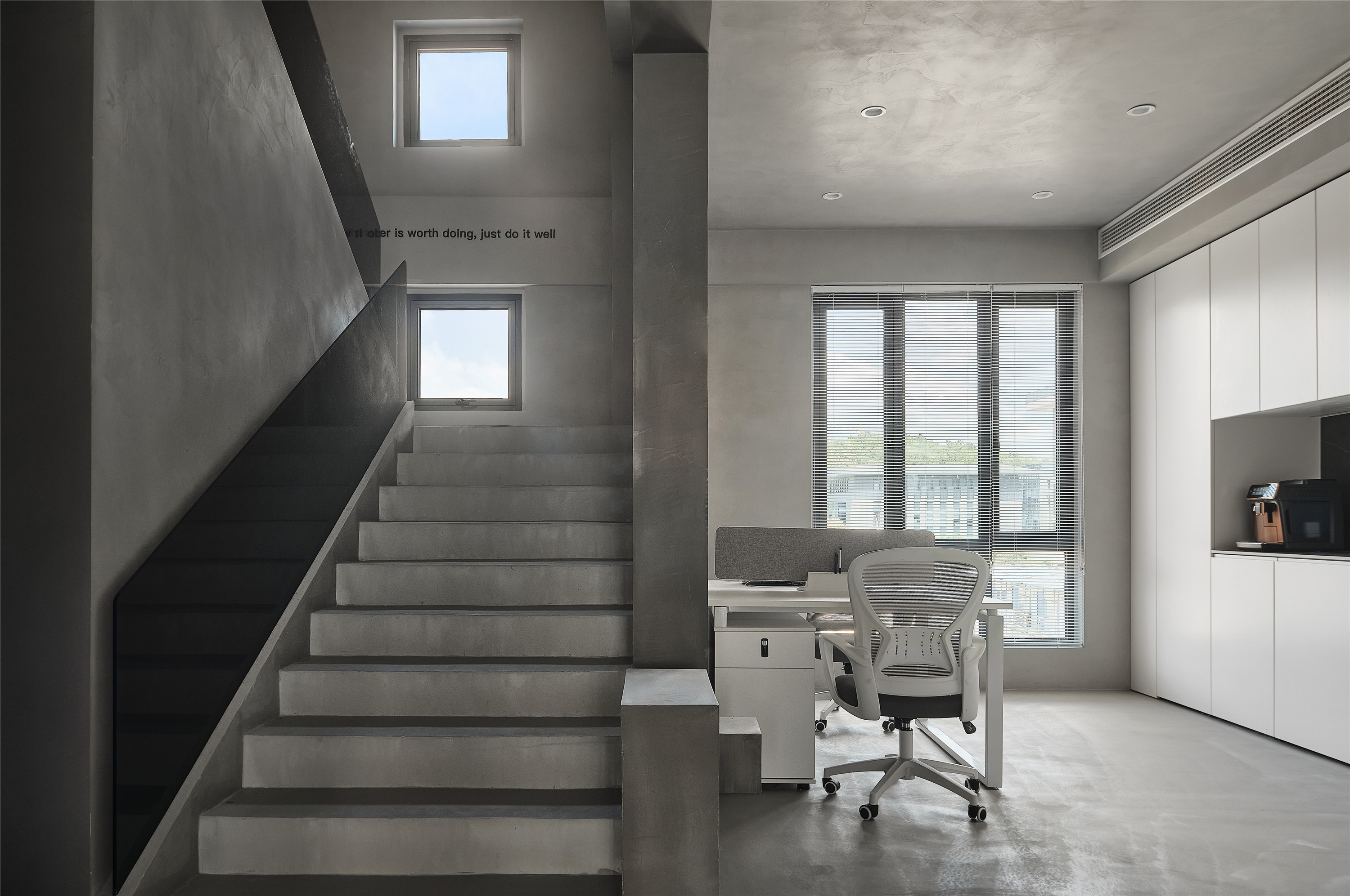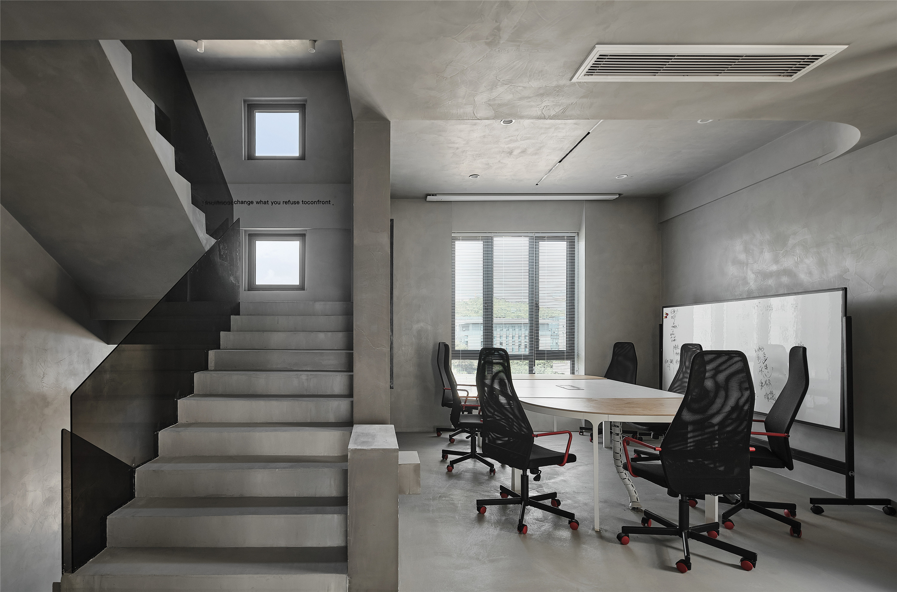 这是一个具前瞻性理念的新媒体创意办公室,整个建筑空间约300平米。设计师充分利用楼层进行分区,将开放办公区和经理办公室放在二三层,考虑到噪音将直播间放在四层,休闲区域则放在了最顶层,空间明晰而不失丰富。