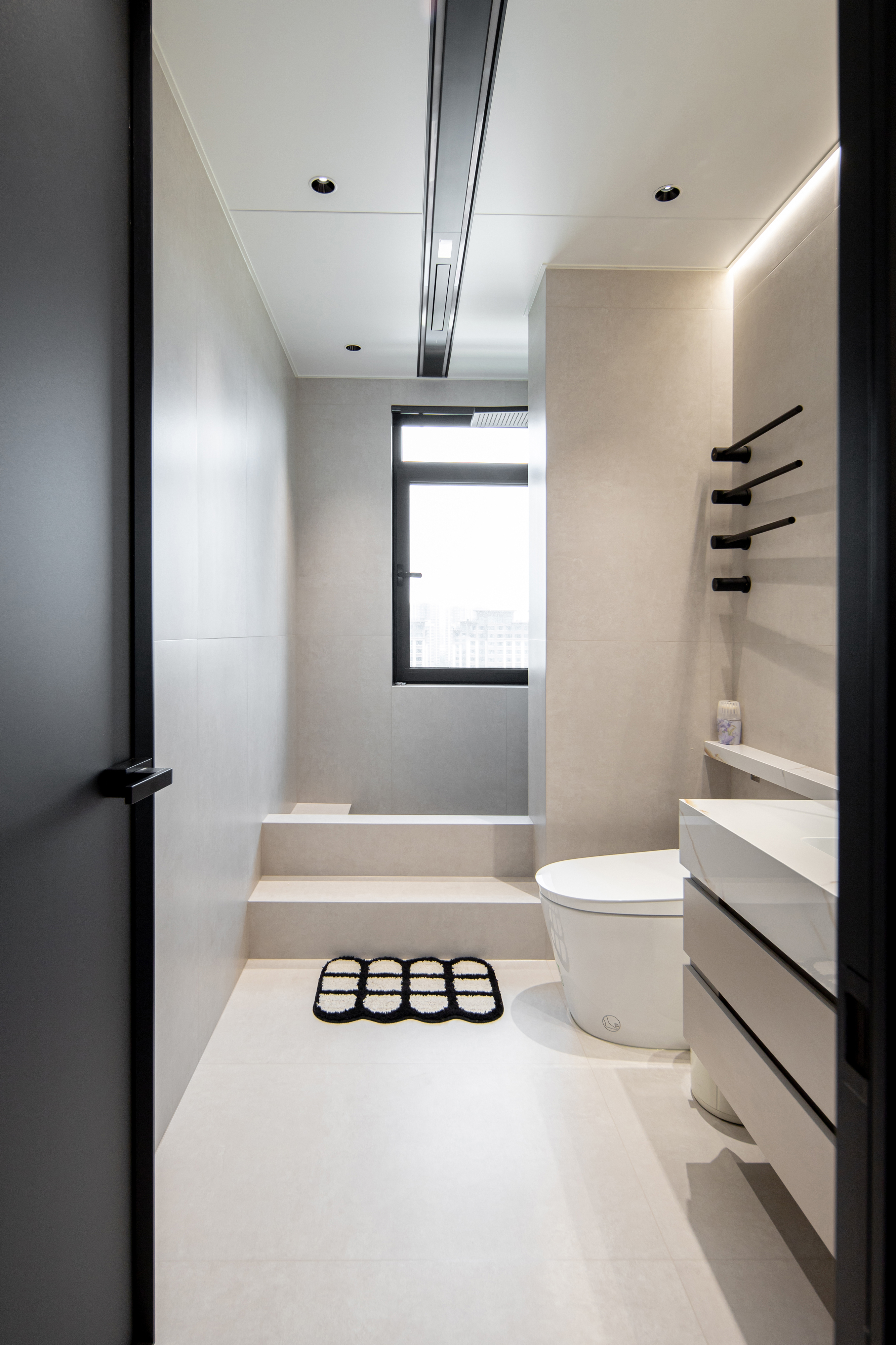设计选材:选用大地砖通铺,使视觉拉伸,同时也是为了摒弃,有可能不环保的木地板。
