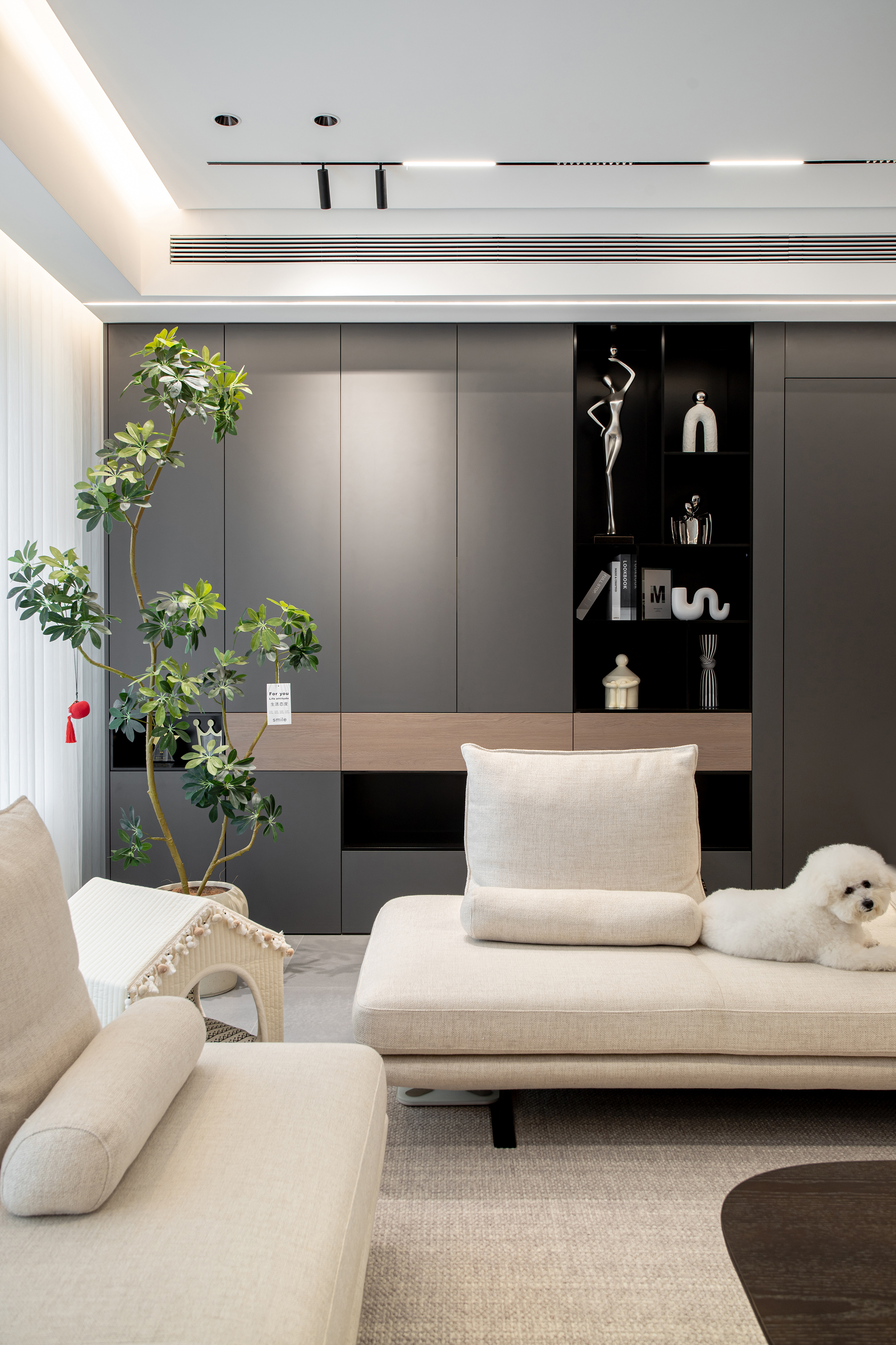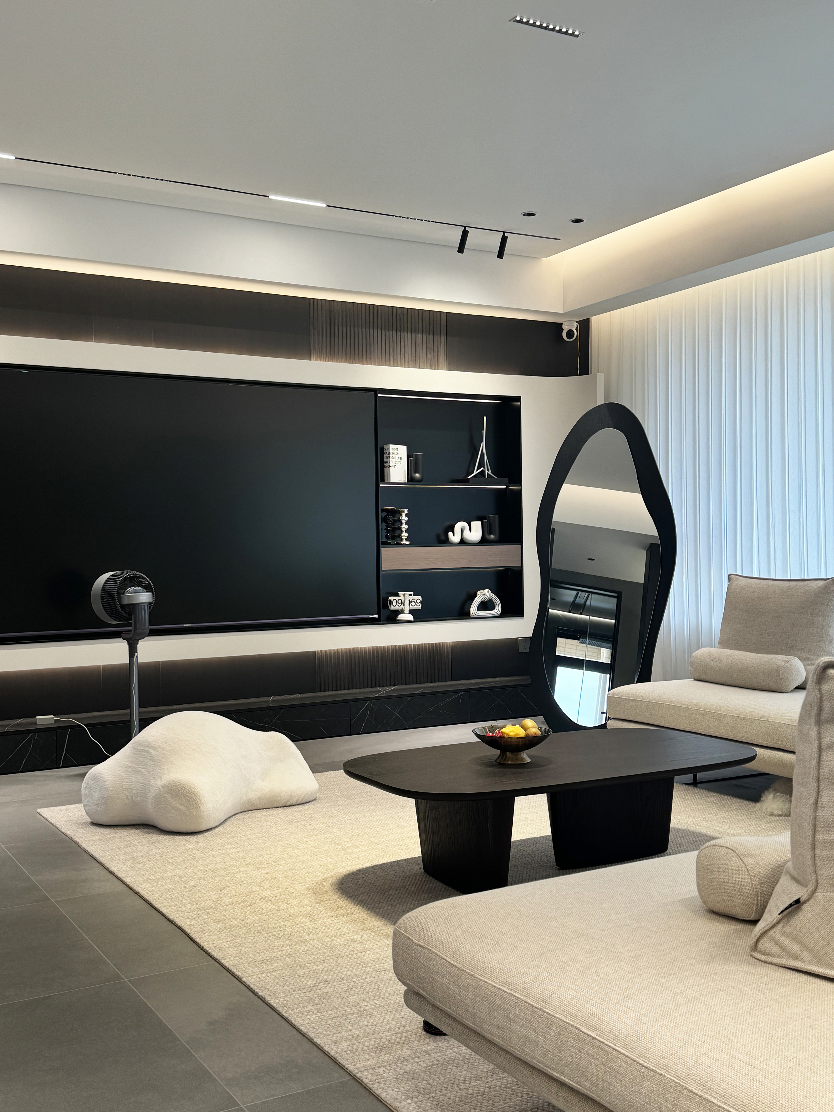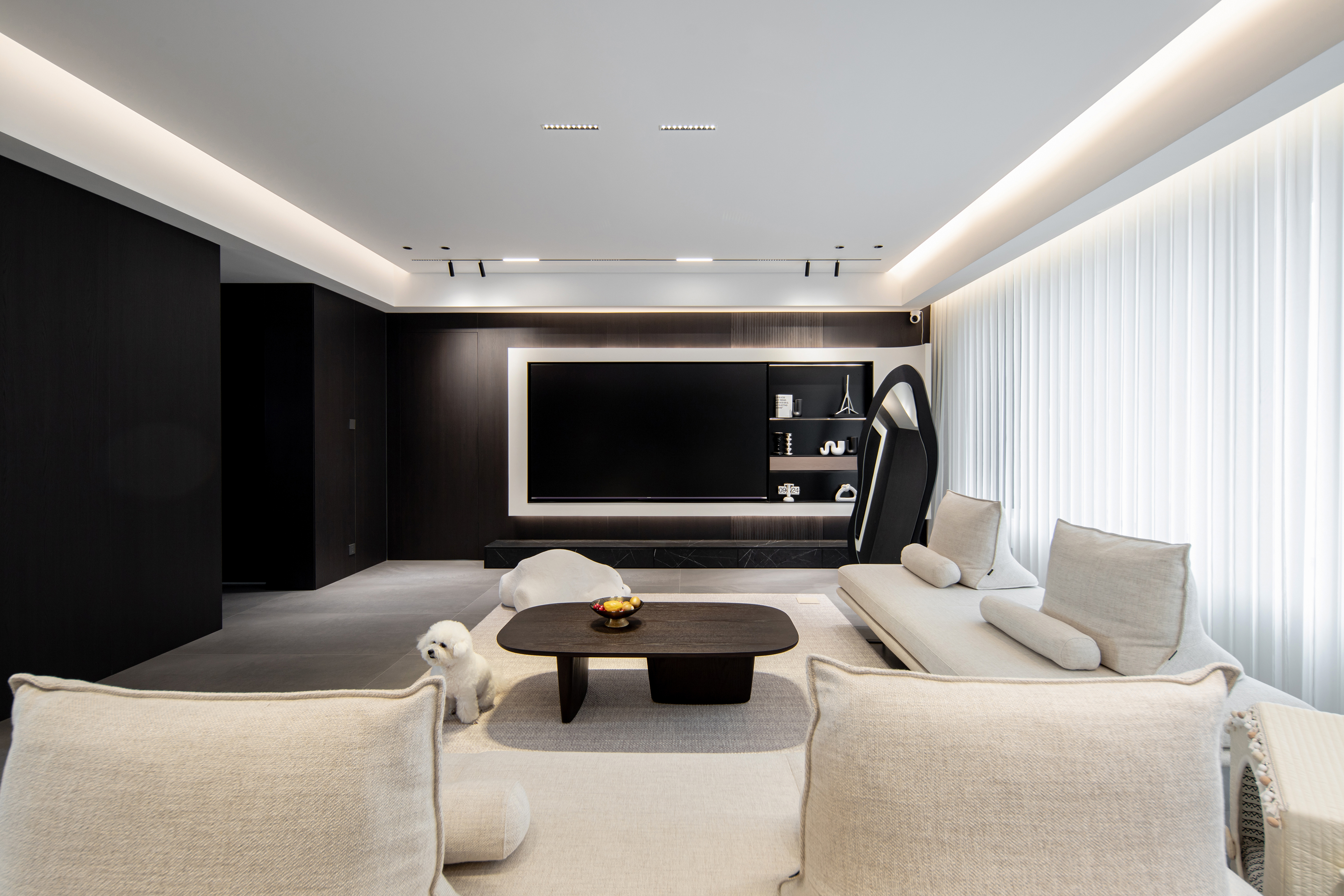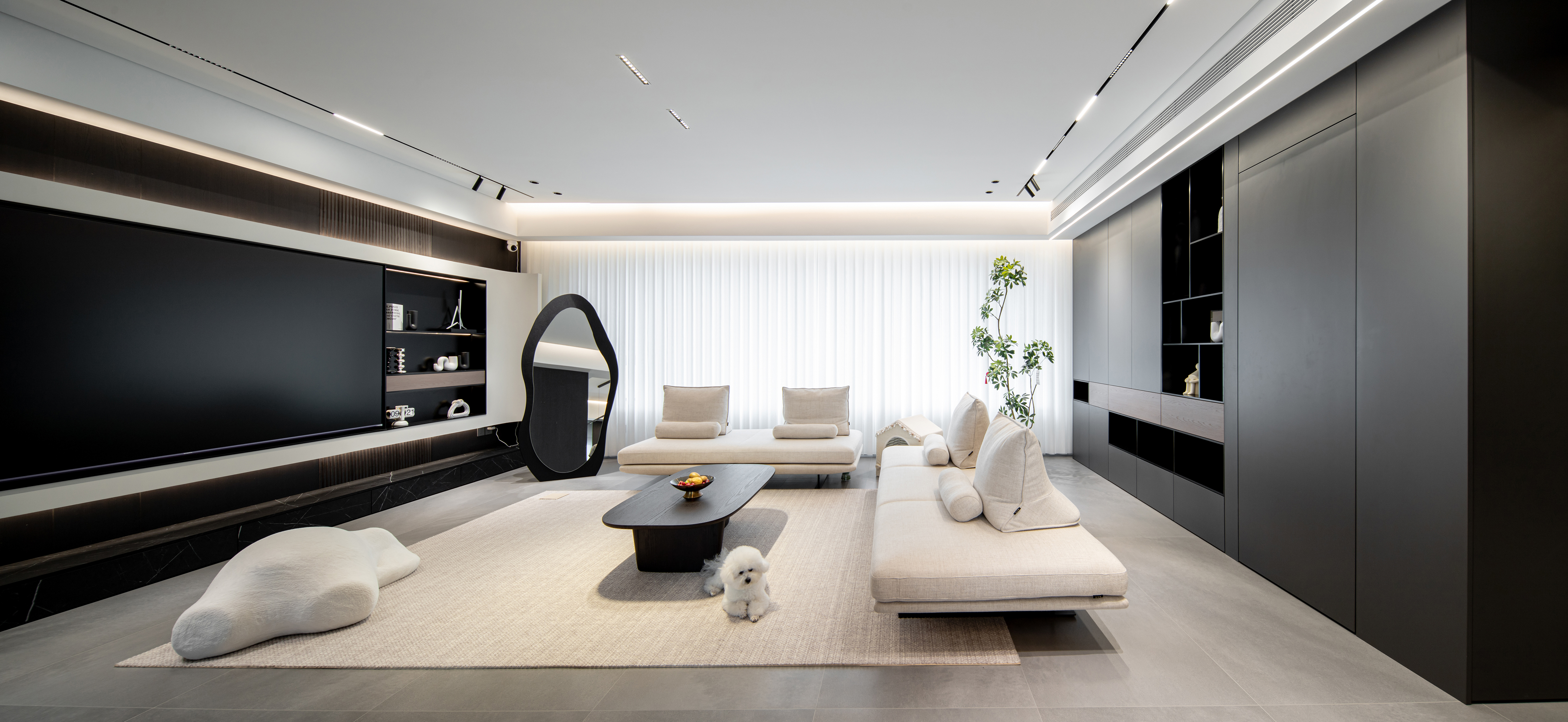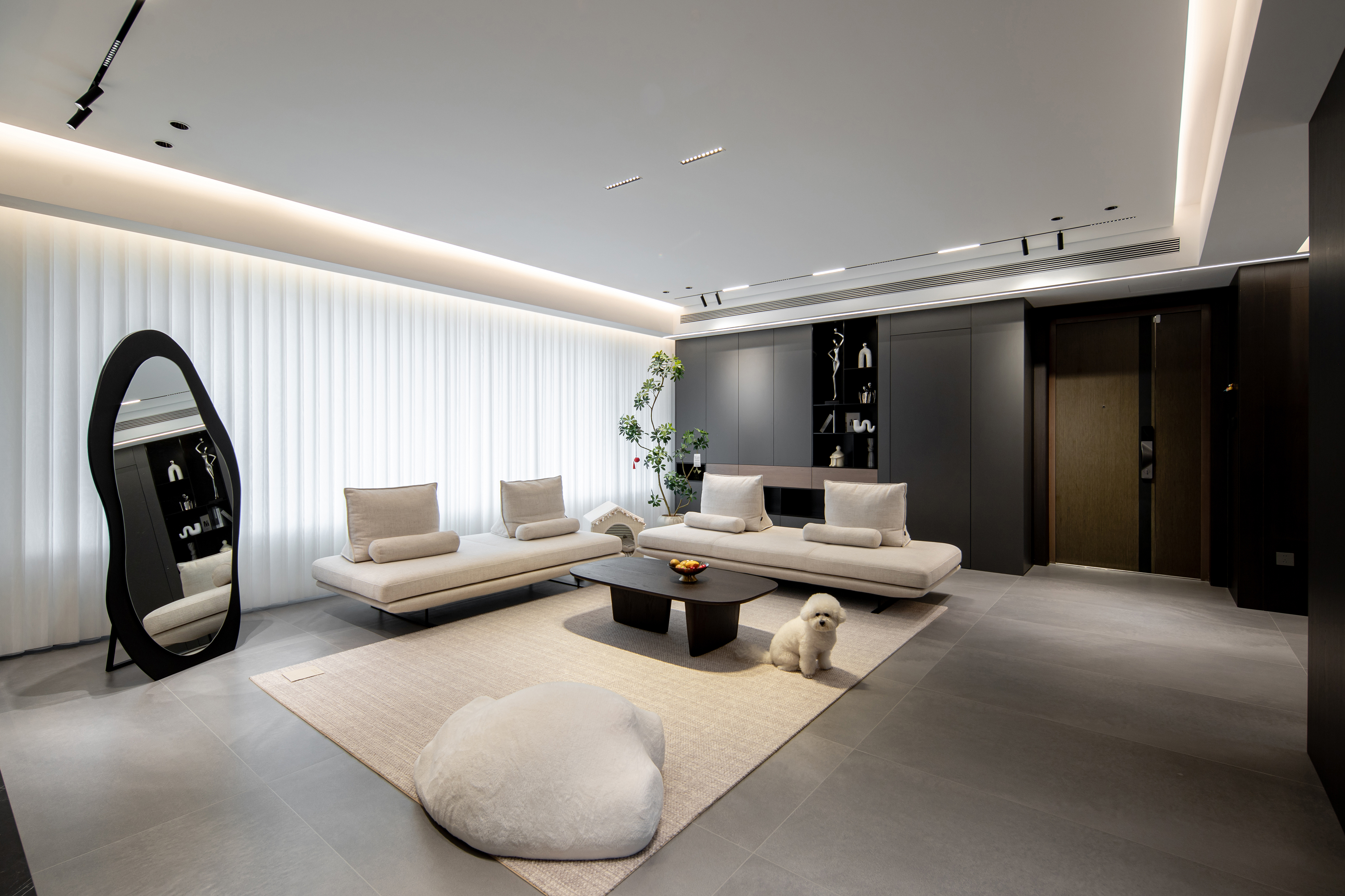 空间意境:整体以黑白灰为主,更贴切现代极简风格。选择浅色沙发,使空间更透气,同时增加明暗对比层次,使空间更高级。局部采用宝格丽石材做点缀,使空间格调更进一步升华。