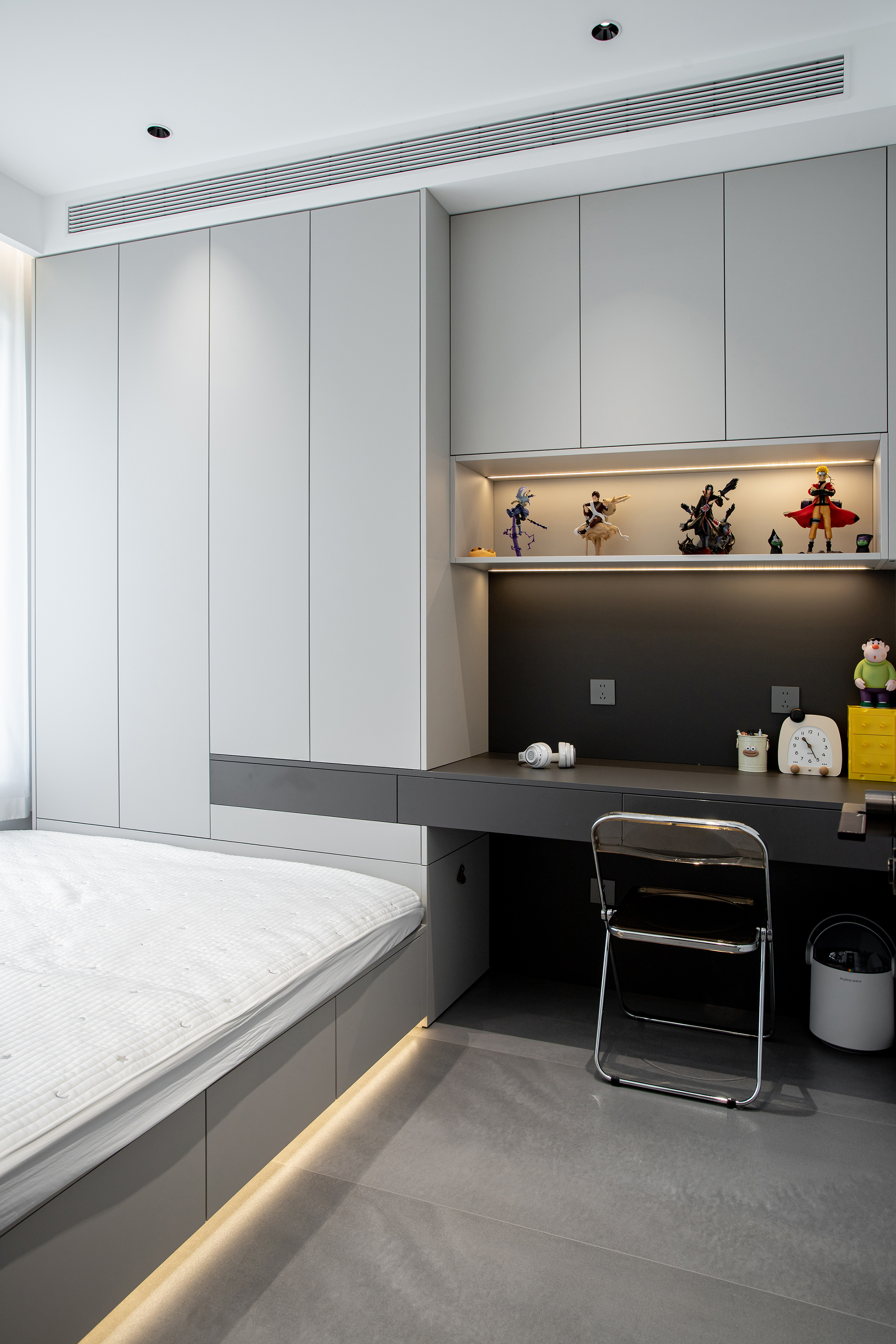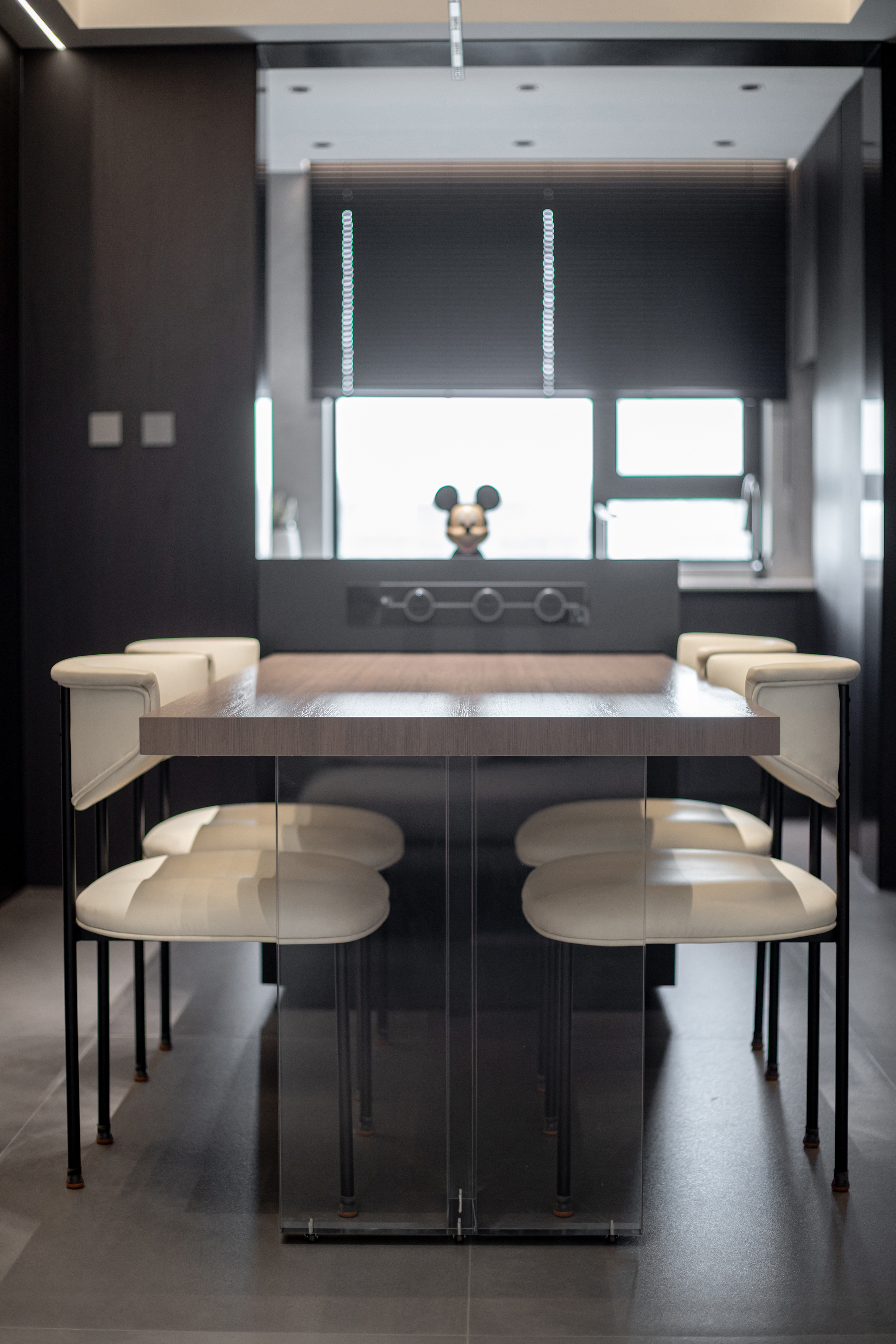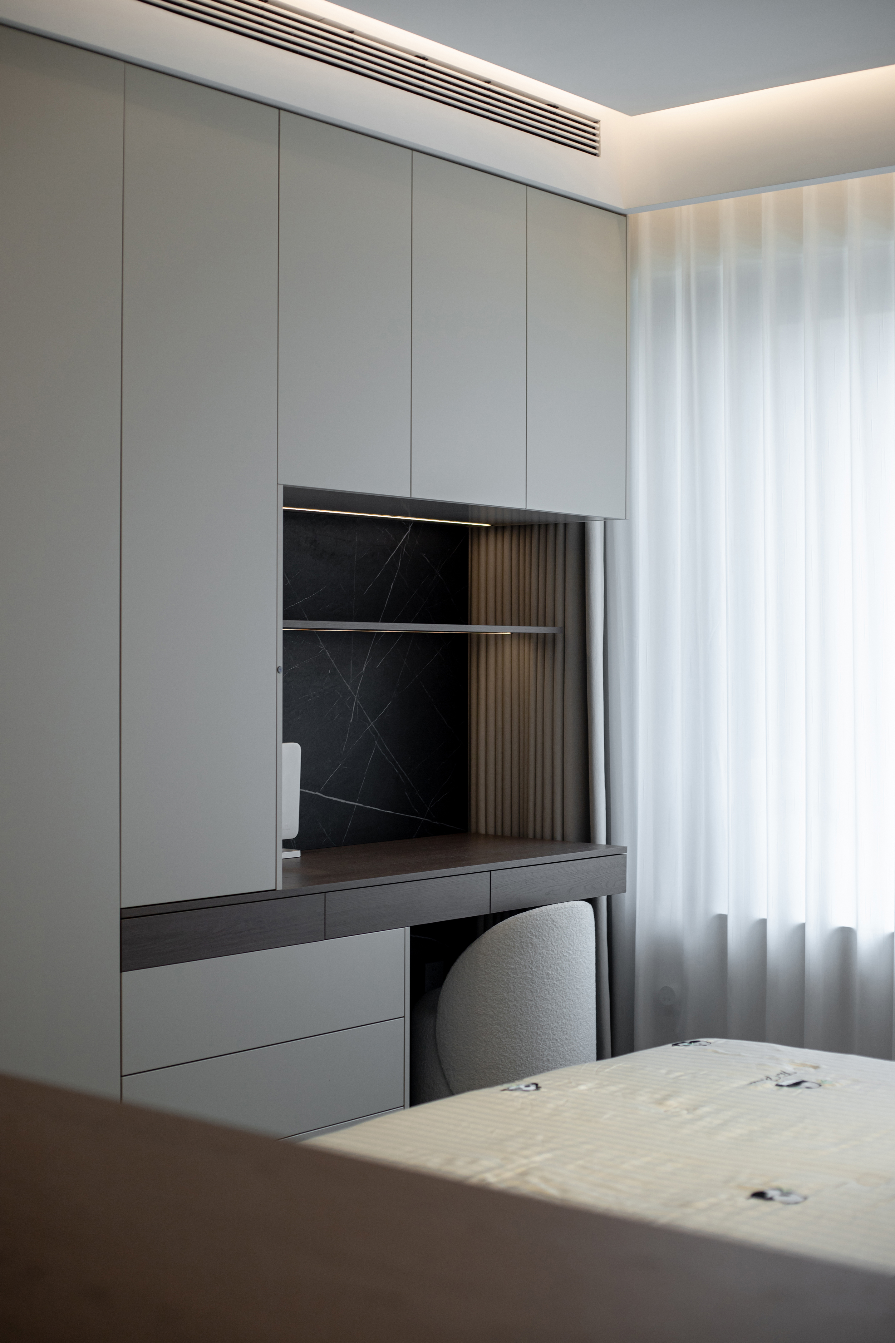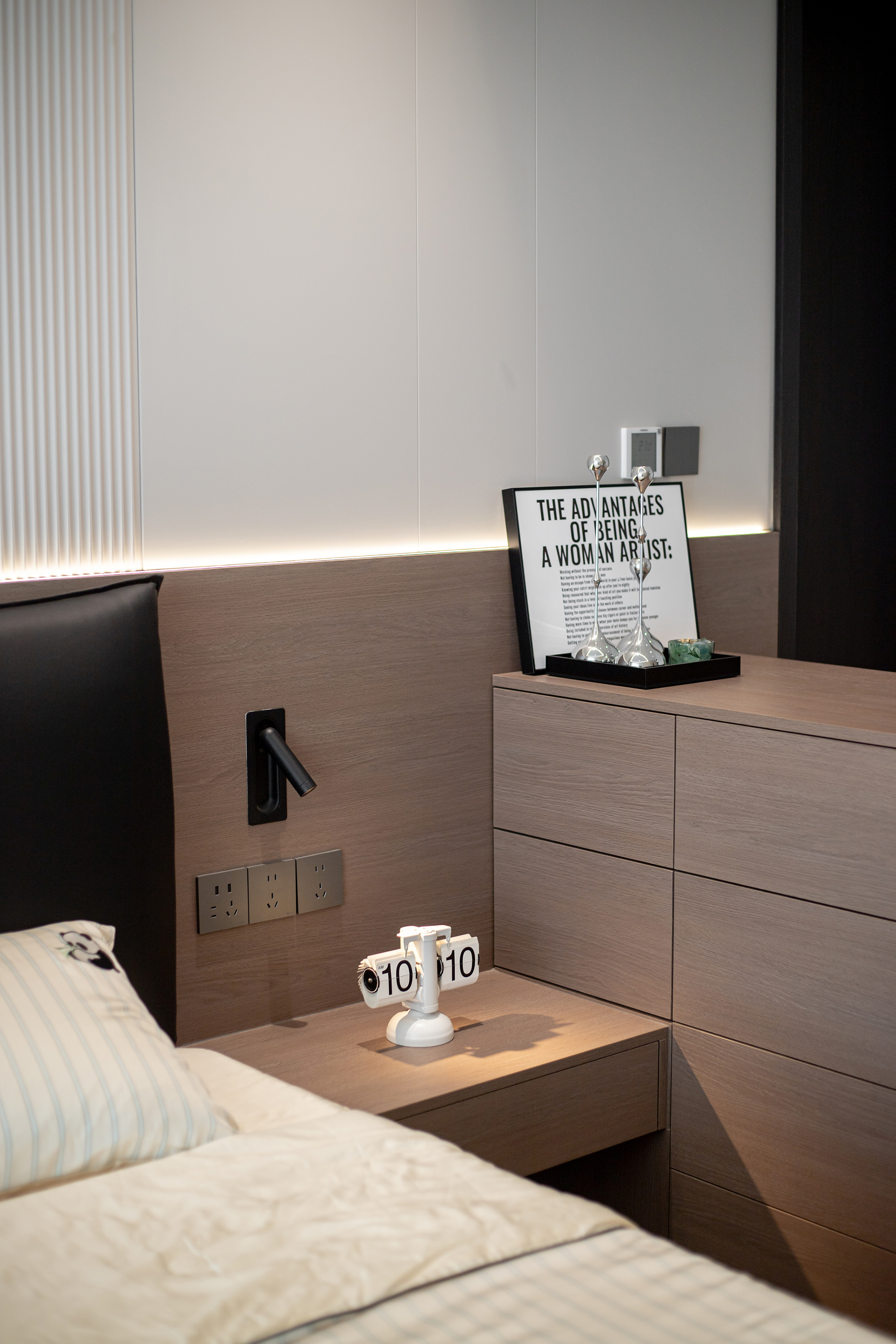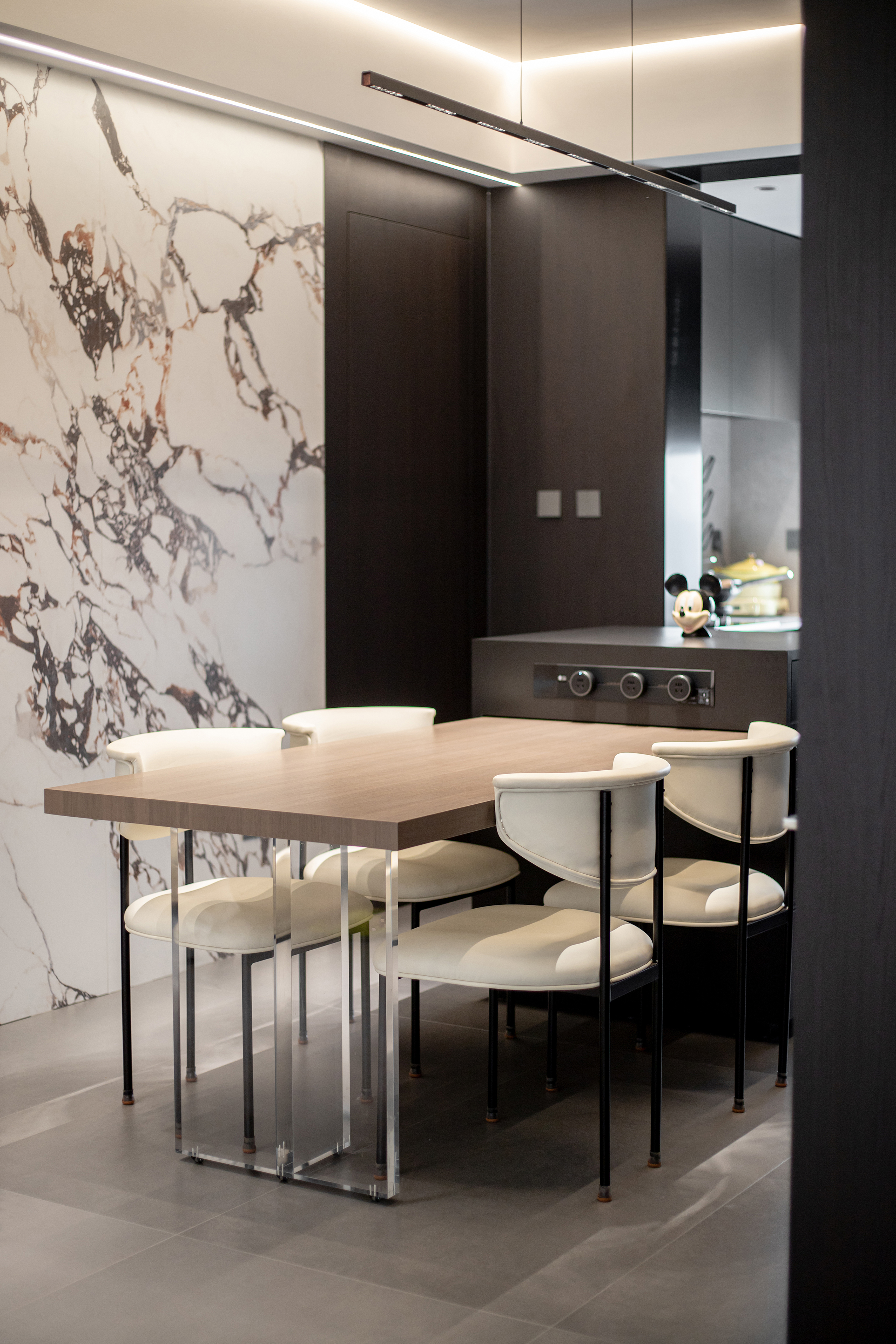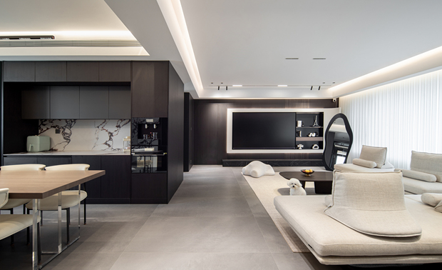 空间意境:整体以黑白灰为主,更贴切现代极简风格。选择浅色沙发,使空间更透气,同时增加明暗对比层次,使空间更高级。局部采用宝格丽石材做点缀,使空间格调更进一步升华。