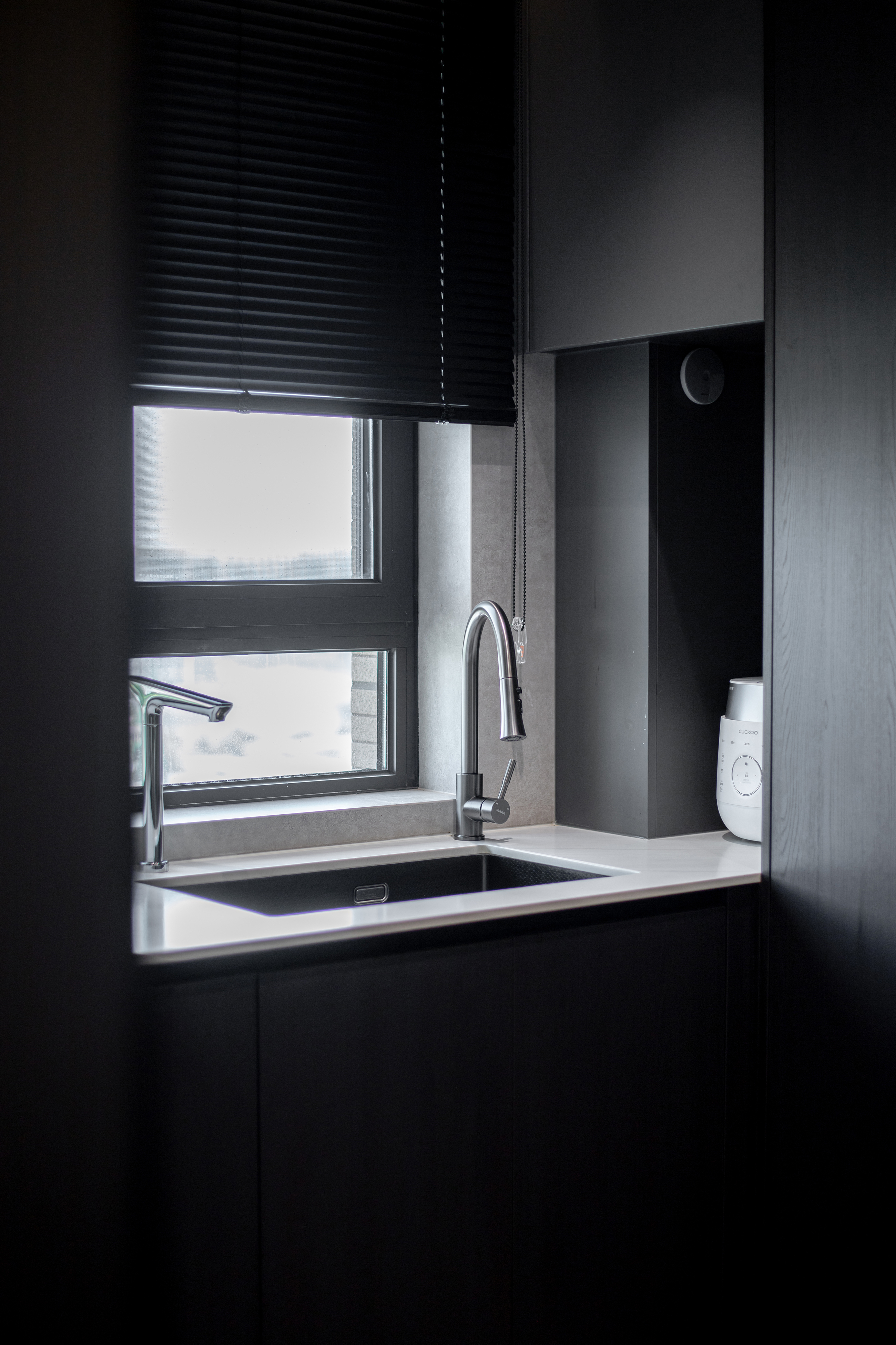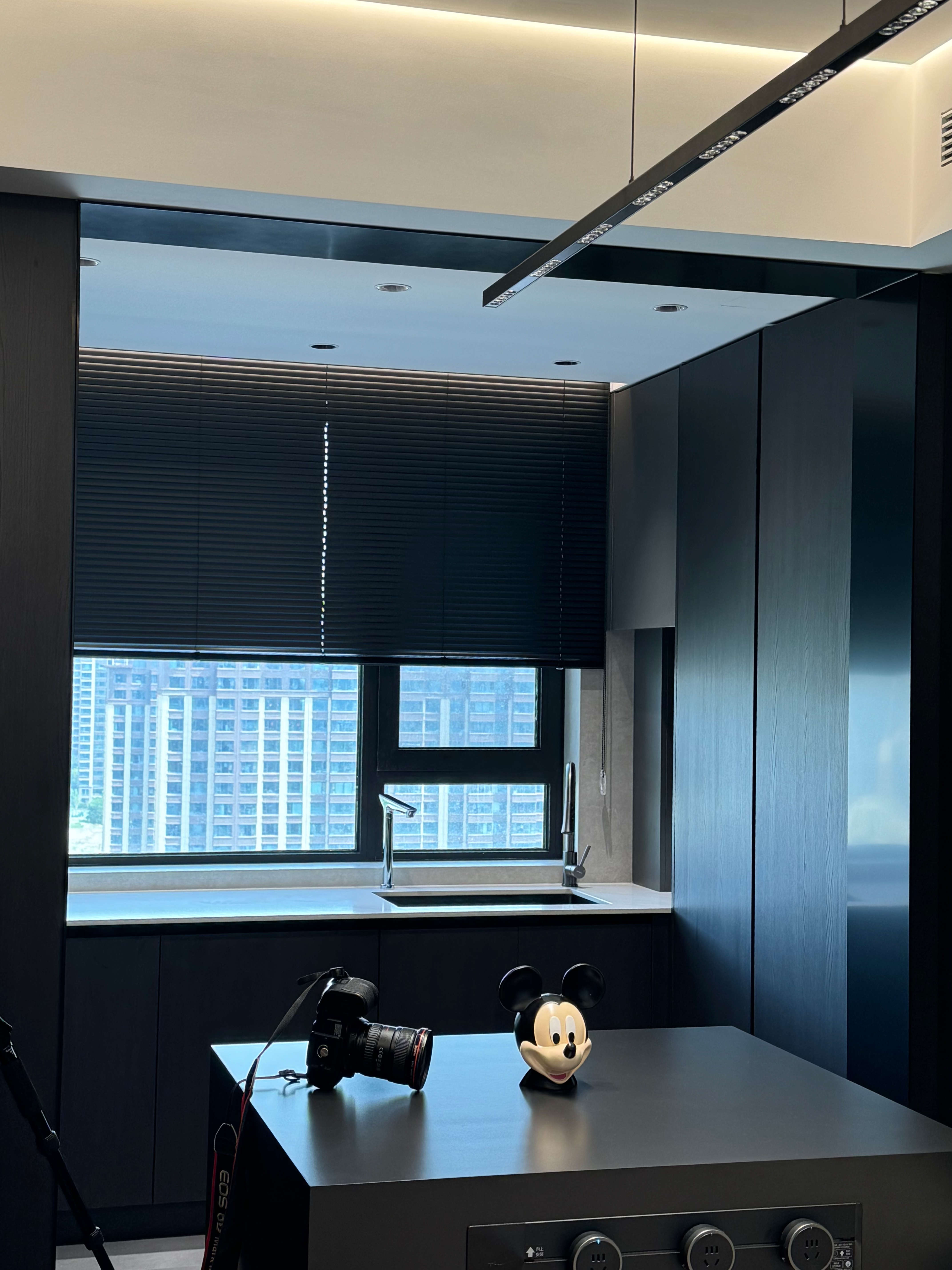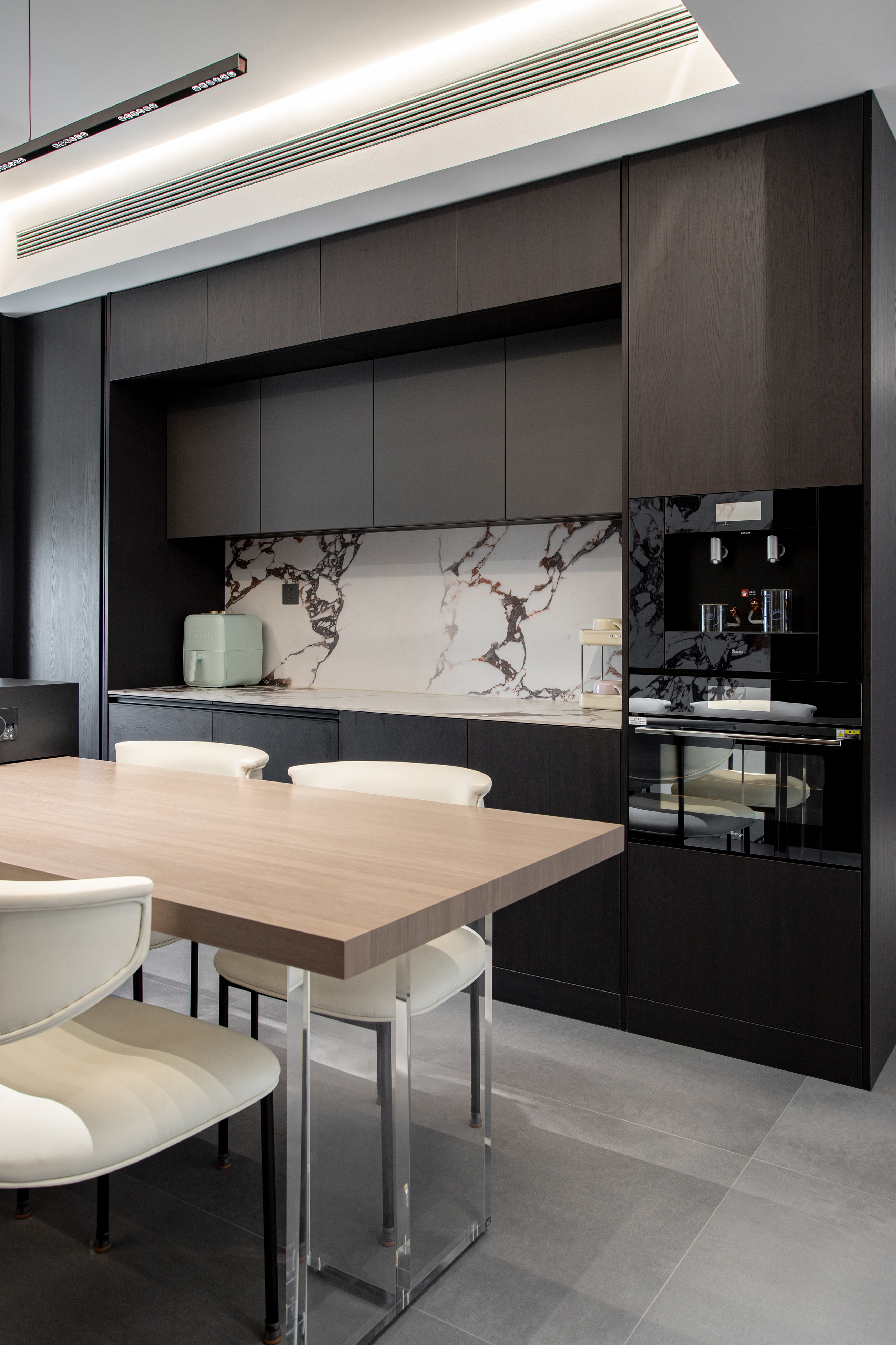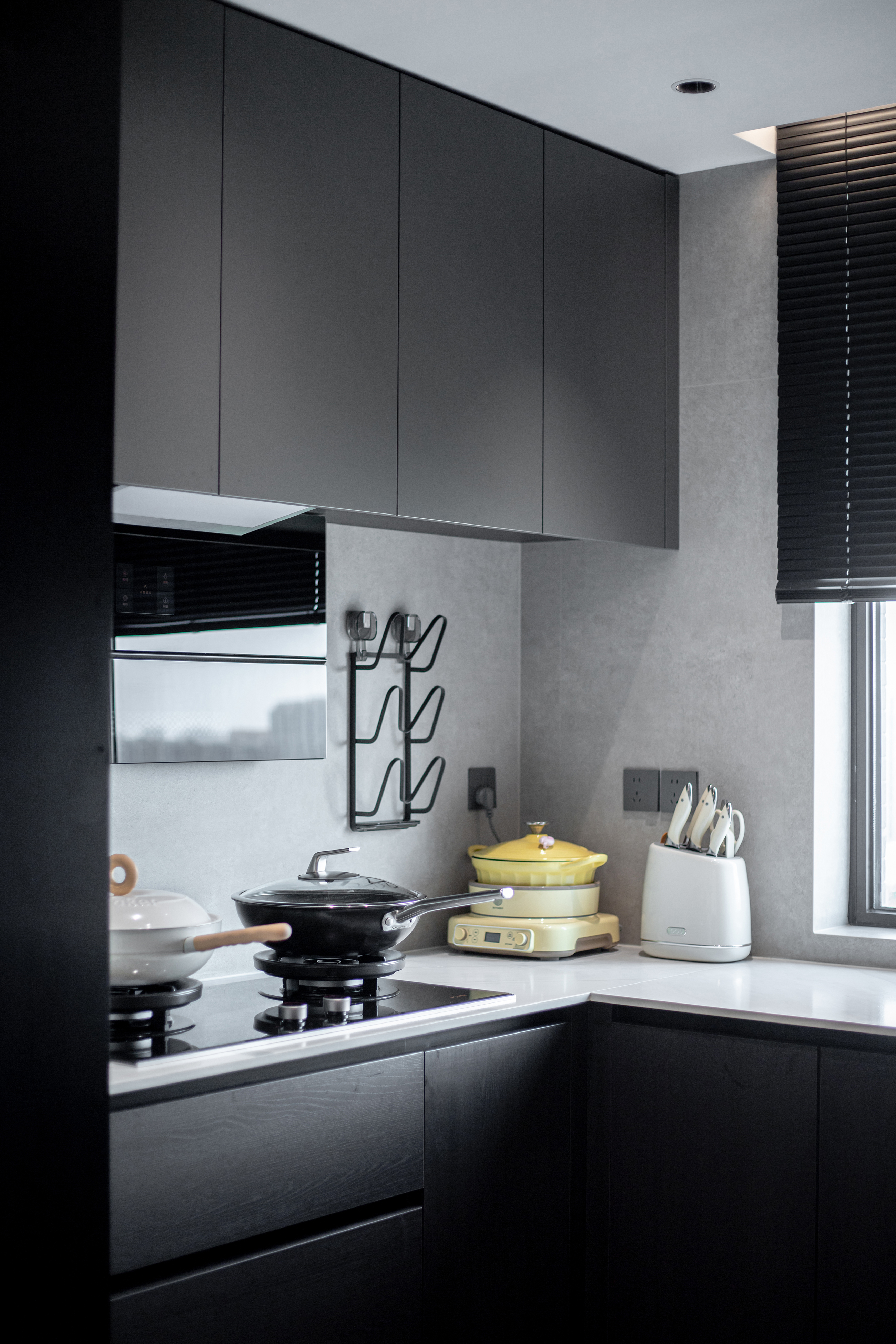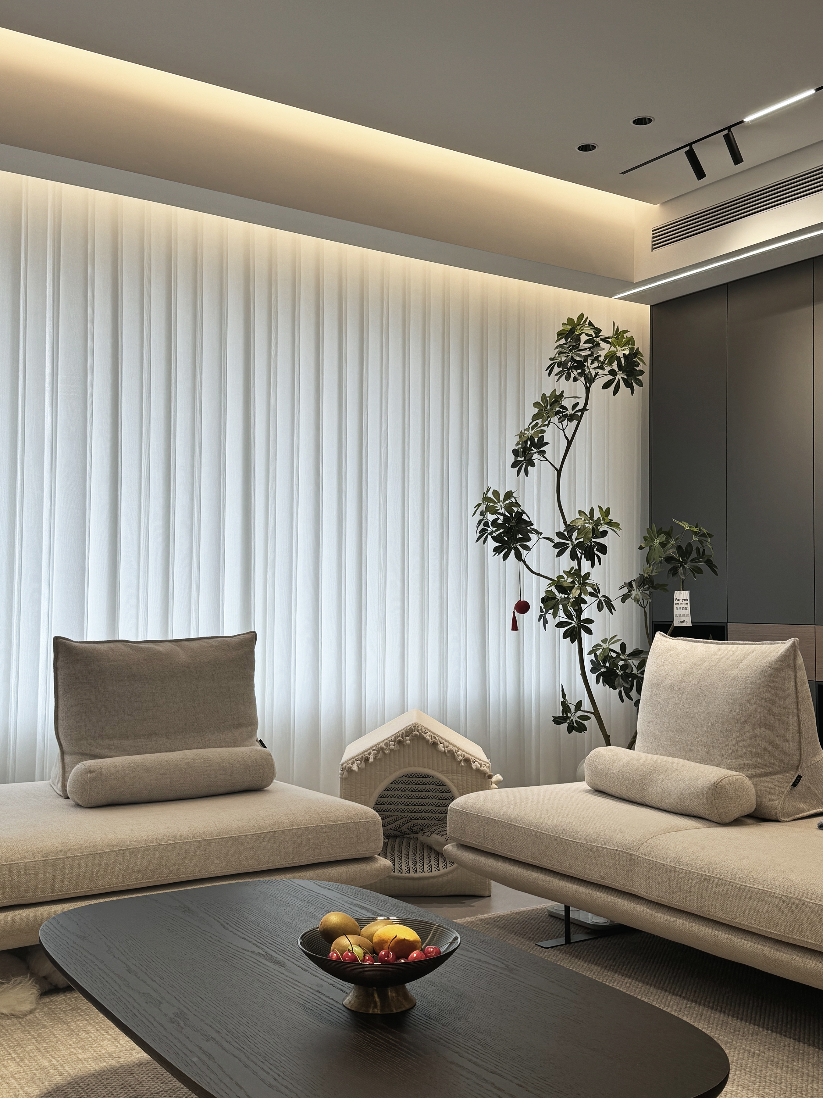 空间意境:整体以黑白灰为主,更贴切现代极简风格。选择浅色沙发,使空间更透气,同时增加明暗对比层次,使空间更高级。局部采用宝格丽石材做点缀,使空间格调更进一步升华。