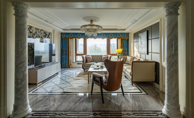 空间布局:将走廊空间纳入客厅,从吊顶再次强调客厅划分,使空间感更强大,打造豪宅即视感。