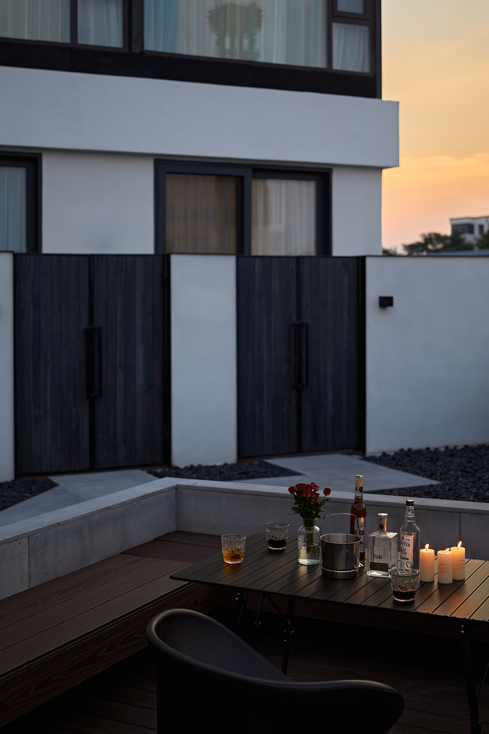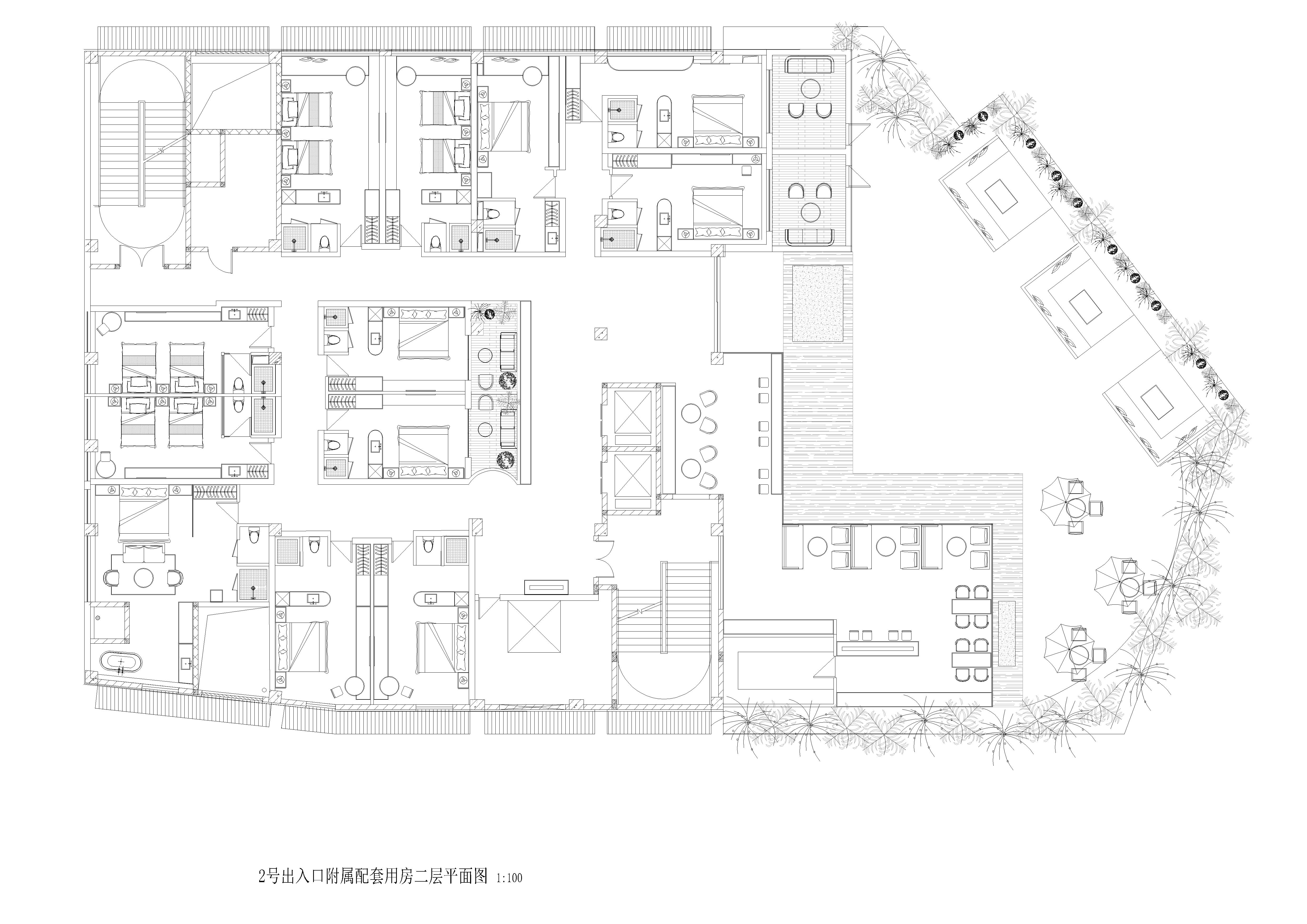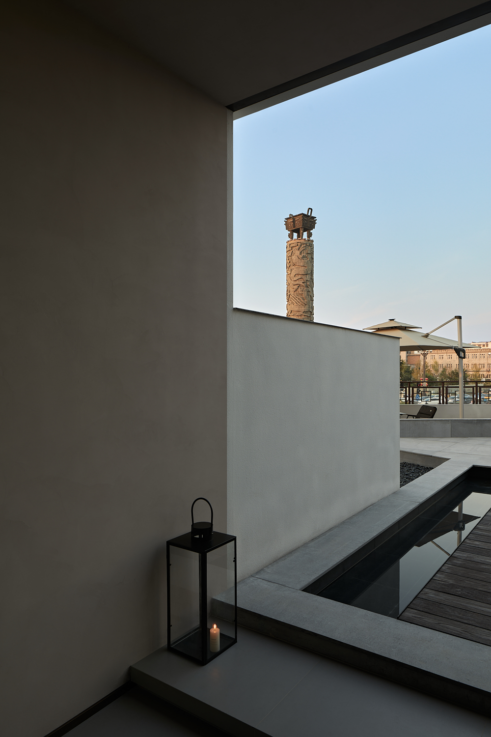 空间布局:二楼设有一处400平方米左右的露台,为客人带来更好的观景体验。露台被设计为环绕水景的布局,水面如镜,倒映着蓝天、云朵与九龙鼎的美丽轮廓,为建筑增添了一种宁静之美。中心的两间暗室被设计为内庭院房,通过露台引入自然光与空气,使每间客房都能够享受到独立的通风与采光效果。两间客房的入口直接通往露台,通过围墙设计打造出私密的小庭院空间,围墙隔绝了道路的喧闹,保持九龙鼎、天空与云朵的纯粹自然景致。这种设计不仅提升了客房的私密性,还让客人能够静心享受室外阳光和空气。露台上还设有一个阳光房,作为休闲区和咖啡吧的功能延伸,延续了室内的空间,同时让客人能够一边享用咖啡,一边欣赏古城风光。