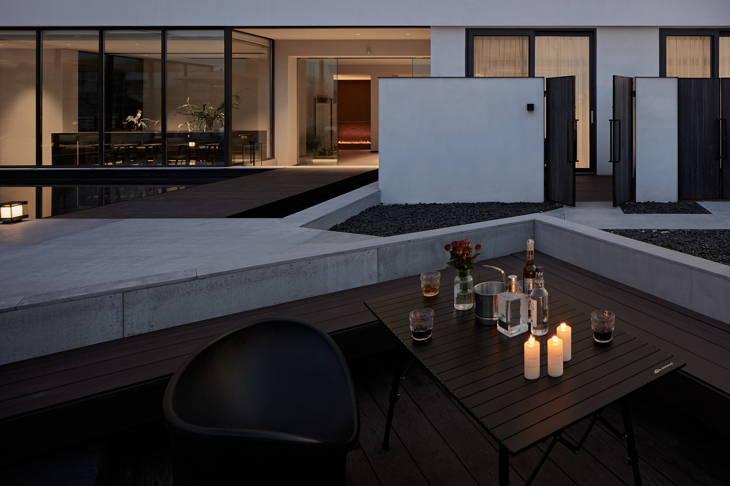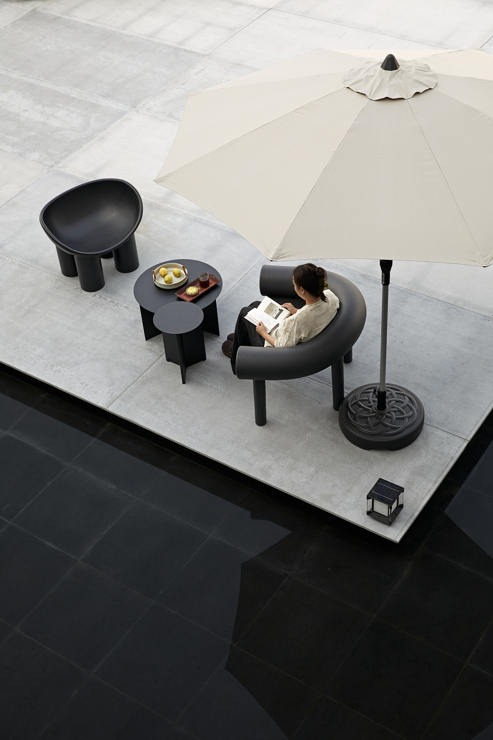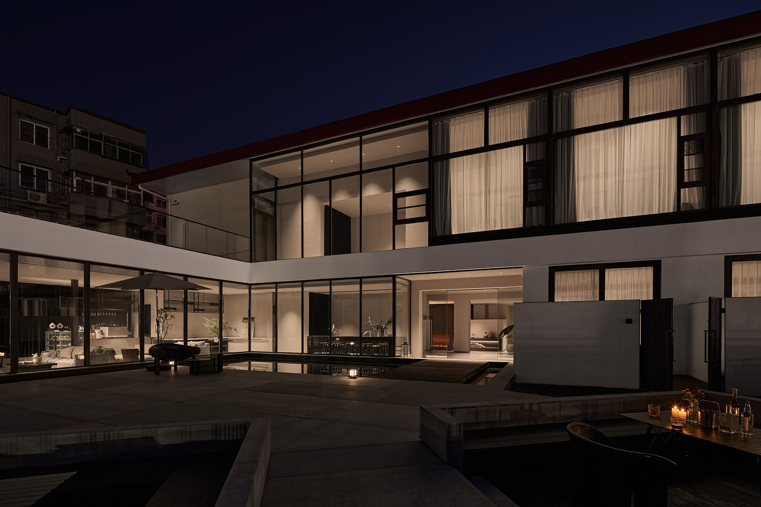 空间布局:二楼设有一处400平方米左右的露台,为客人带来更好的观景体验。露台被设计为环绕水景的布局,水面如镜,倒映着蓝天、云朵与九龙鼎的美丽轮廓,为建筑增添了一种宁静之美。中心的两间暗室被设计为内庭院房,通过露台引入自然光与空气,使每间客房都能够享受到独立的通风与采光效果。两间客房的入口直接通往露台,通过围墙设计打造出私密的小庭院空间,围墙隔绝了道路的喧闹,保持九龙鼎、天空与云朵的纯粹自然景致。这种设计不仅提升了客房的私密性,还让客人能够静心享受室外阳光和空气。露台上还设有一个阳光房,作为休闲区和咖啡吧的功能延伸,延续了室内的空间,同时让客人能够一边享用咖啡,一边欣赏古城风光。