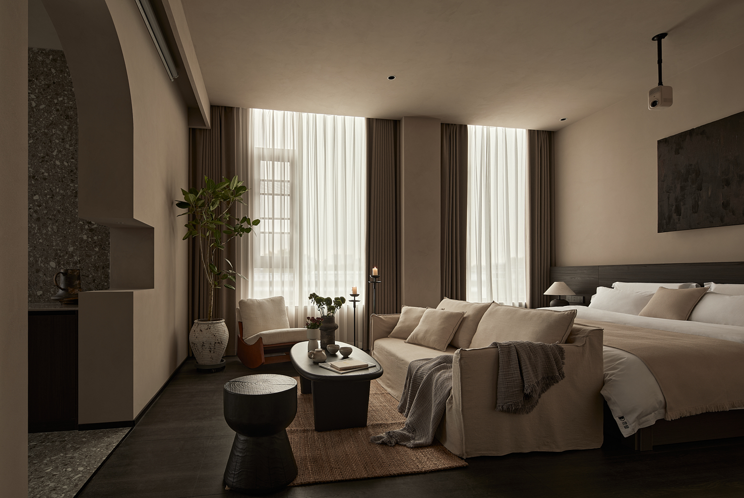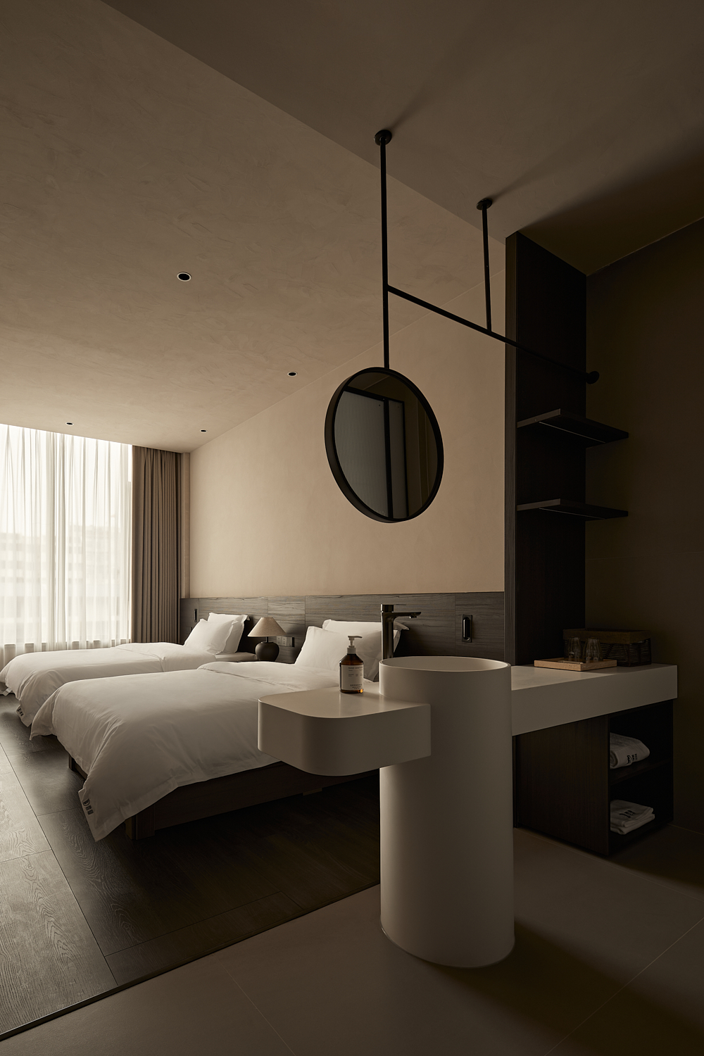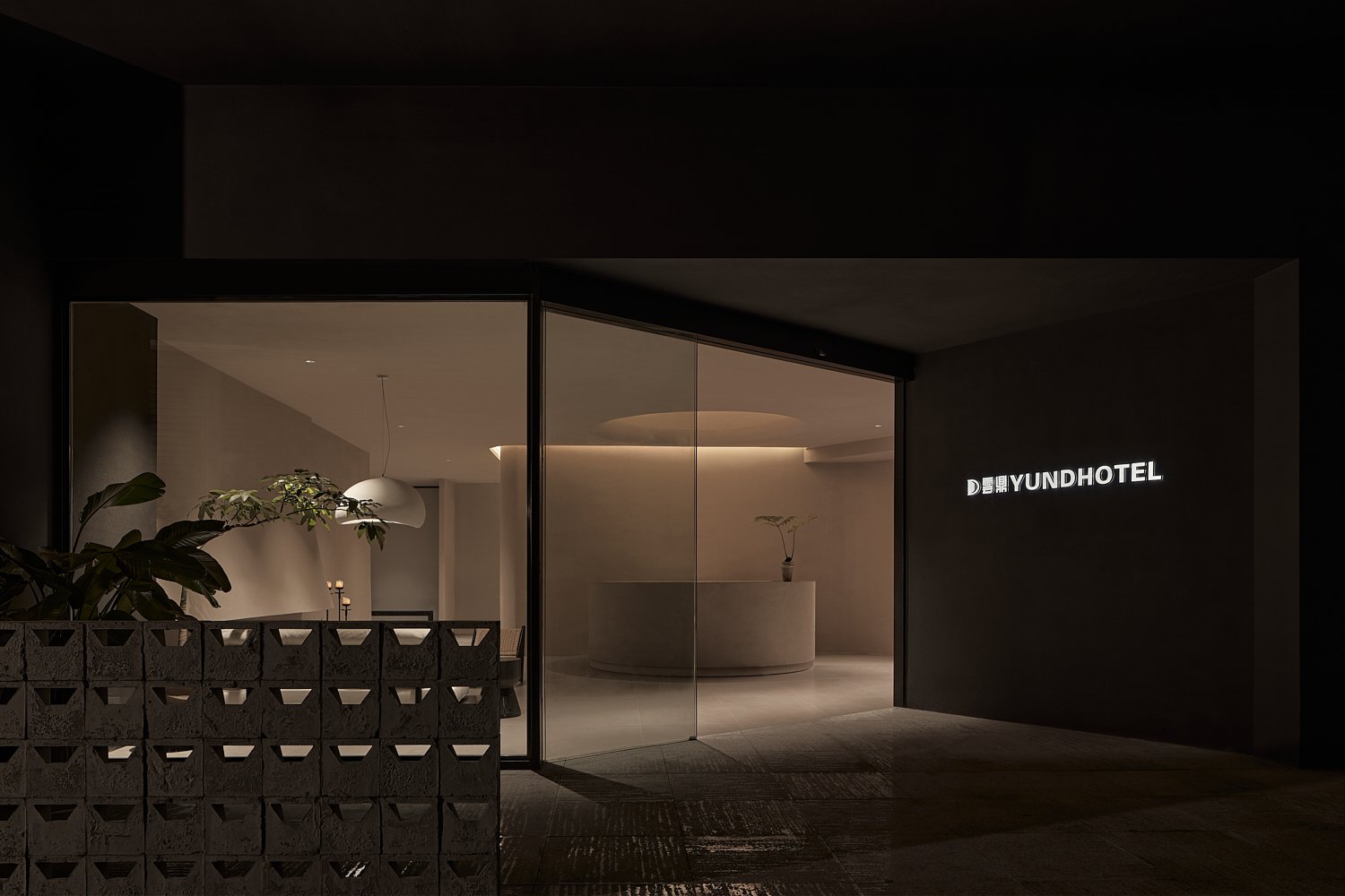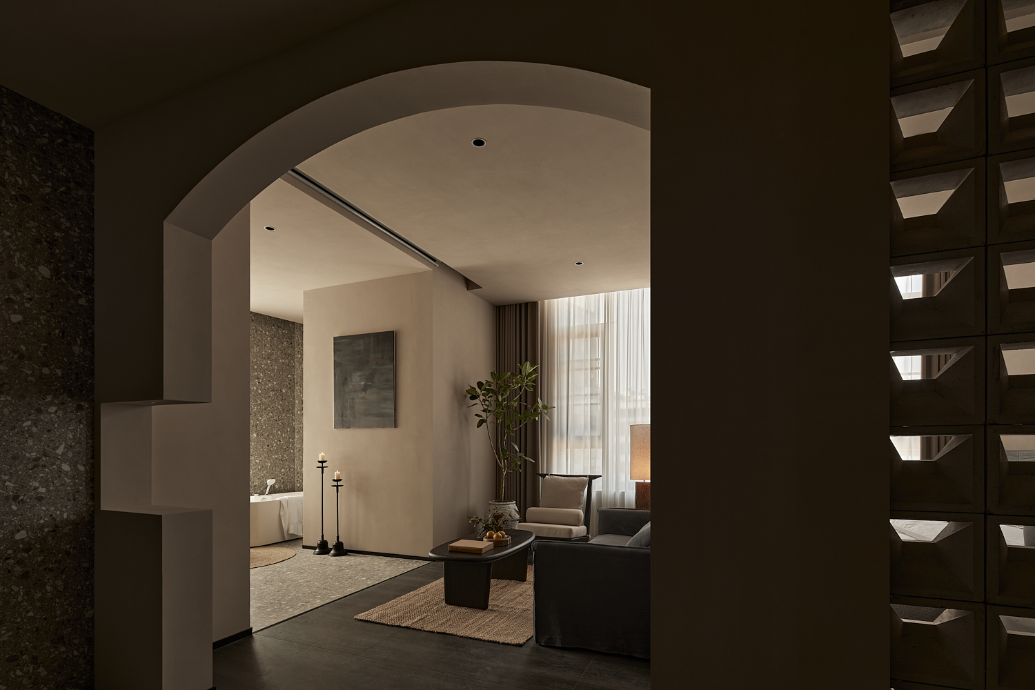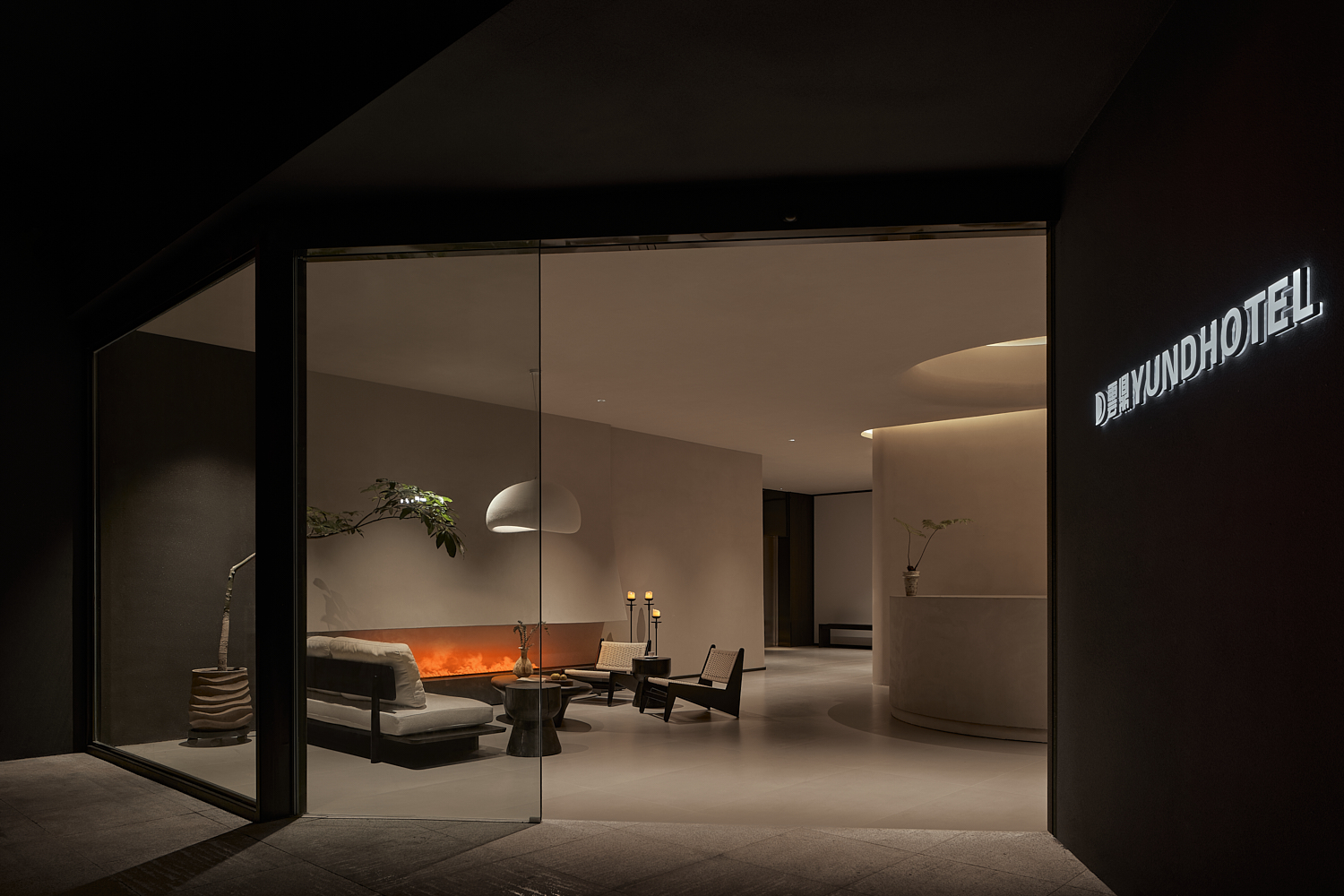 室内设计风格遵循简约自然的美学,透过温暖的灯光和柔和的阴影营造出平和舒适的氛围,融合了自然与建筑元素,力求实现空间与环境的共生。大面积的玻璃窗不仅提供了充足的自然采光,还让阳光恣意洒入室内,柔和的光影变化增添了空间的宁静感。整体色调采用中性色,以植物作为点缀,注入了空间的生机感,同时保持极简的美学调性。这样的设计旨在让建筑与洛阳古城的历史风貌相呼应,使客人能够感受到区域的独特文化韵味和历史厚重感。