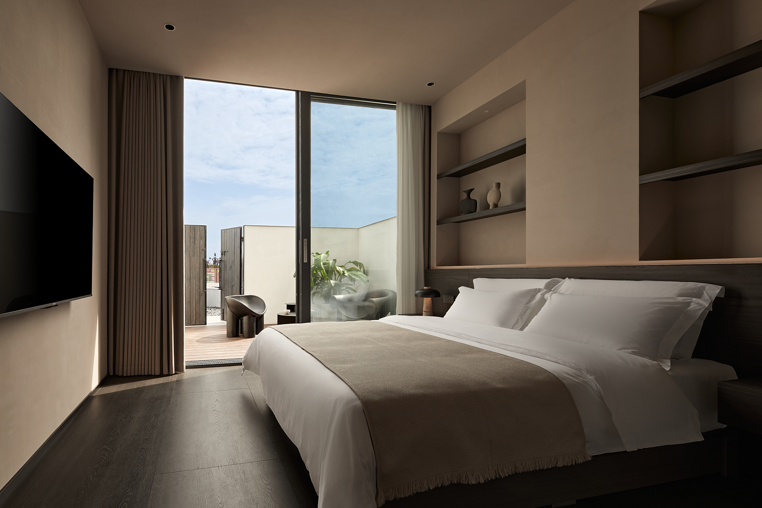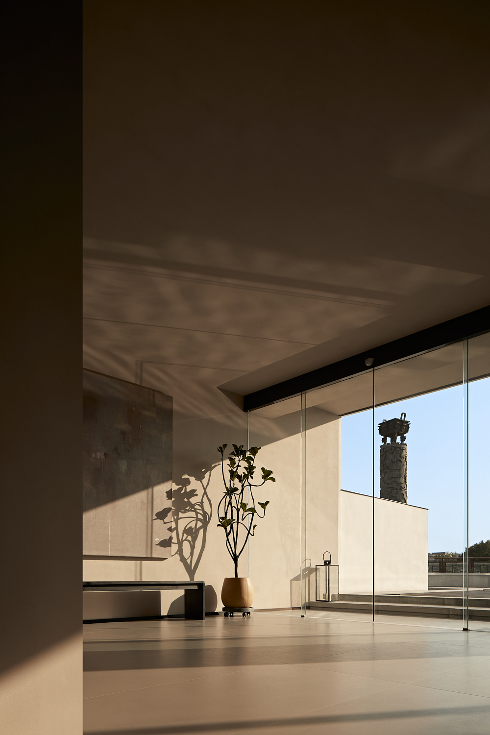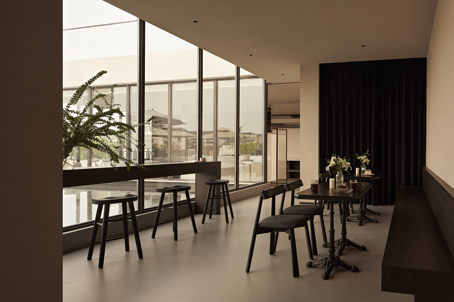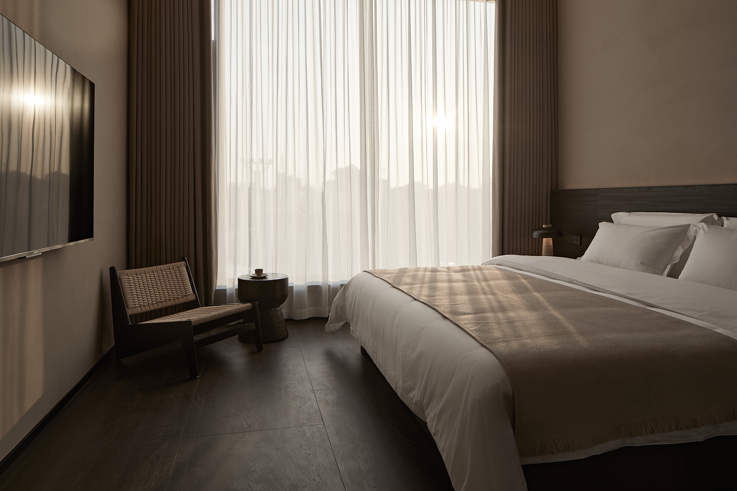 室内设计风格遵循简约自然的美学,透过温暖的灯光和柔和的阴影营造出平和舒适的氛围,融合了自然与建筑元素,力求实现空间与环境的共生。大面积的玻璃窗不仅提供了充足的自然采光,还让阳光恣意洒入室内,柔和的光影变化增添了空间的宁静感。整体色调采用中性色,以植物作为点缀,注入了空间的生机感,同时保持极简的美学调性。这样的设计旨在让建筑与洛阳古城的历史风貌相呼应,使客人能够感受到区域的独特文化韵味和历史厚重感。