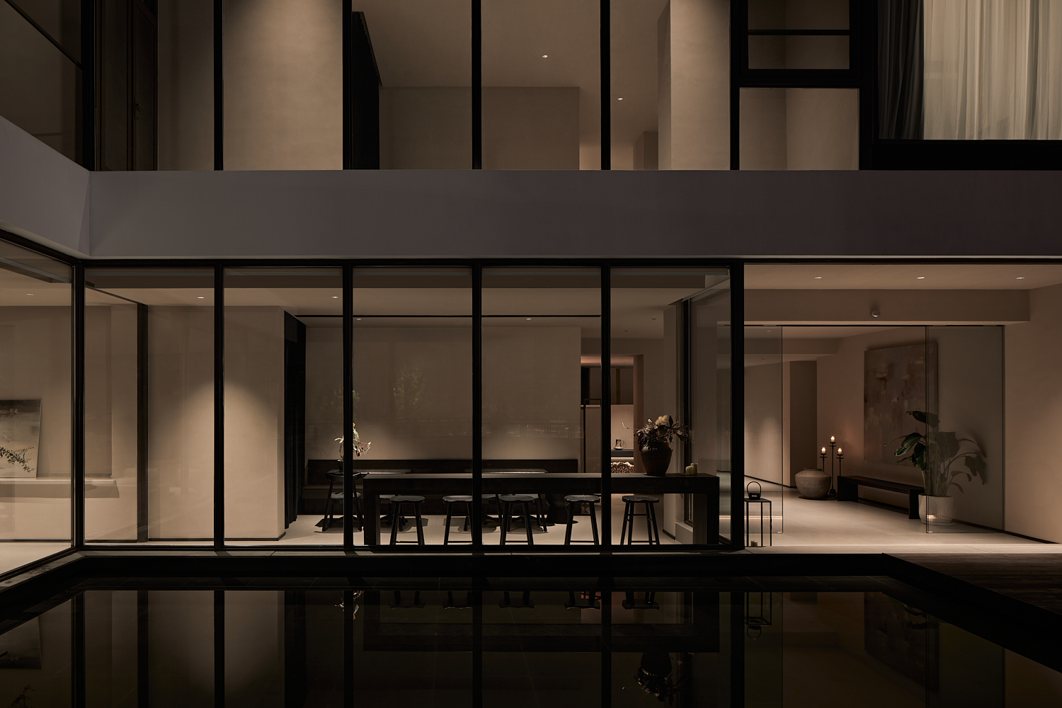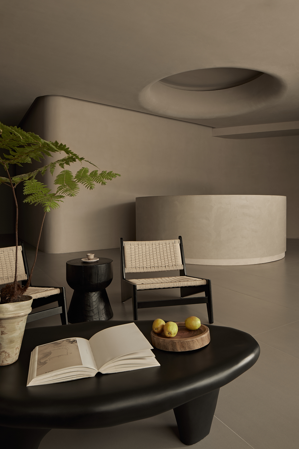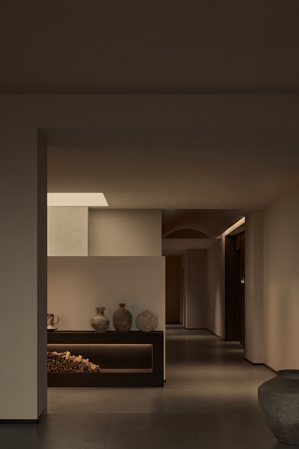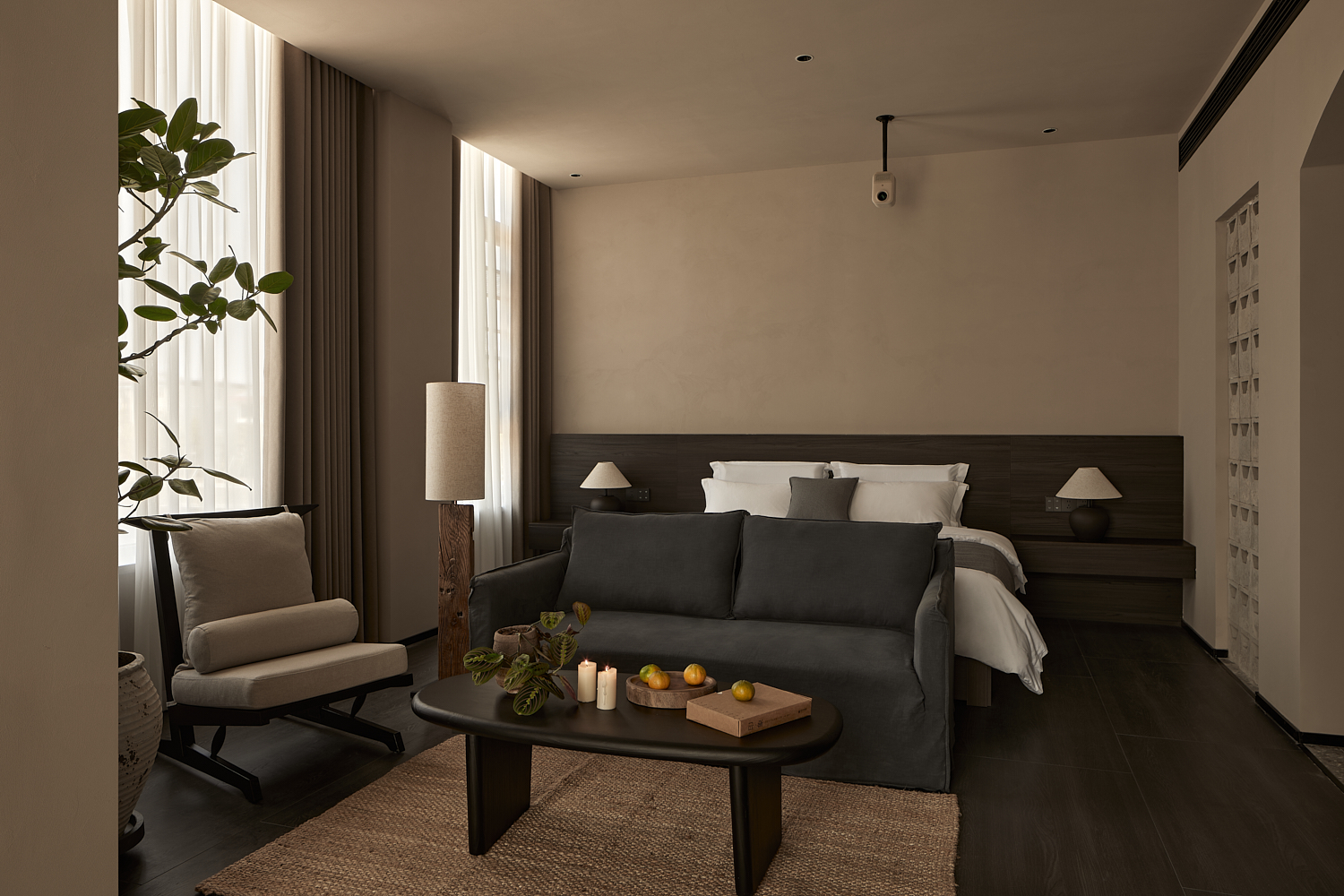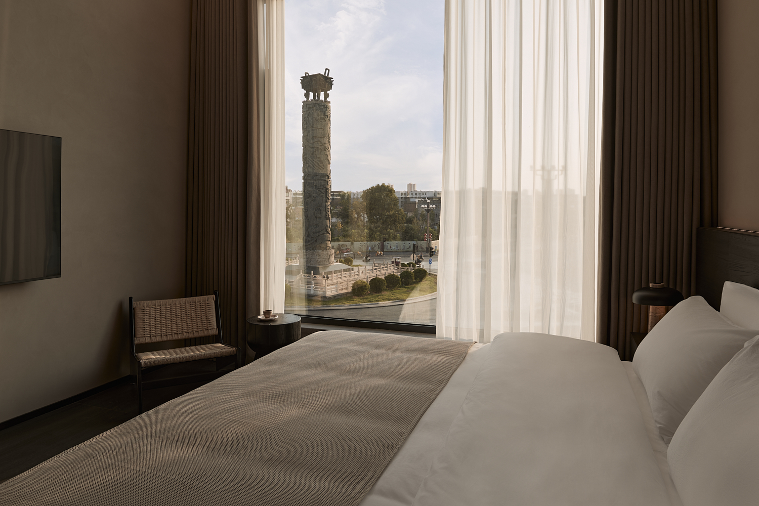 室内设计风格遵循简约自然的美学,透过温暖的灯光和柔和的阴影营造出平和舒适的氛围,融合了自然与建筑元素,力求实现空间与环境的共生。大面积的玻璃窗不仅提供了充足的自然采光,还让阳光恣意洒入室内,柔和的光影变化增添了空间的宁静感。整体色调采用中性色,以植物作为点缀,注入了空间的生机感,同时保持极简的美学调性。这样的设计旨在让建筑与洛阳古城的历史风貌相呼应,使客人能够感受到区域的独特文化韵味和历史厚重感。