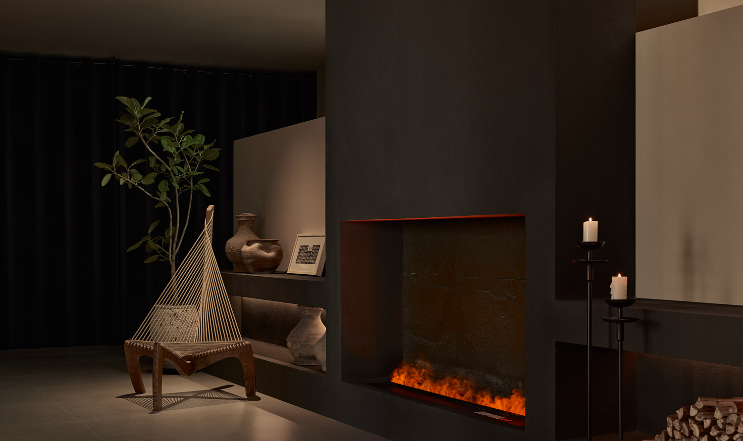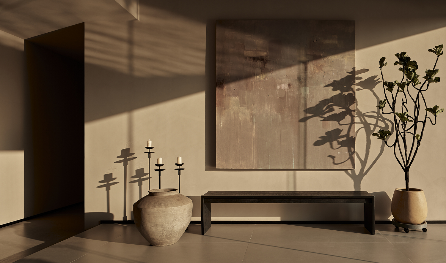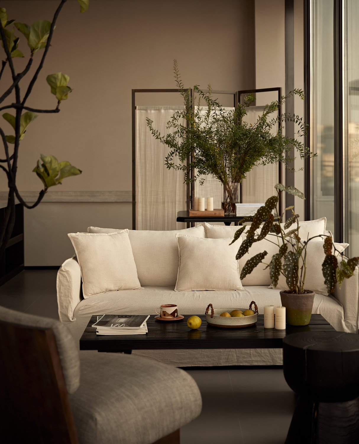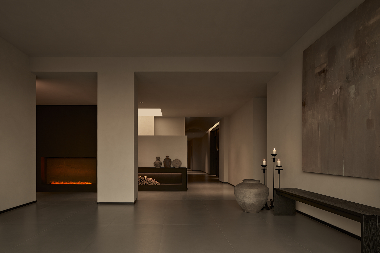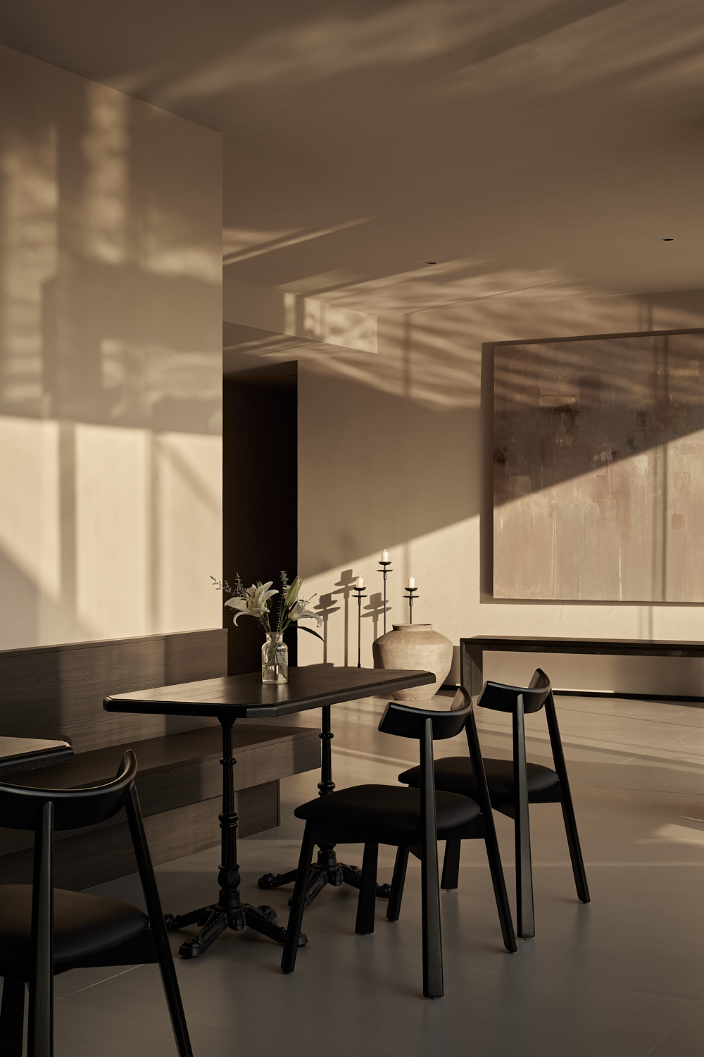 室内设计风格遵循简约自然的美学,透过温暖的灯光和柔和的阴影营造出平和舒适的氛围,融合了自然与建筑元素,力求实现空间与环境的共生。大面积的玻璃窗不仅提供了充足的自然采光,还让阳光恣意洒入室内,柔和的光影变化增添了空间的宁静感。整体色调采用中性色,以植物作为点缀,注入了空间的生机感,同时保持极简的美学调性。这样的设计旨在让建筑与洛阳古城的历史风貌相呼应,使客人能够感受到区域的独特文化韵味和历史厚重感。