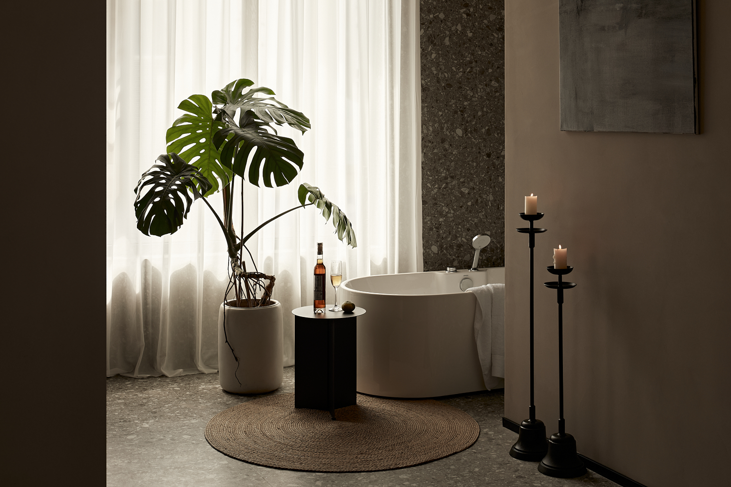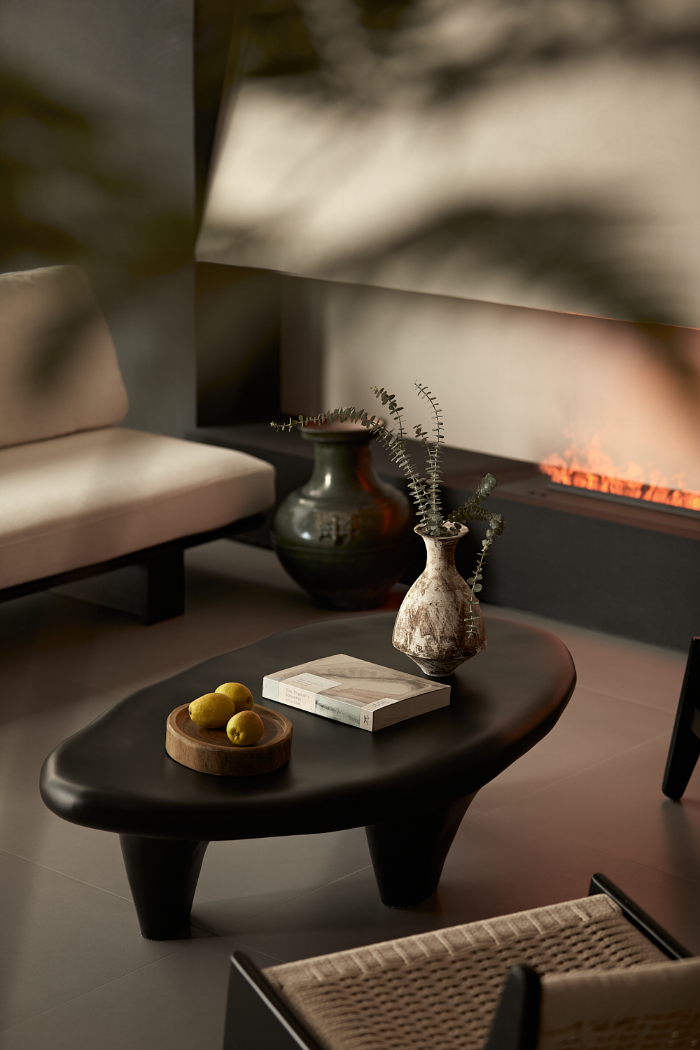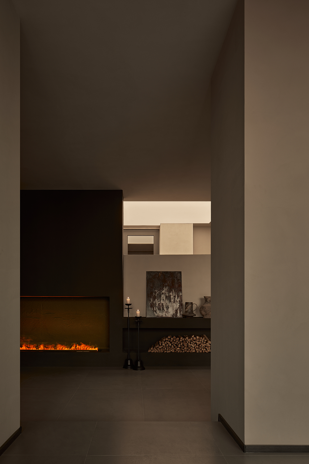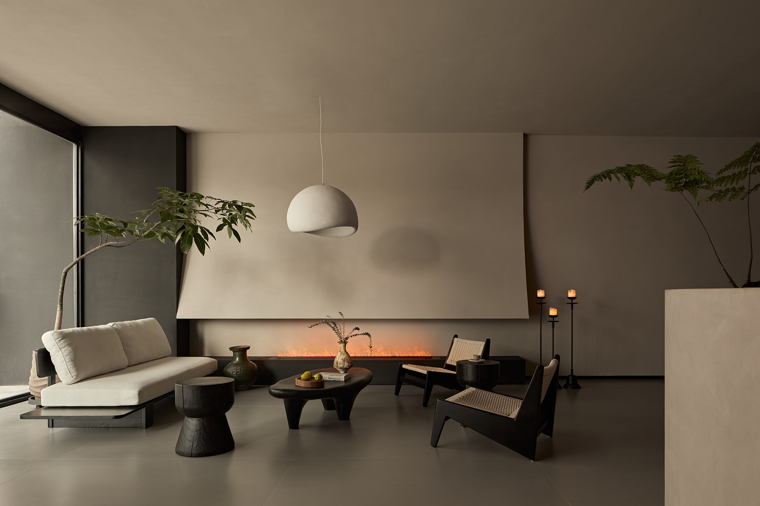 设计选材:项目在材料选择上也特别注重自然与本土的结合。力求通过材质表达出温暖和质朴的氛围。墙面和地板也均采用中性色微水泥,使整个空间呈现出和谐统一的视觉效果,为建筑营造出温暖、质朴的自然感。同时,室内浴室和厨房区域选用水磨石地面和定制的水泥瓷砖,不仅实现色调的统一,也增强了室内外空间的整体感。这种材料的选择进一步加强了建筑与环境的紧密联系,体现出项目对自然和文化在地性的尊重。
