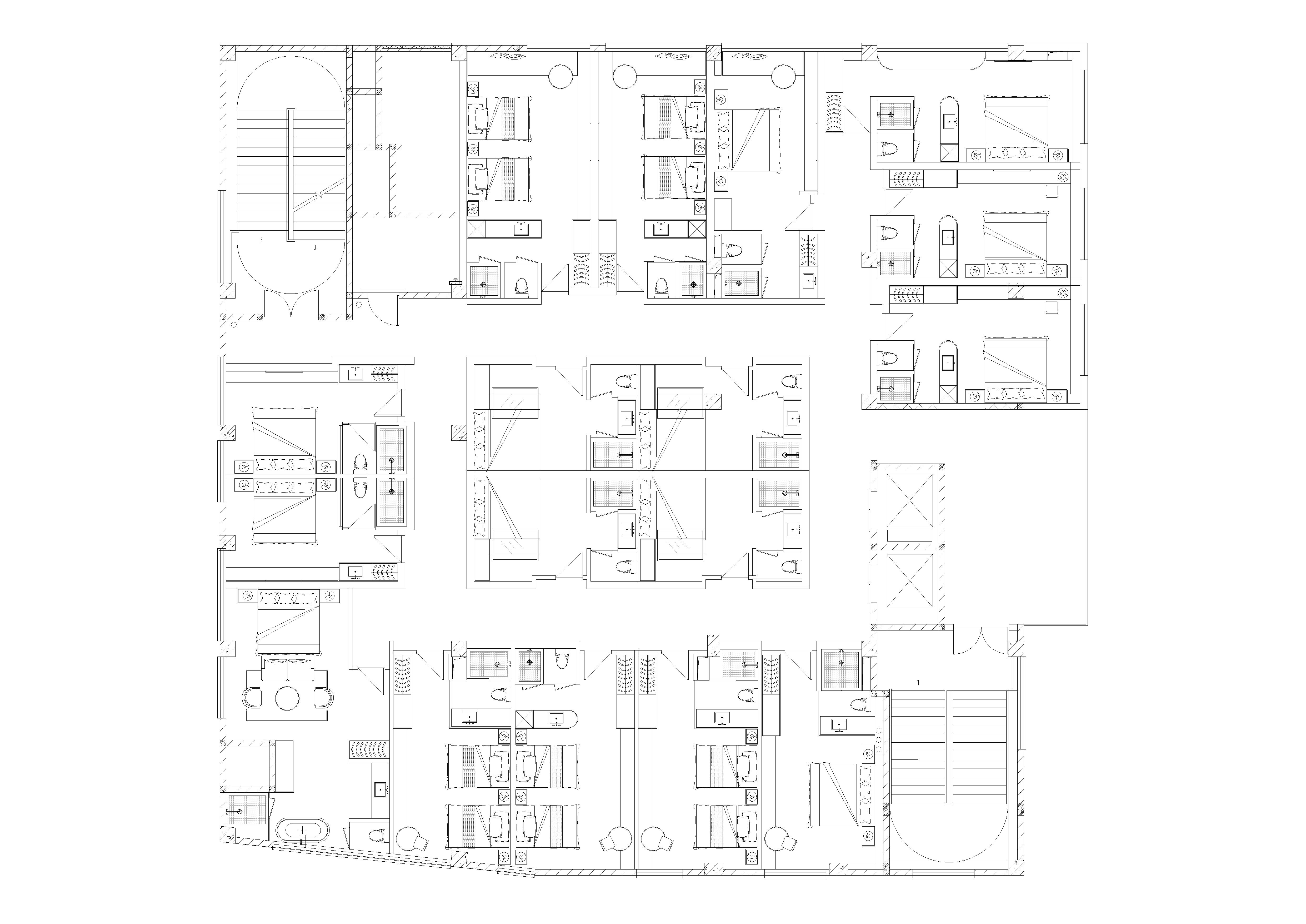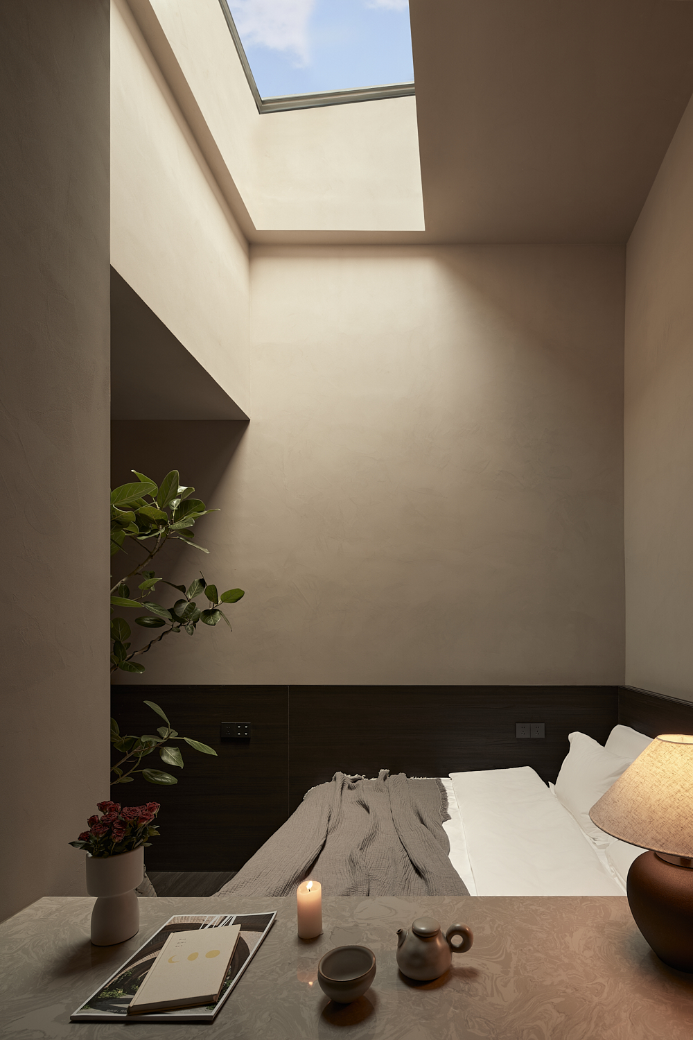 三楼的中心部分原有四间暗室,这些房间特别在屋顶开设天窗,使自然光能够透入房间。每间房内的光影随时间而变化,让客人在室内也能感受到外界的自然节奏。这些天窗设计不仅为暗室带来了明亮的采光,还使得空间更具层次感,丰富了整体建筑的光影效果,为客人提供了独特的入住体验。通过合理的空间划分和设计布局,建筑在满足私密性的基础上,营造出层次丰富的空间体验,让宾客在享受私密空间的同时,感受不同层次的文化氛围。