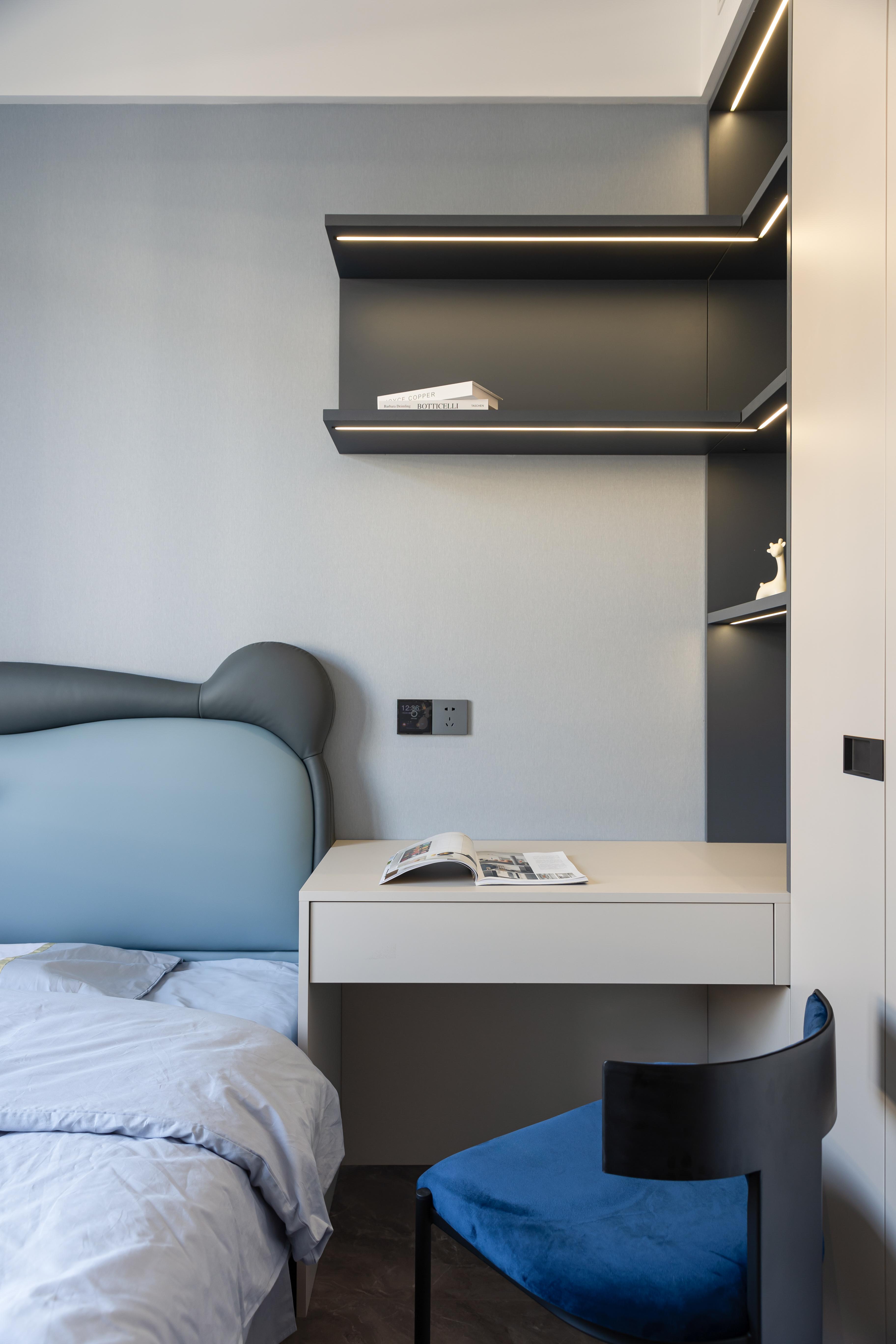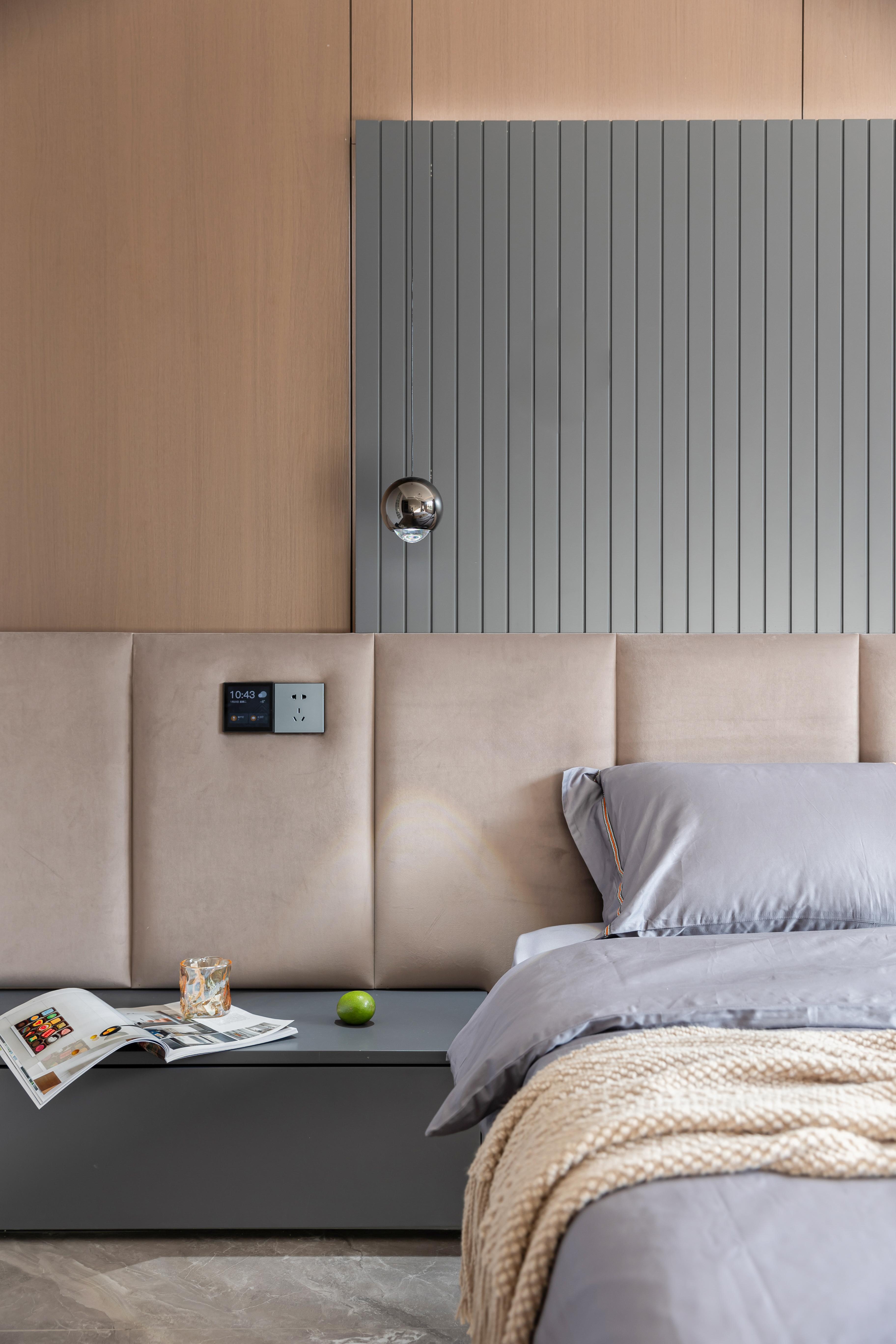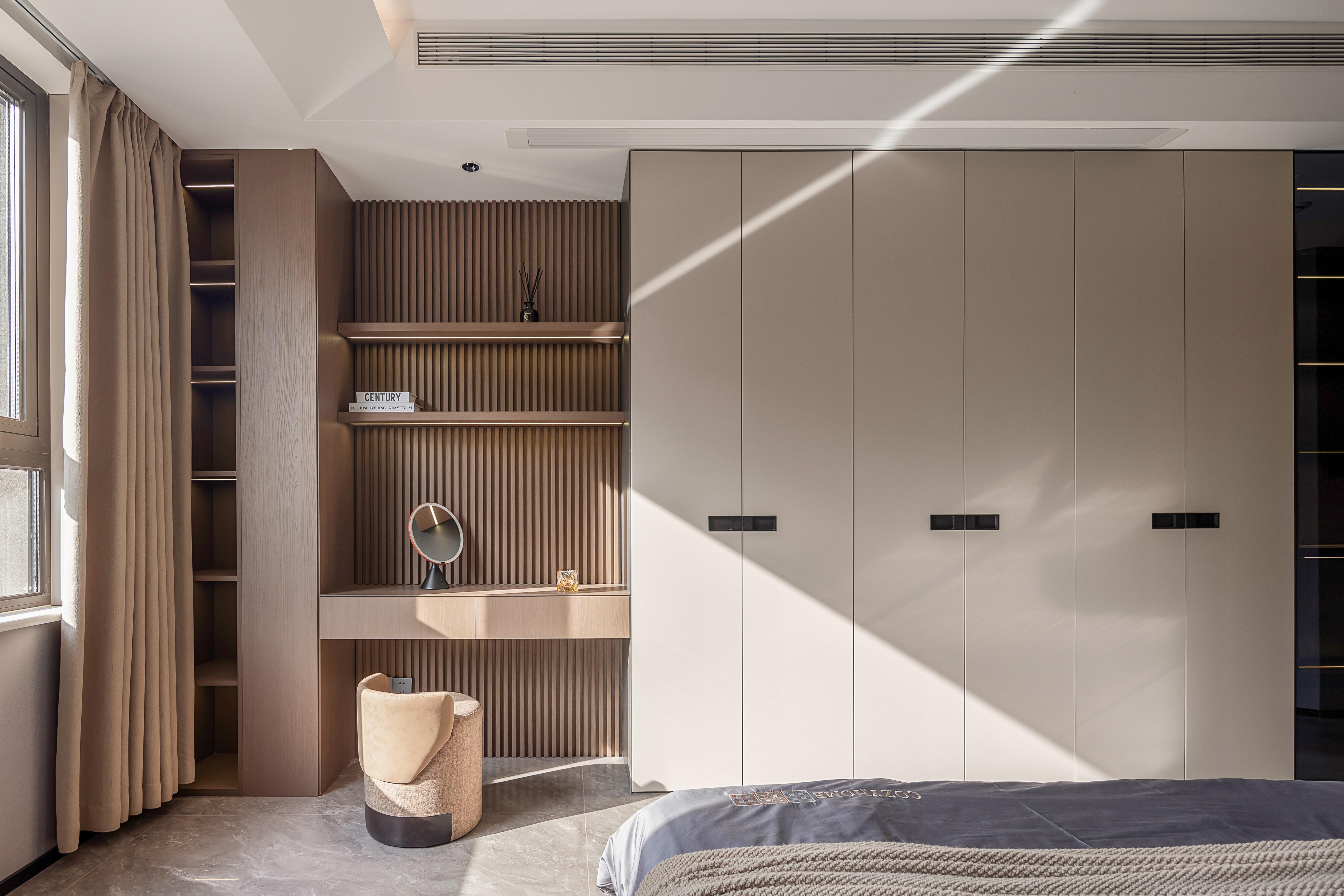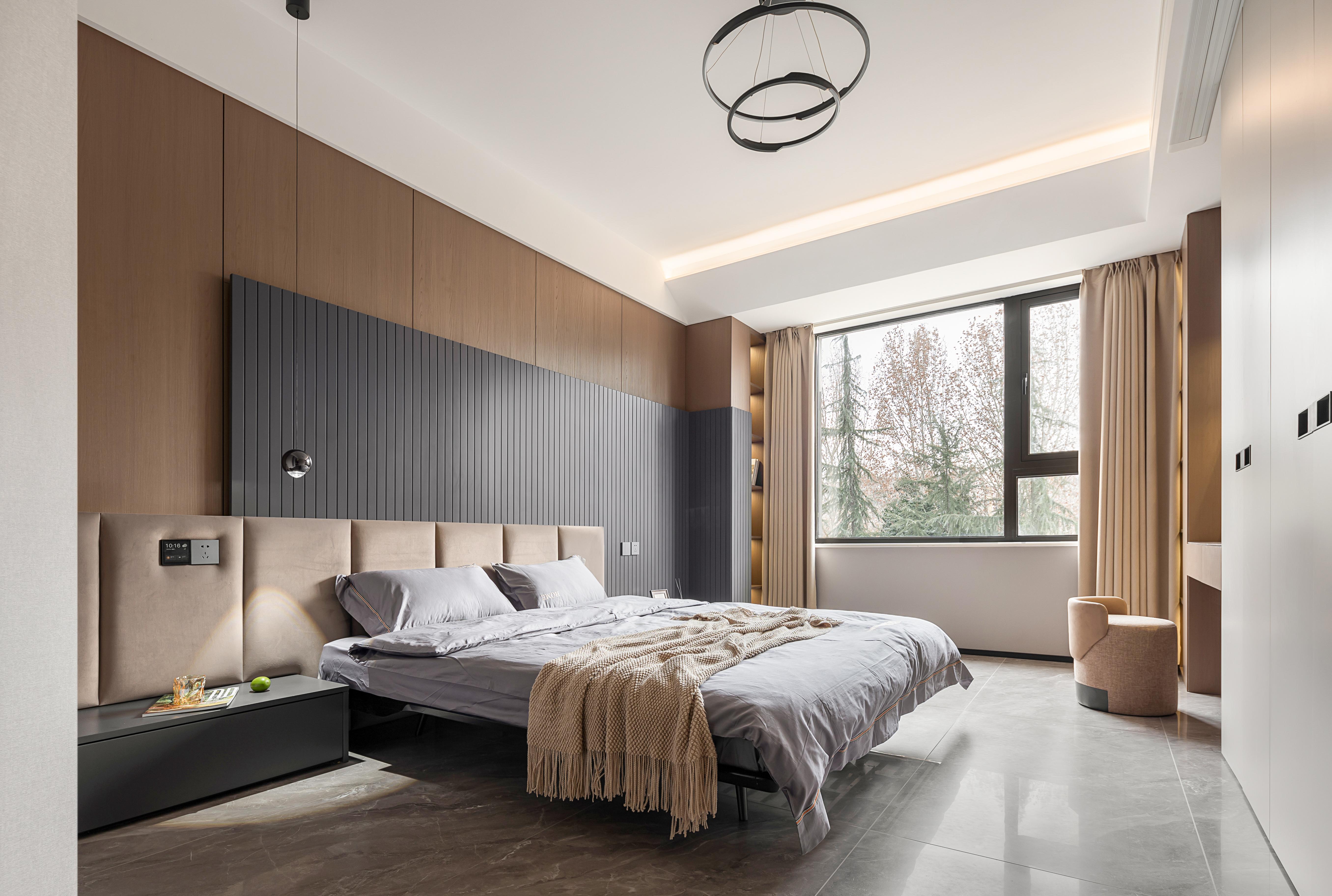 空间意境:嵌入式背景墙,在视觉上具有整体感、统一感。卧室整体是暗色系,木纹墙板背景与木质格栅板搭配,在光的照射下营造出自然,静谧的空间氛围,阶梯式的吊顶与灯带在视觉上对空间做延伸,