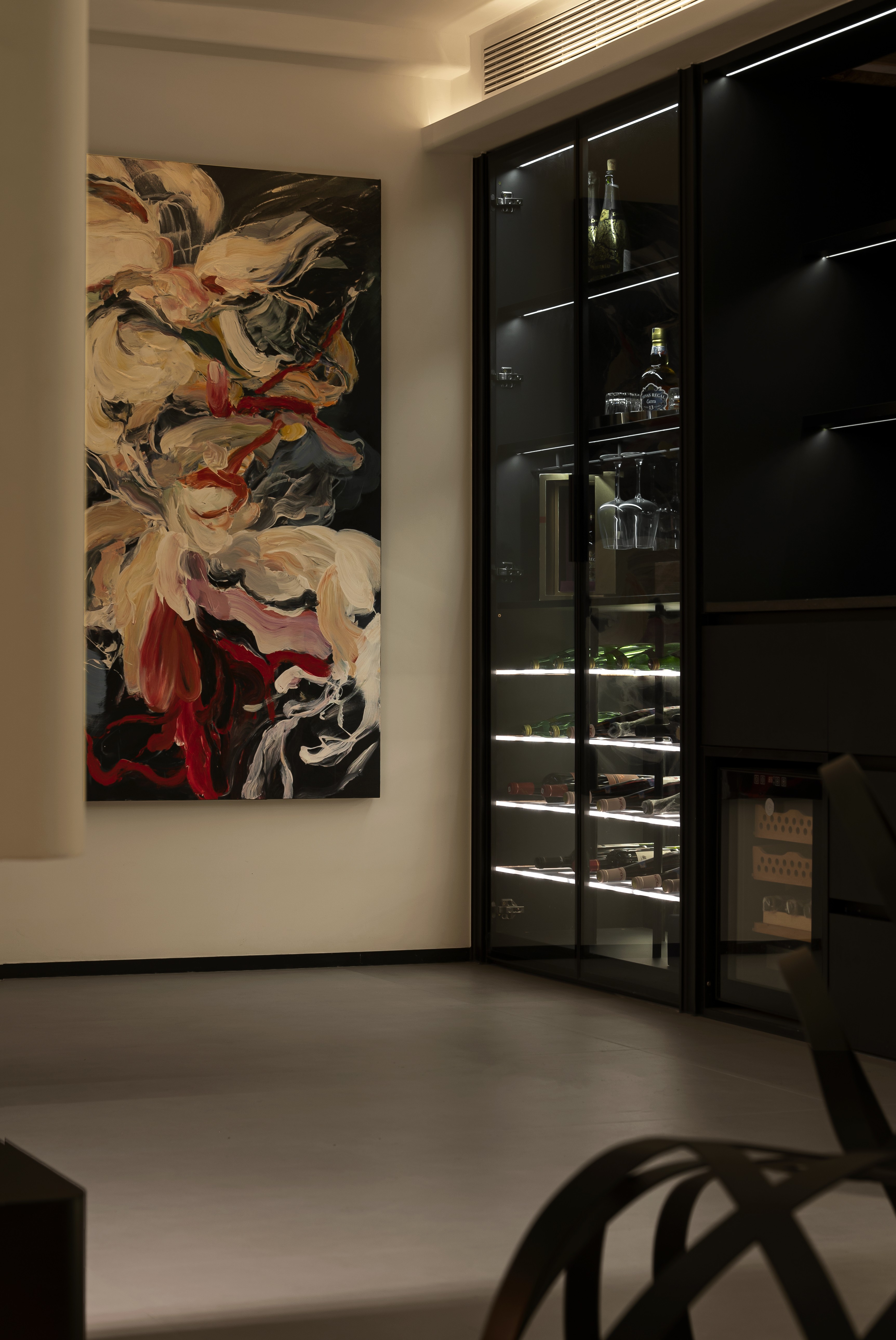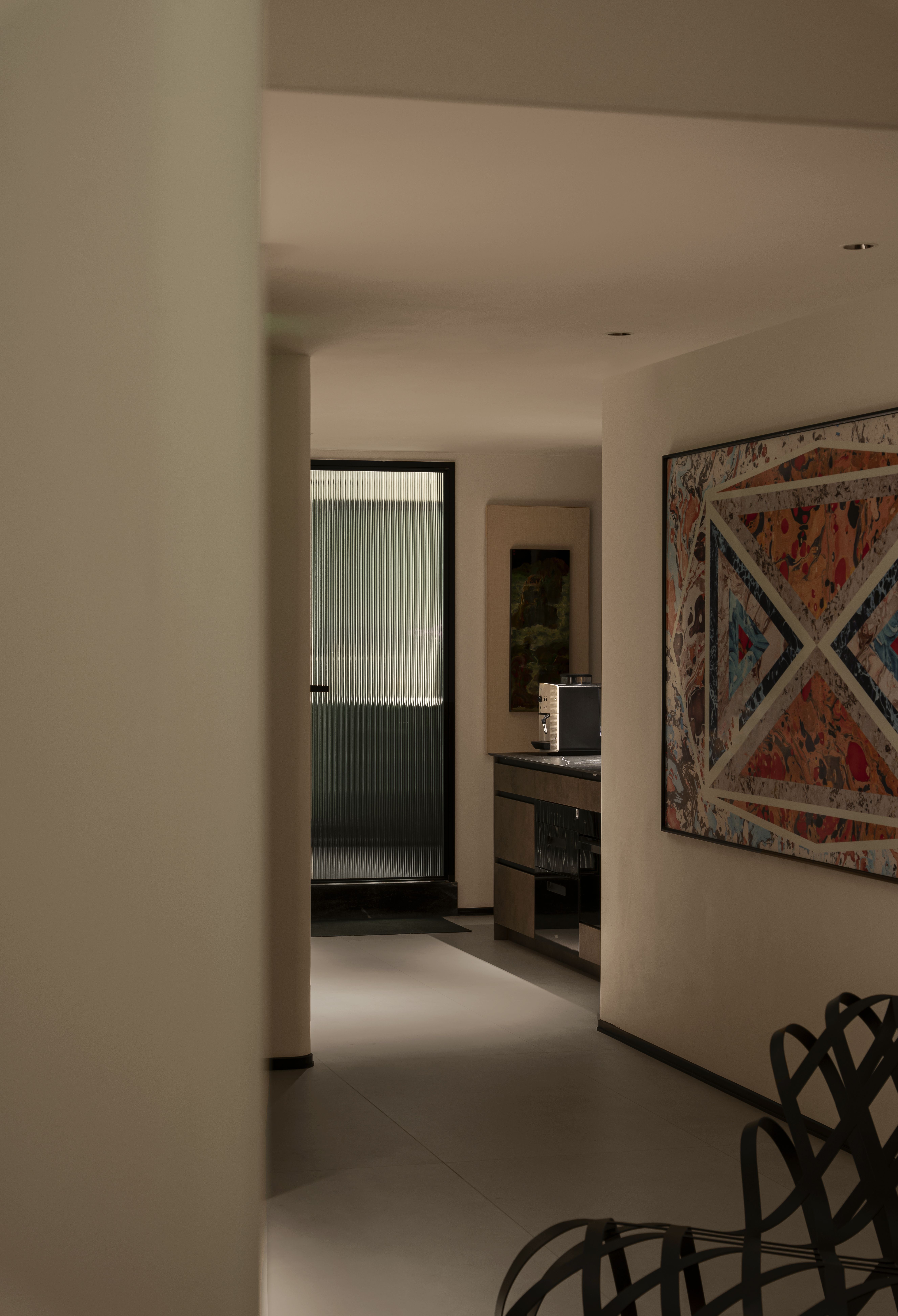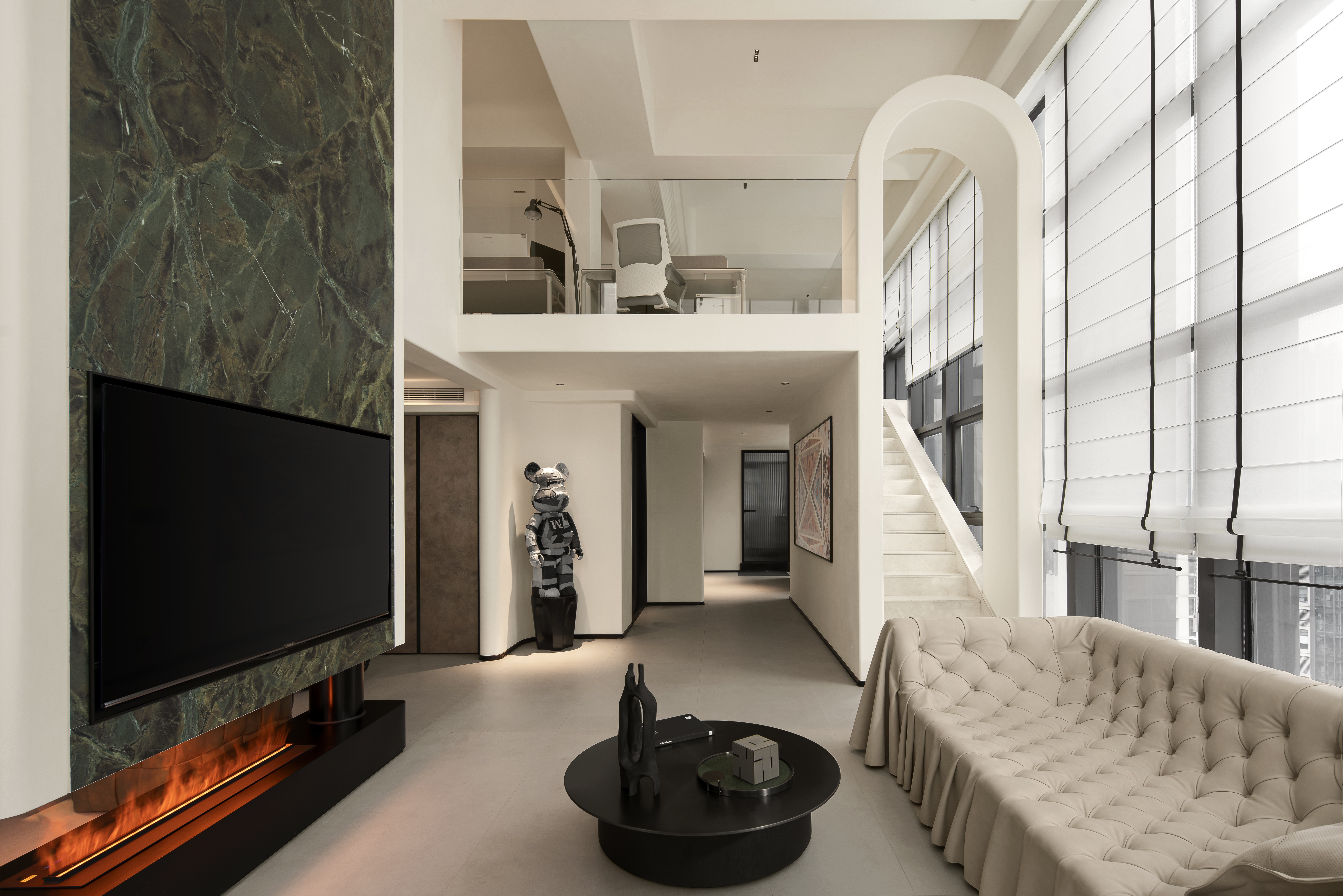 设计选材:岩板做为饰面象征着生命力与朝气。玻璃幕墙为室内空间引入自然光。装饰雕塑与艺术品的应用增加空间氛围感。一层与二层办公区的楼梯处设计的拱形门与玻璃栏杆的结合既增加空间的装饰性与通透感。又作为二层办公区与一层休闲接待区的空间分隔。