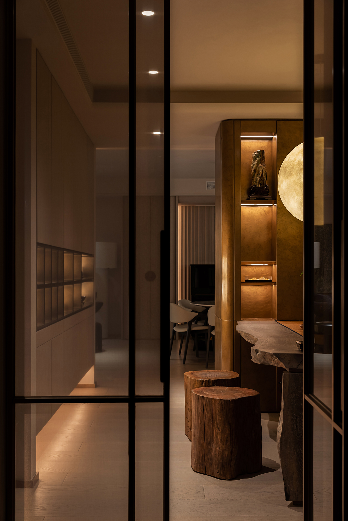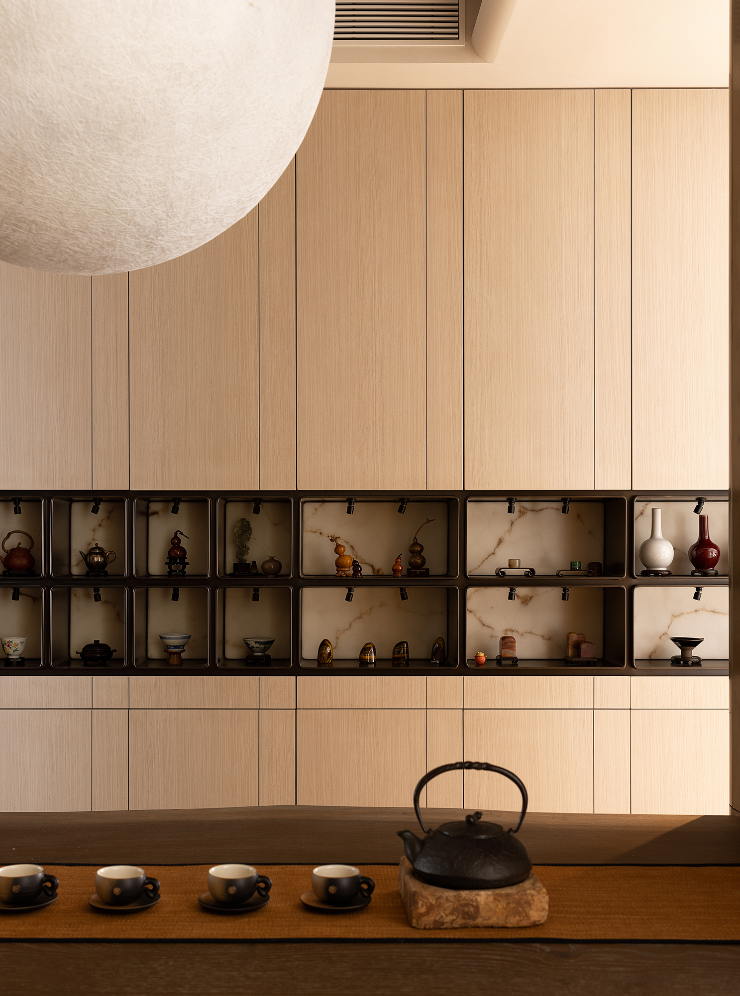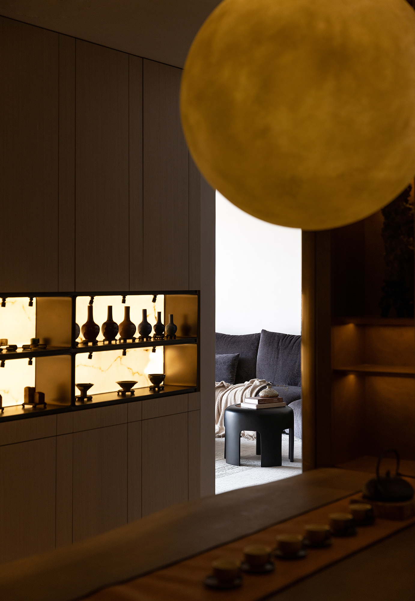 2.利用客餐厅与卧室书房之间的过渡空间,打造茶室,满足喝茶和藏品展示的文化需求;