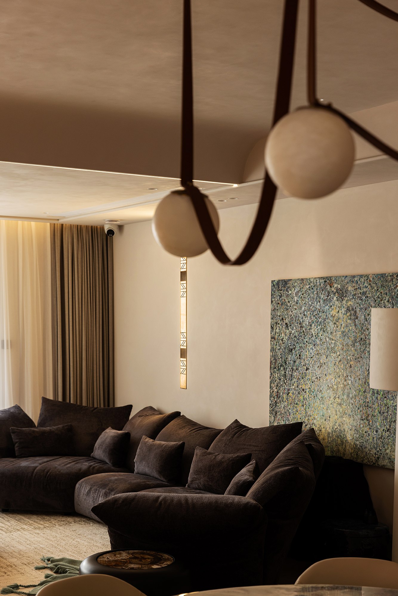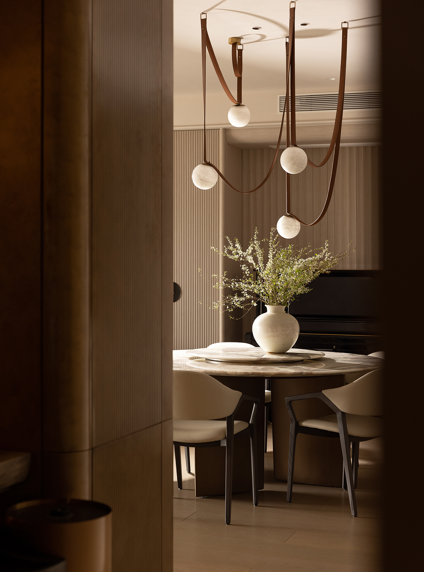 设计选材:用球形灯与皮革展现简约而松弛的空间氛围。