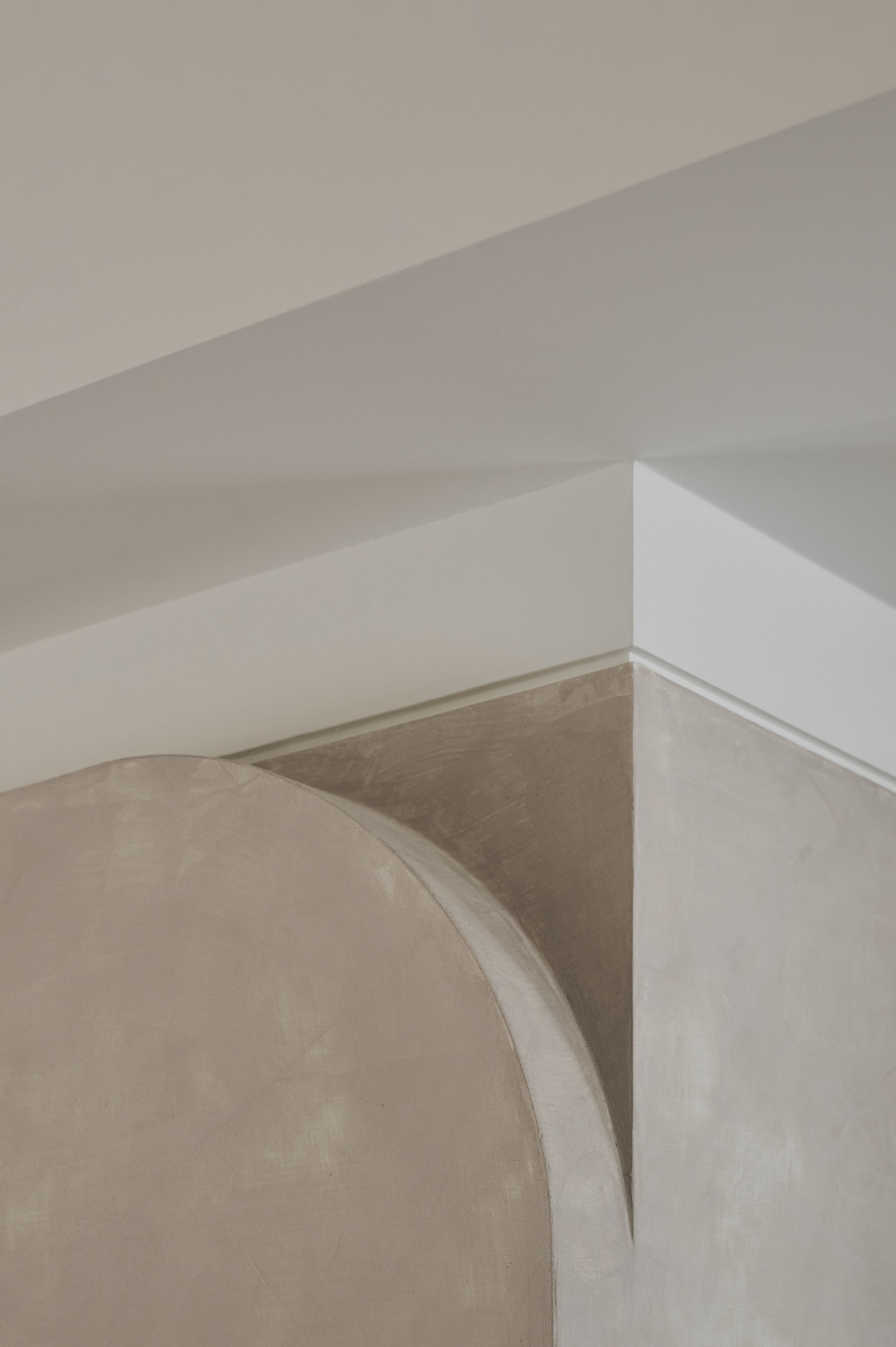 電視牆的弧線講述著家庭的那份和諧,繽紛的水磨石播放著家人間歡愉的笑聲。小細節注入了靈魂,點亮角落,點亮了那份愛。在凝聚家庭的公共領域大膽的用粉色及深灰藝術塗料,用衝突的配色來融合兩個世代的生活。