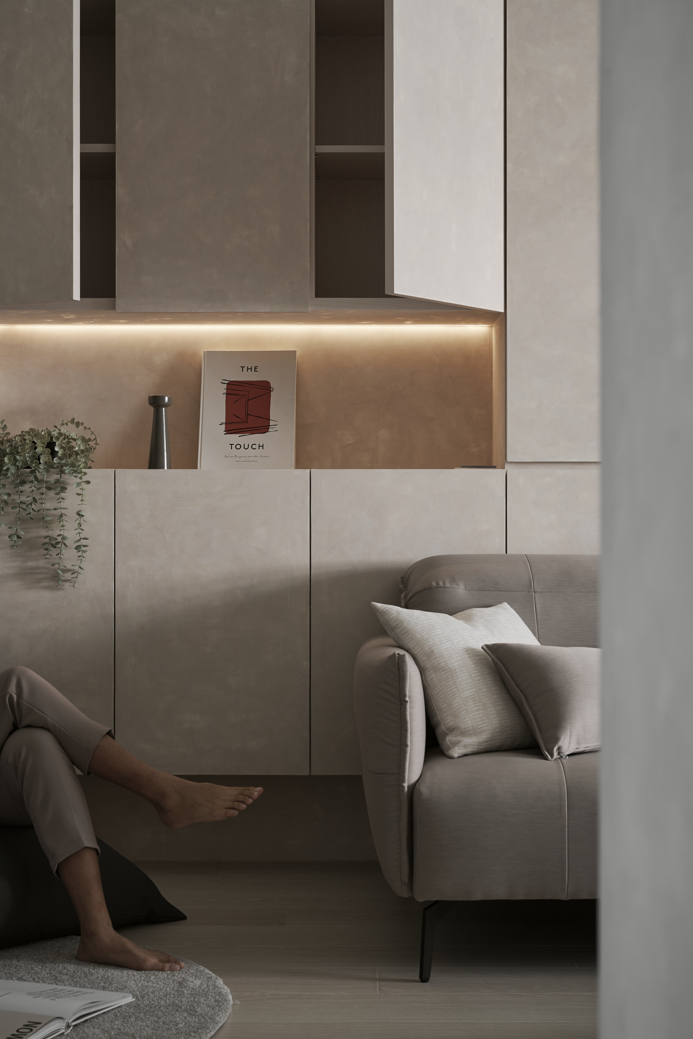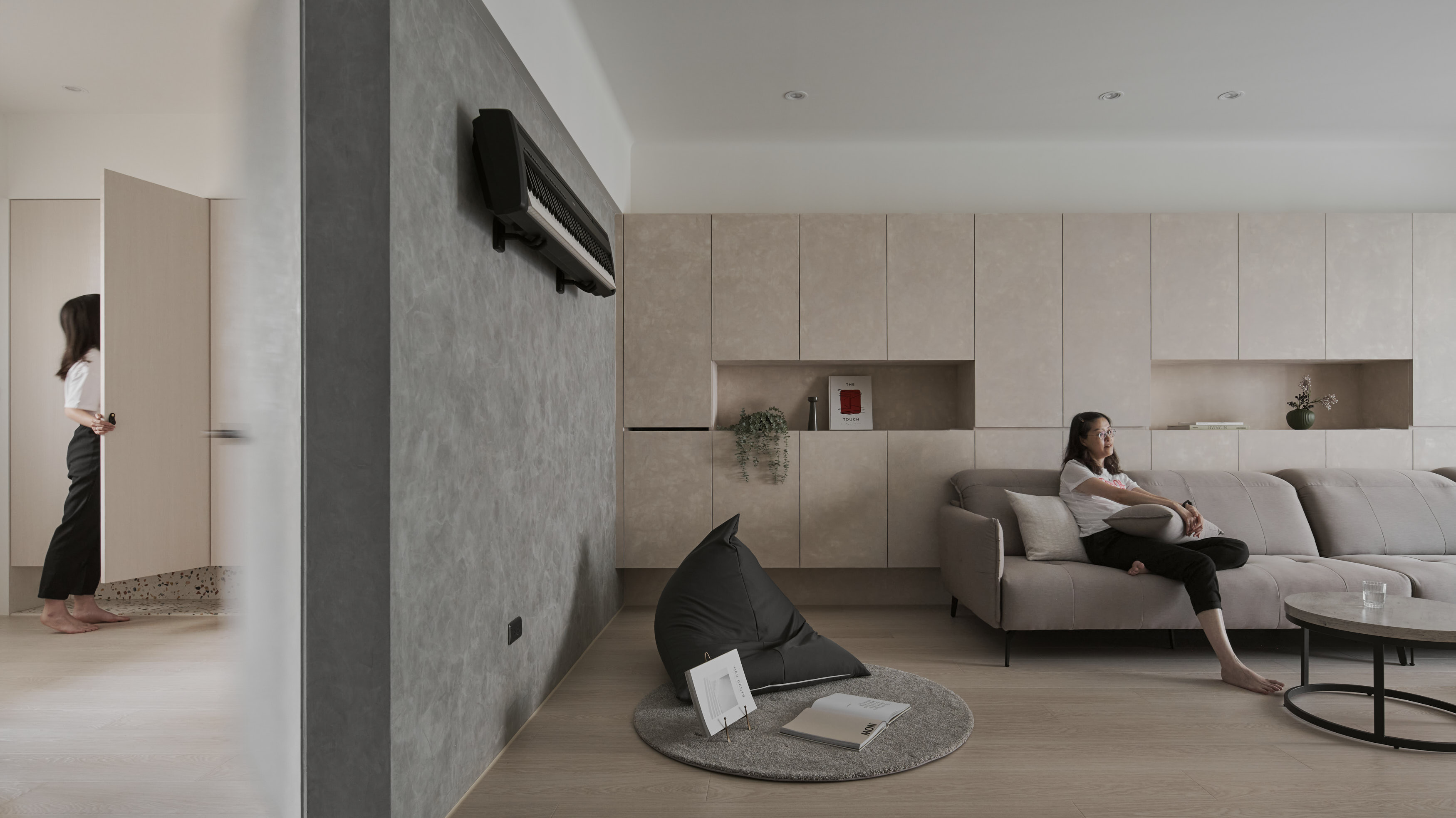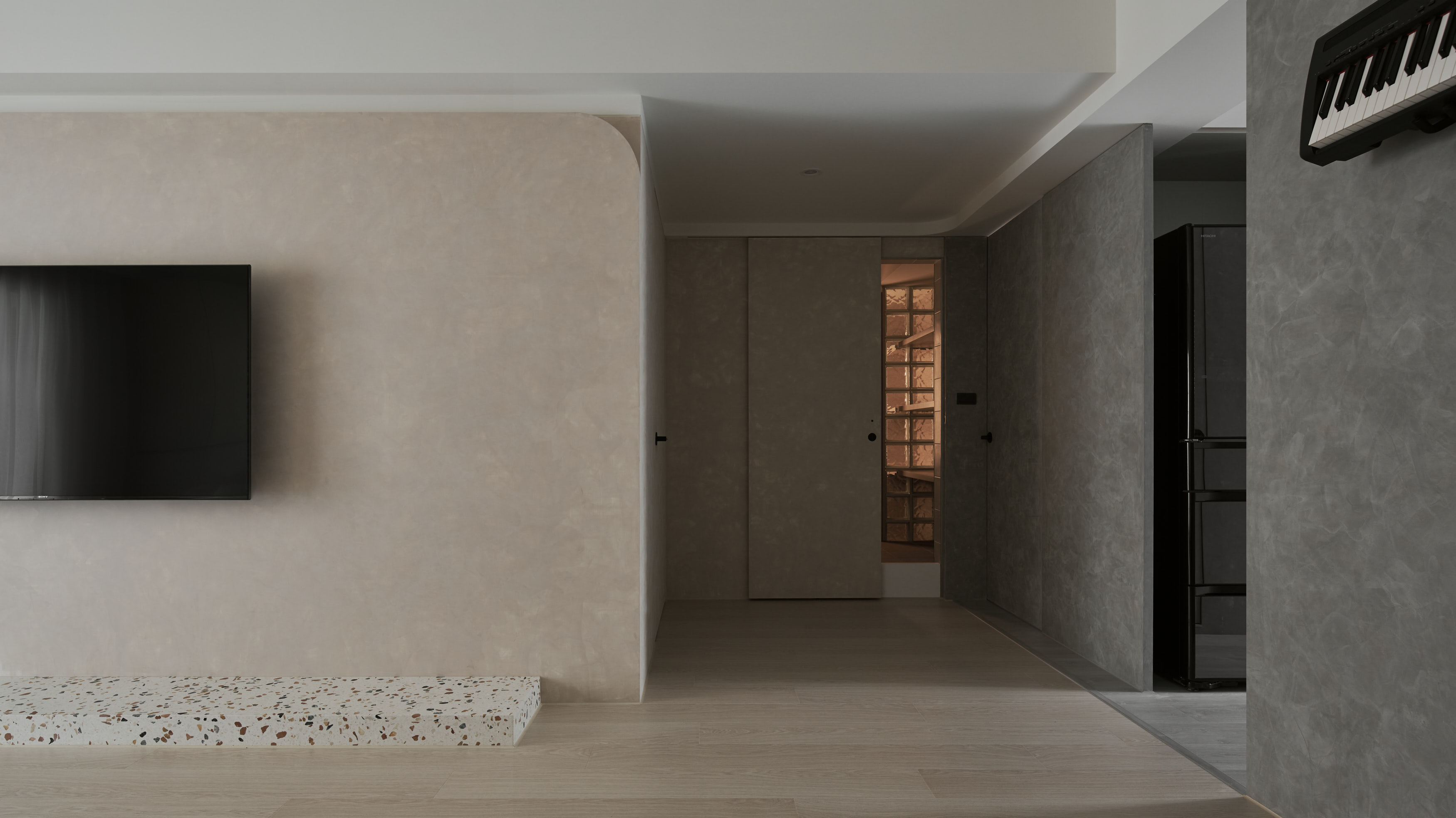 電視主牆奶茶色塗料搭配水磨石檯面,營造復古和諧氛圍。廚房區域立面簡約展示,電子琴成為亮點,灰階調和原奶茶色,特殊紋理延伸,打造平衡和諧的雙色設計,不與設備衝突。