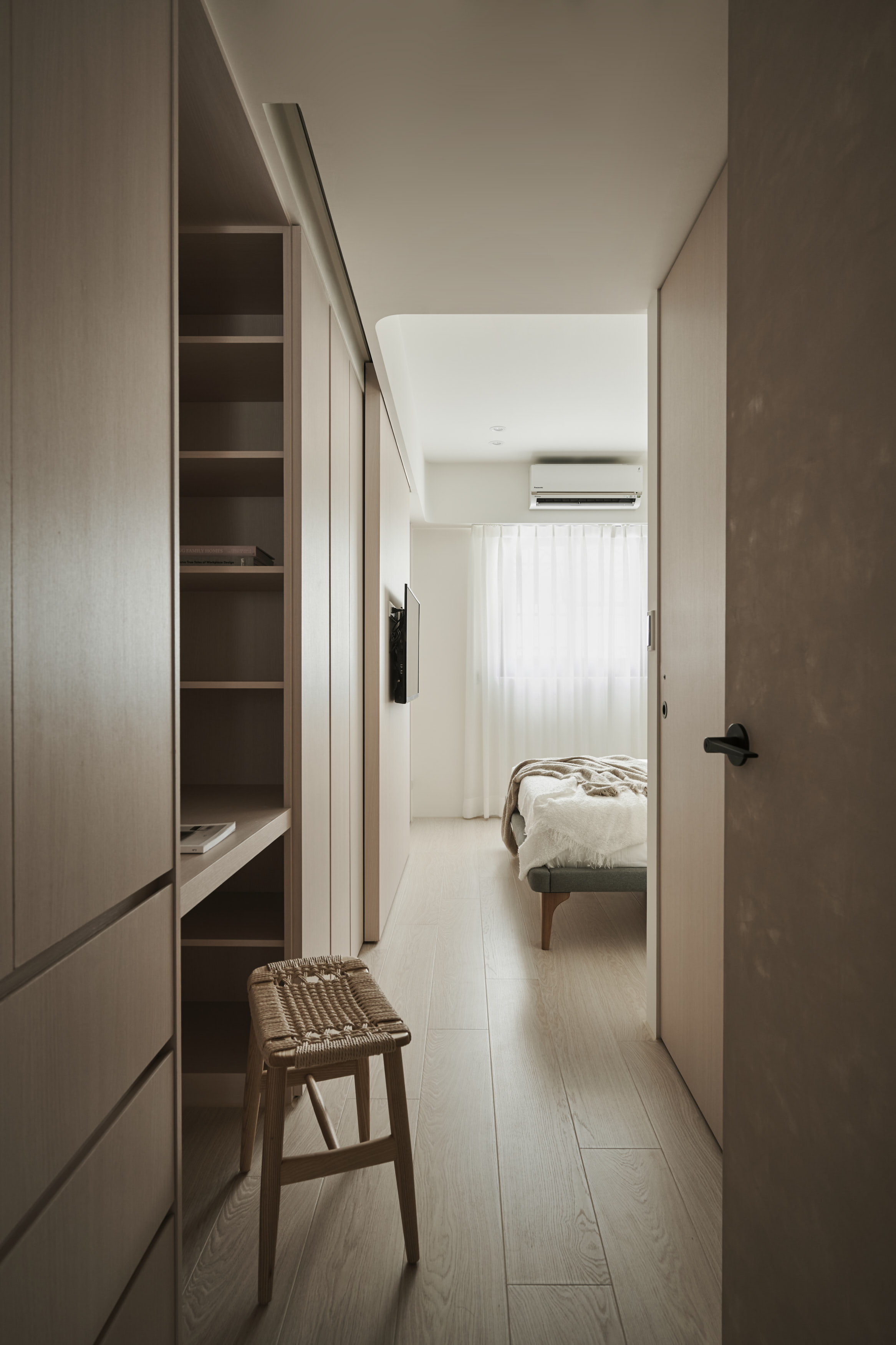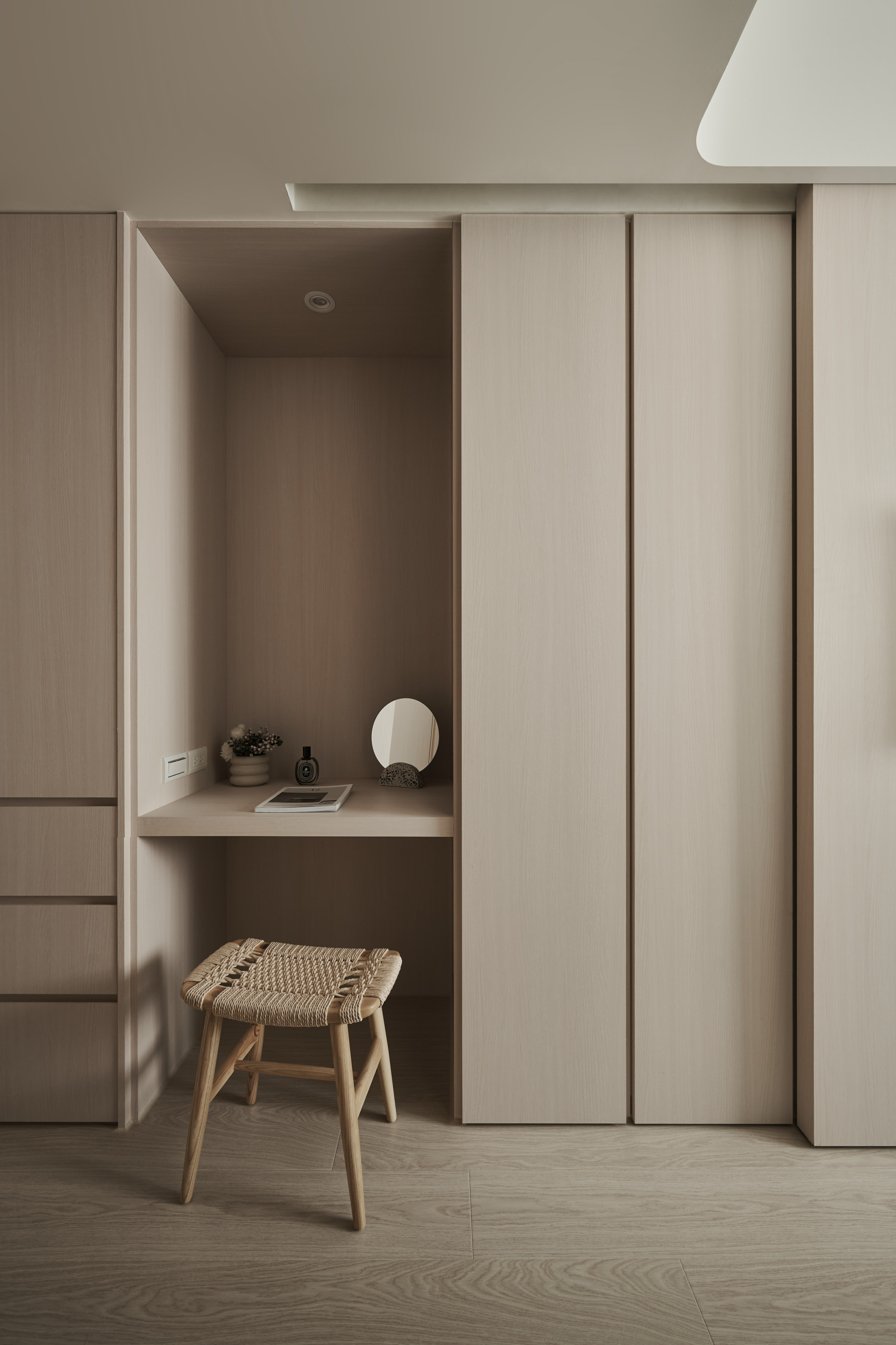 主臥空間存在一只大樑,順勢在底部鋪排櫃體,並融入電視牆設計、化妝台空間,透過一體成型的流暢畫面,讓人完全忘記結構的壓迫感,又獲得所需的生活機能。