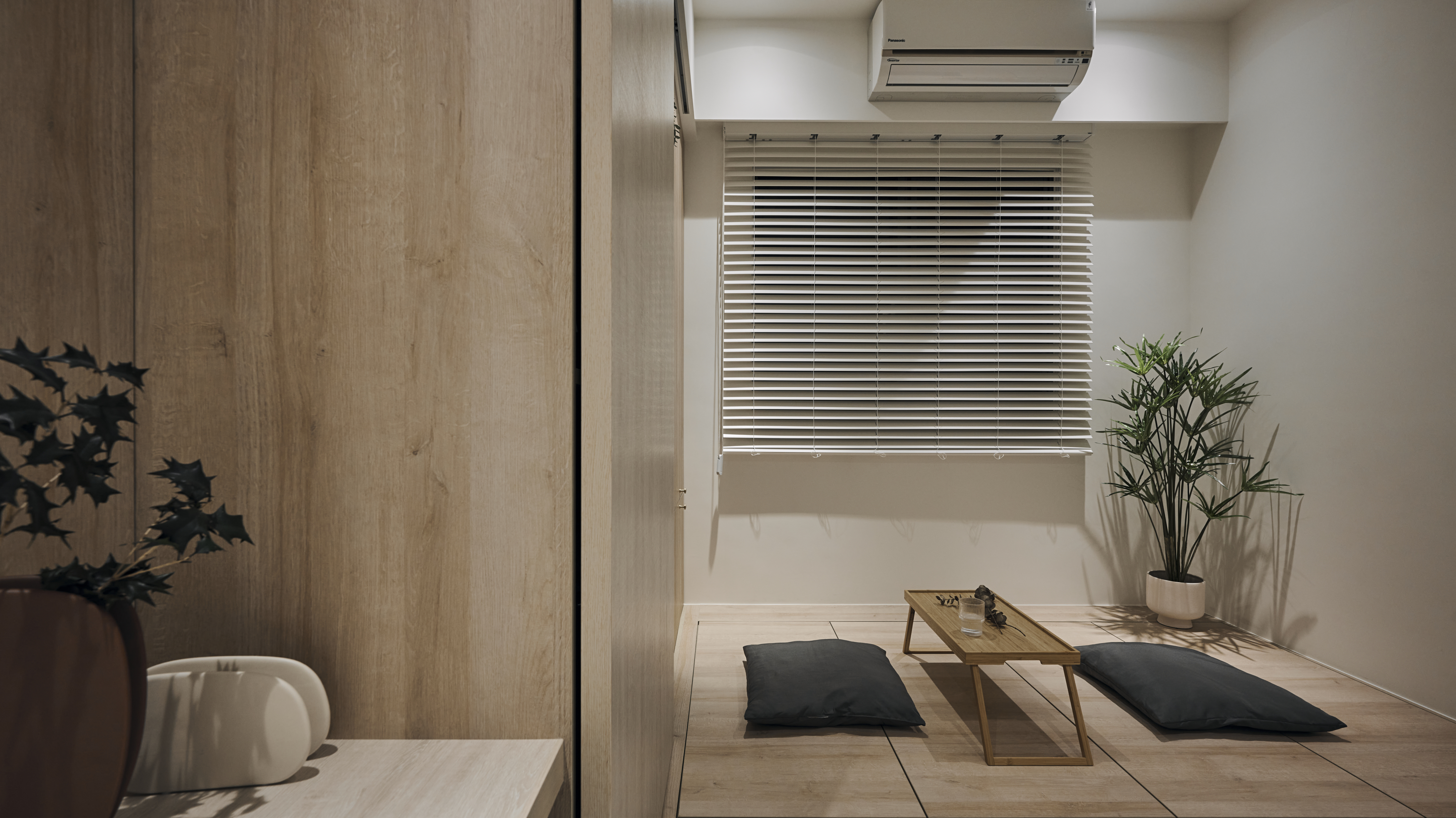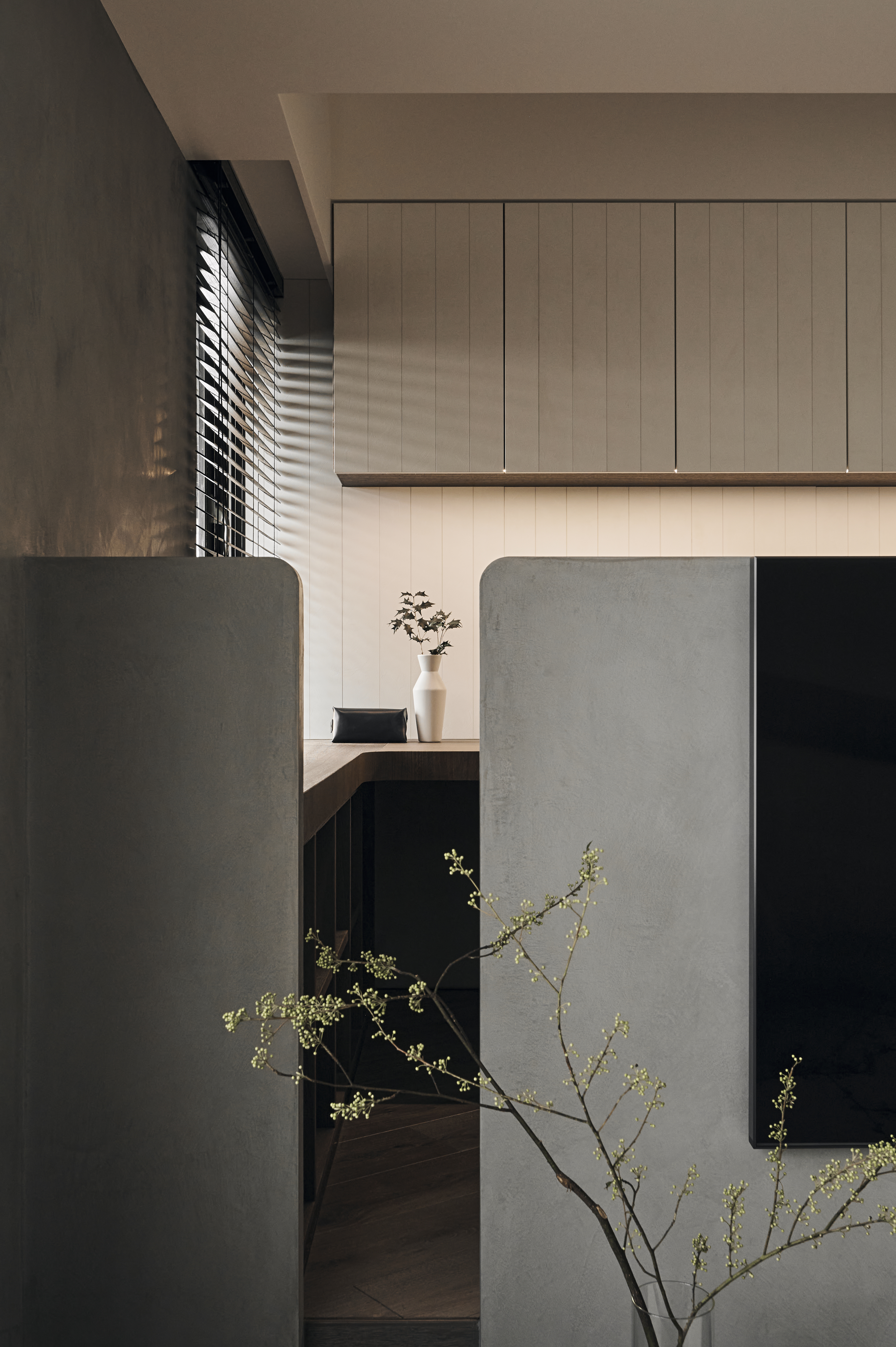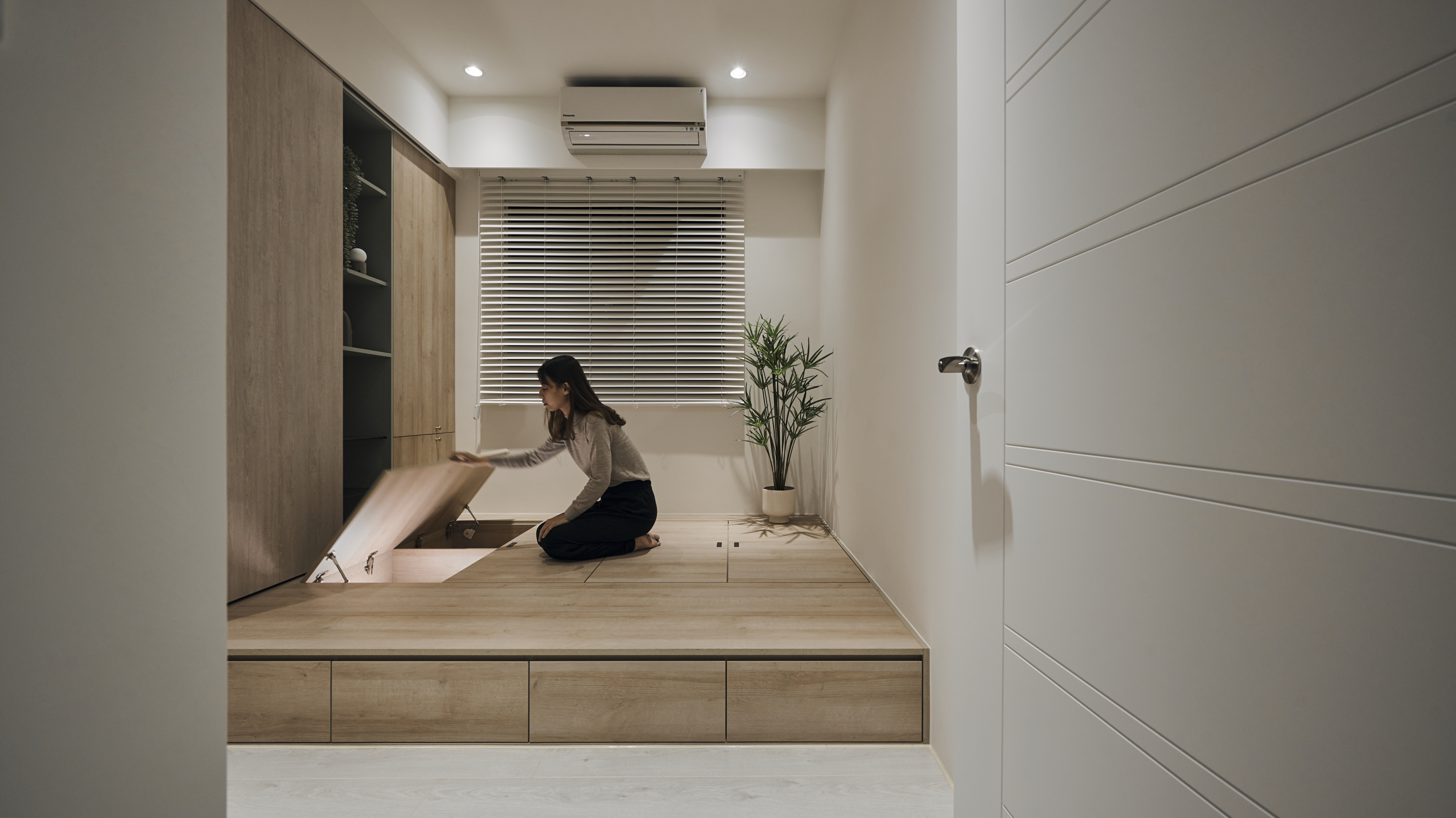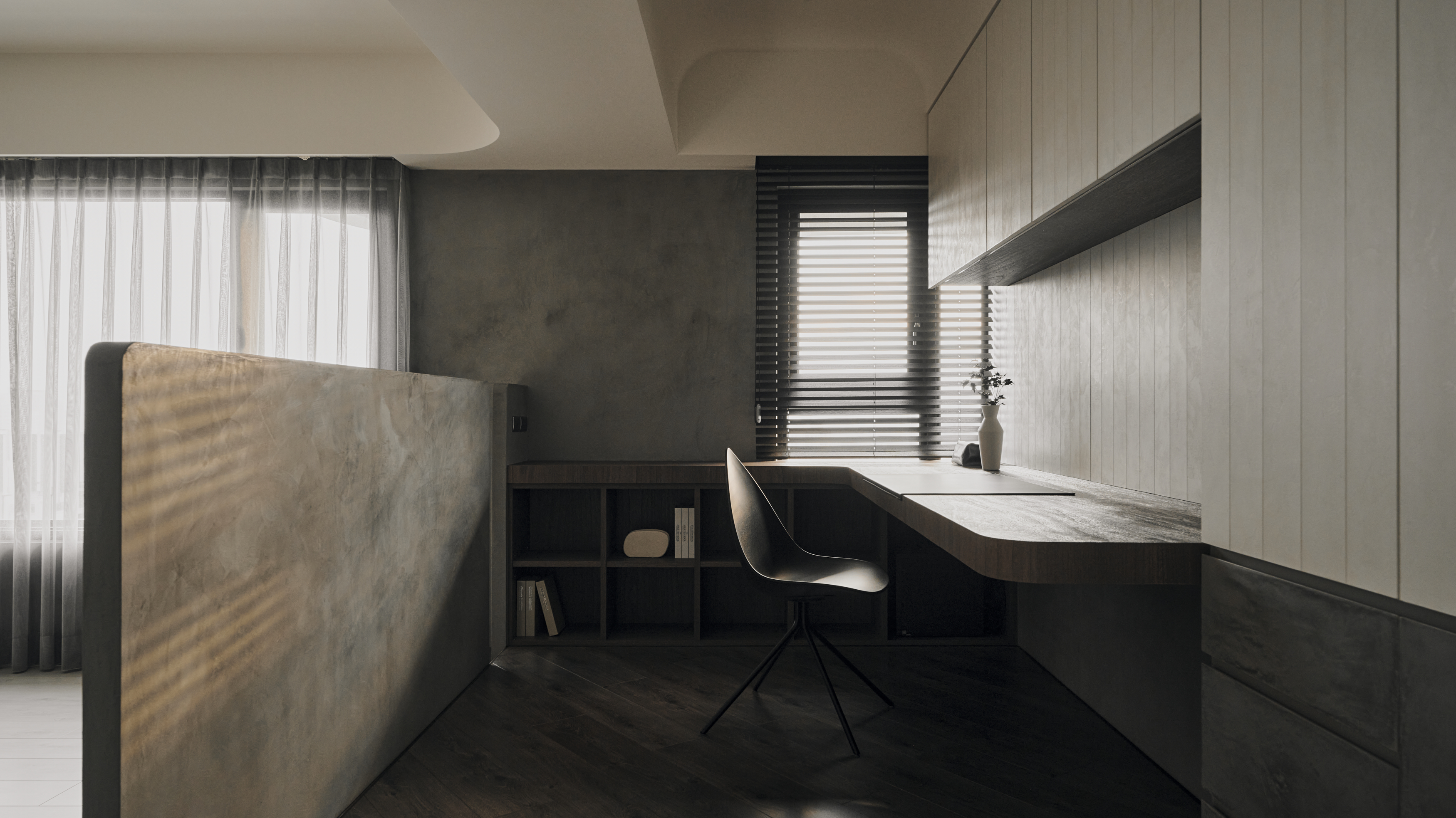 玄關起始,貫穿整面壁面打造收納櫃體,直至客廳的沙發背牆。電視牆採用半高方式,區分客廳與架高書房區,呈現不置頂、輕盈的立面手法,打造開闊室內格局。深色木質的架高書房區,特製L型、導弧形邊角桌體,充分運用空間,營造舒適的閱讀環境。同時,利用樑下空間增添收納功能,深淺色系展現漸層視覺效果。