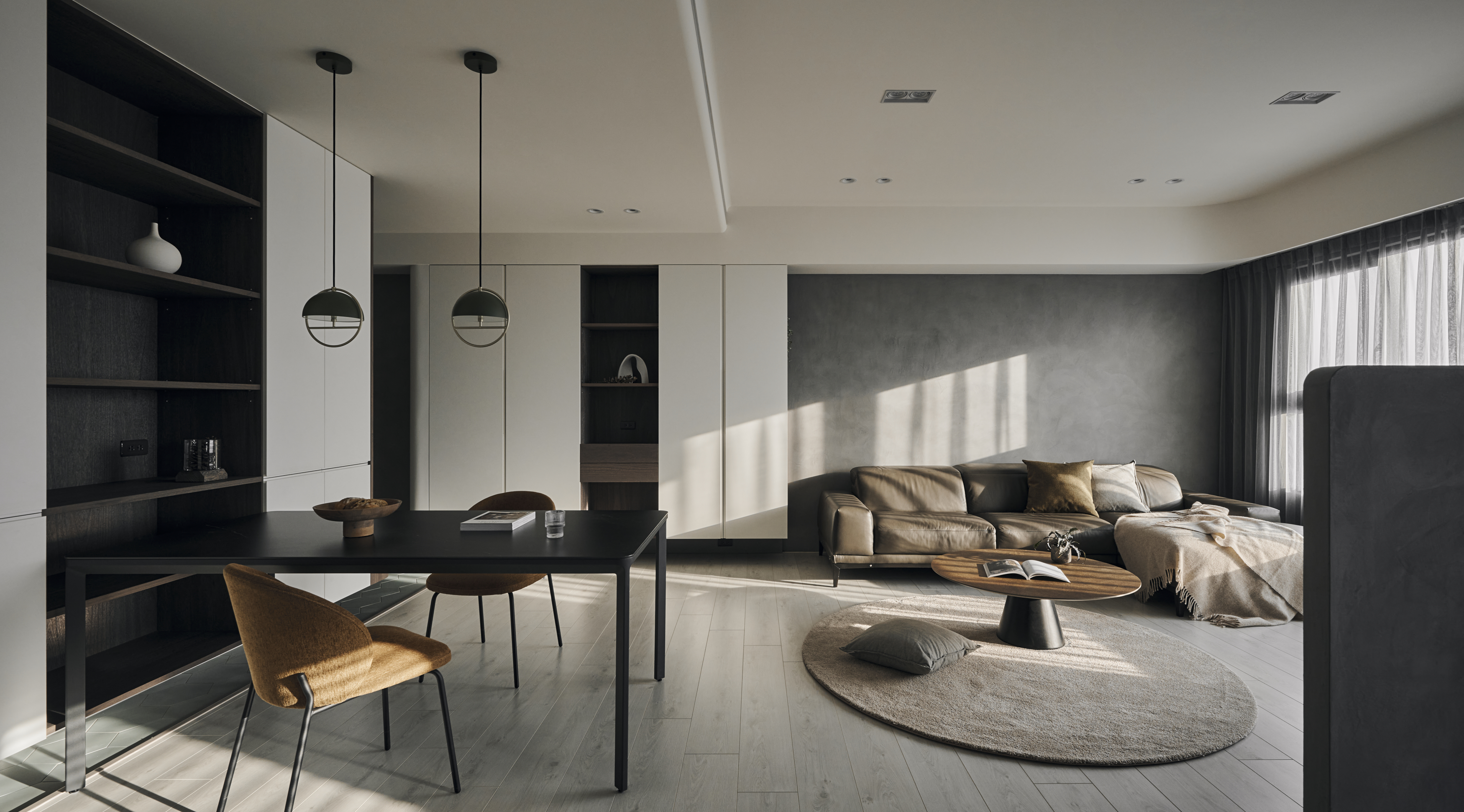 透過現代感為基調,揉入深灰色塗料為基底,以深色油桐木為主體,搭佐Natuzzi沙發、Boconcept餐椅及私領域的Louis Poulsen PH5 Mini吊燈,創造沉穩的時尚質感