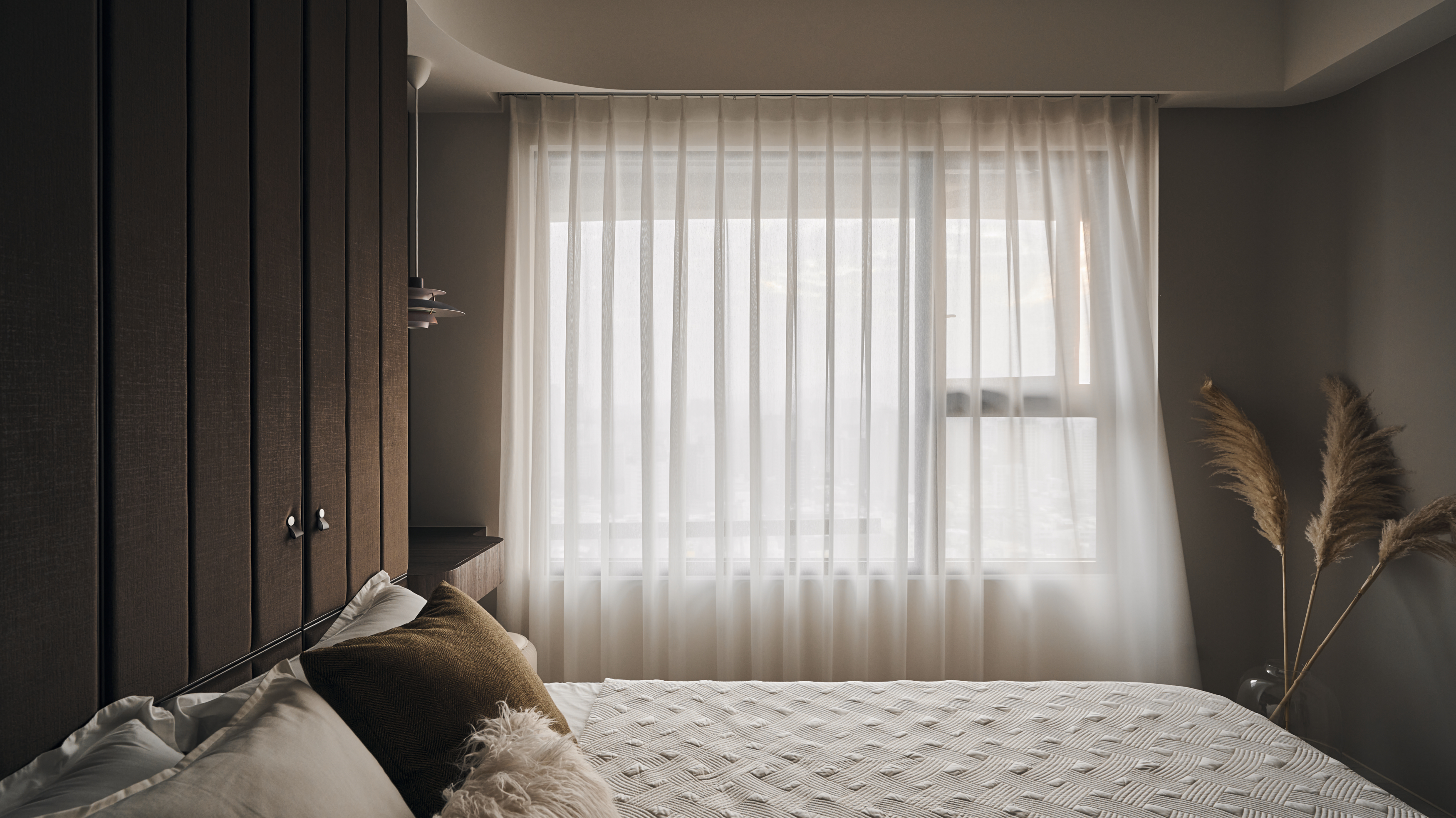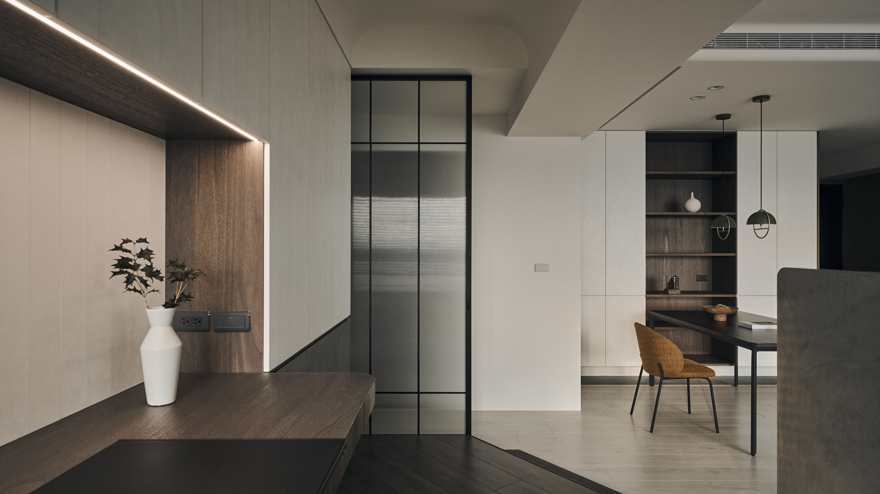 夜幕將至的景色象徵布料,揉入深灰色塗料為基底,搭佐亮色軟裝,呼應配件點綴的效果。室內隔間將所有的量體降低,透過顏色與選材營造出空間氛圍。將窗景帶進室內,讓空間自然的流動呼吸,既安定又溫暖人心,隨時能回歸質樸的生活。