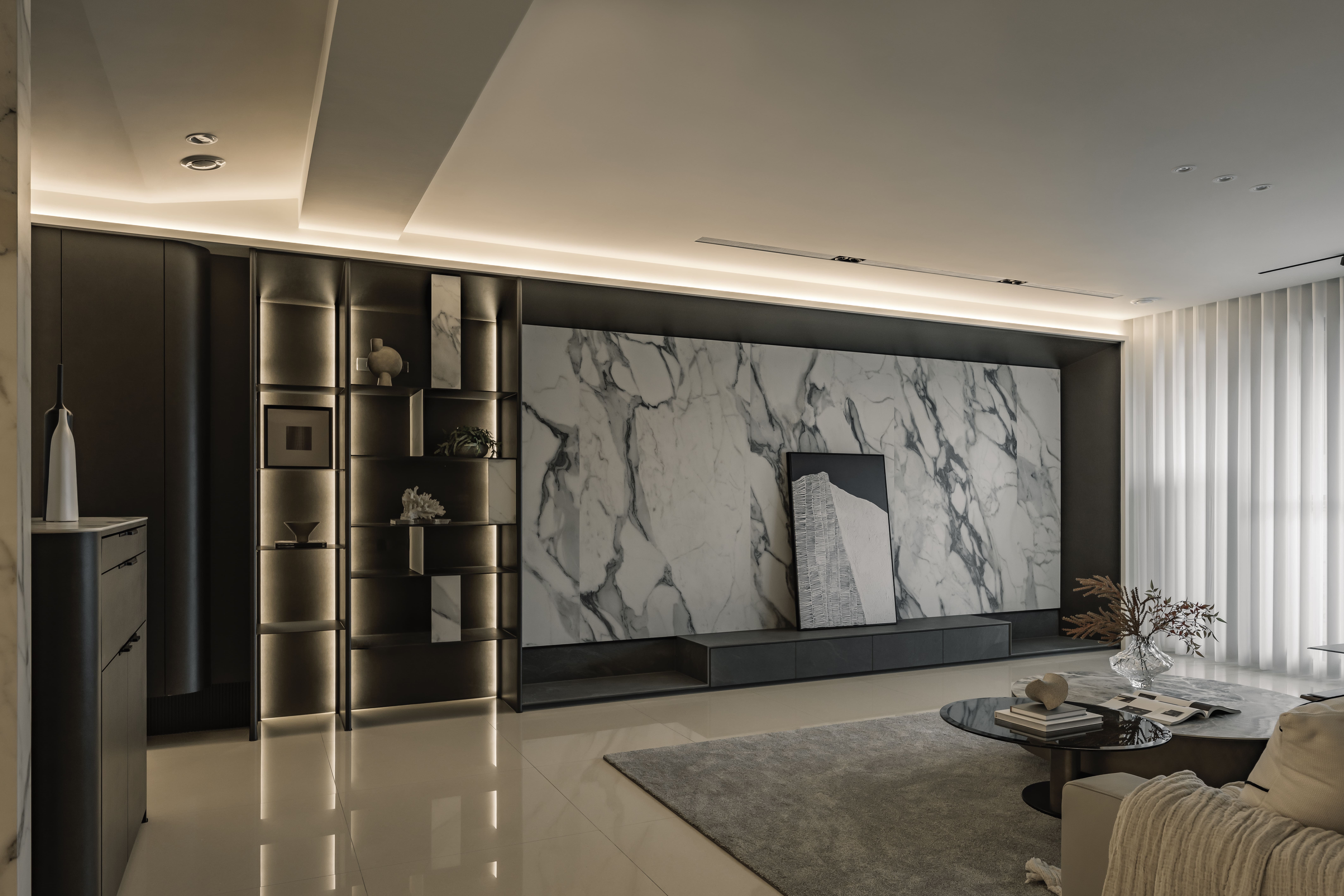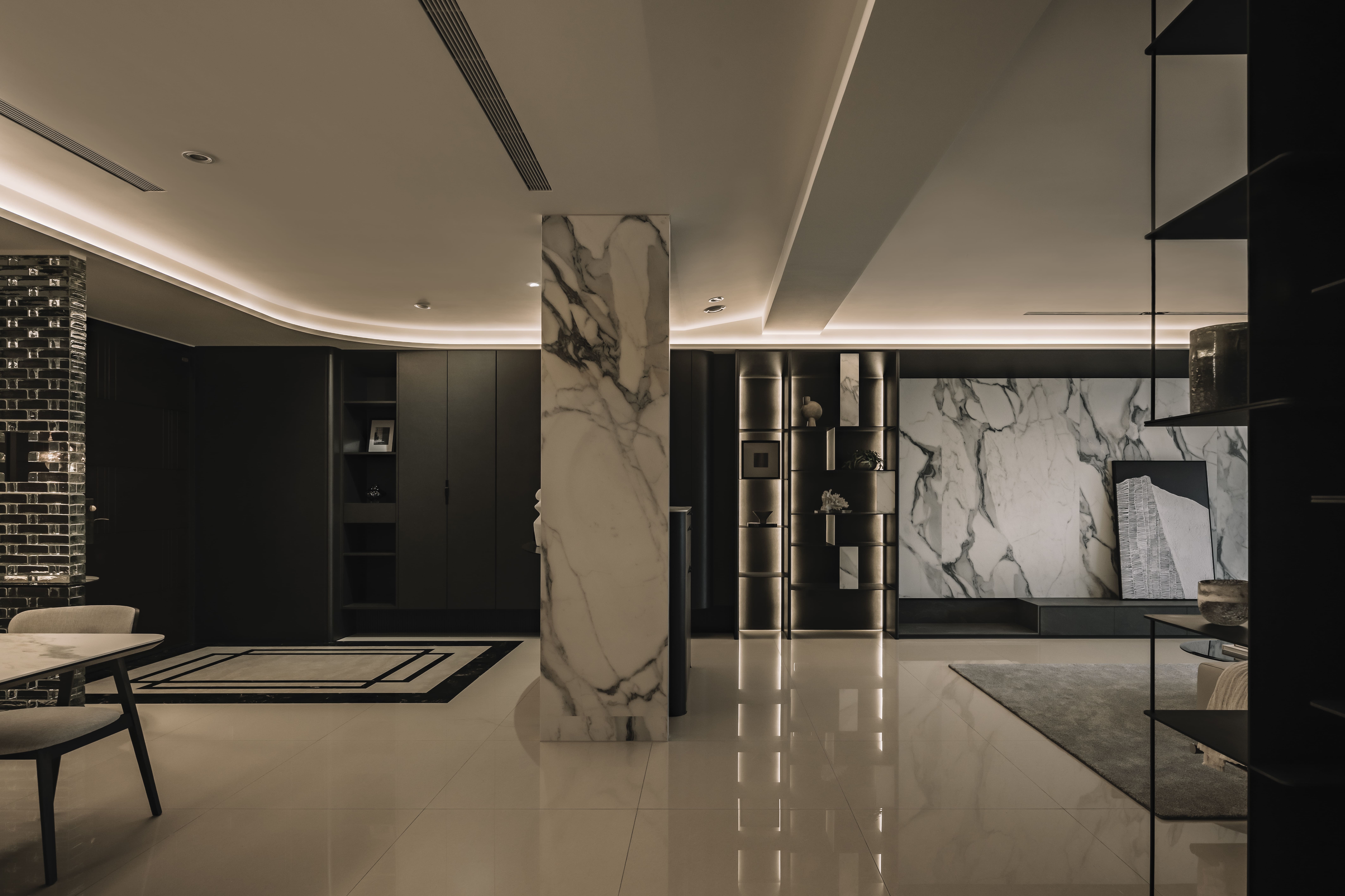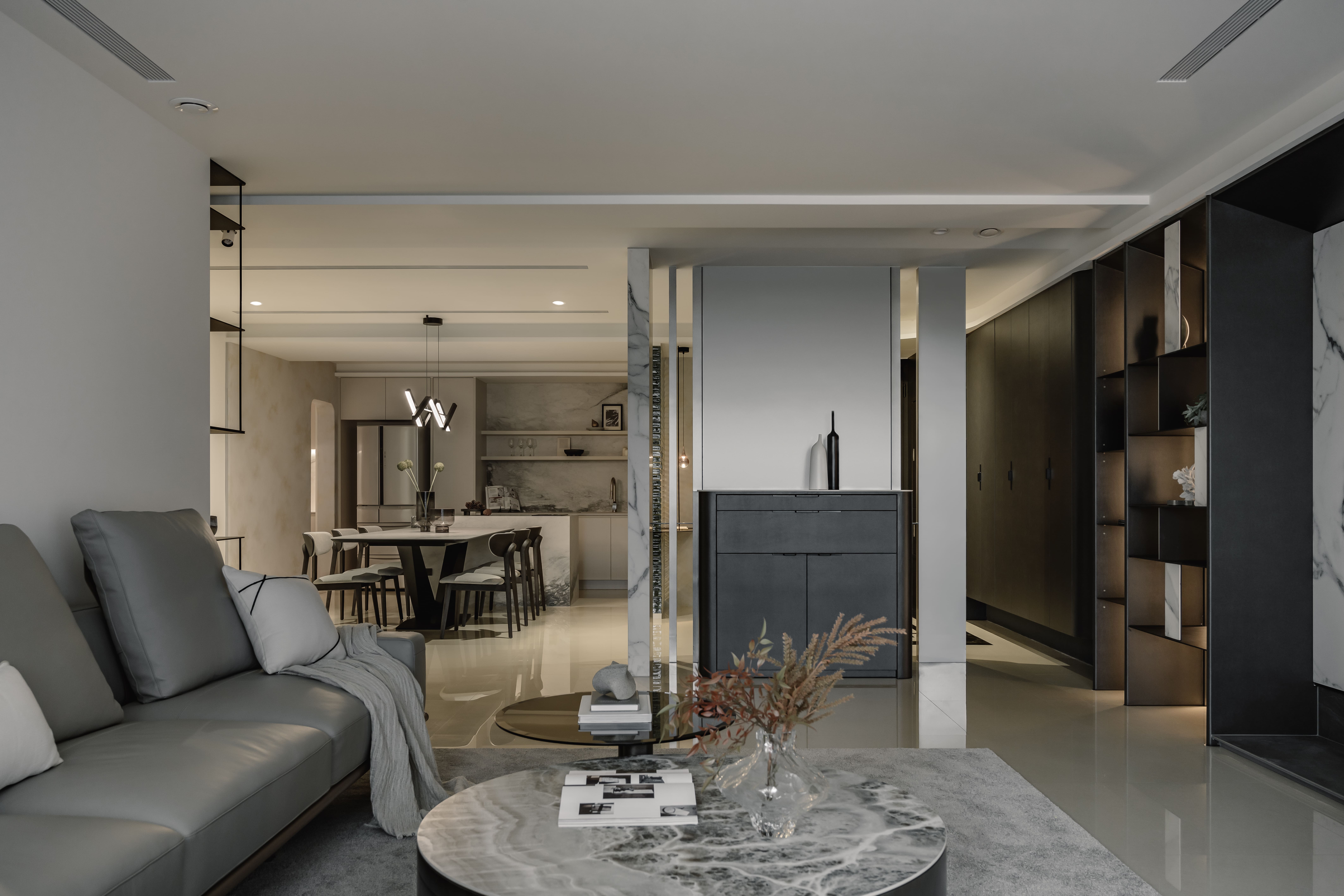 设计选材:以黑白概念為基調,大理石與不鏽鋼貼附牆體,保有線性穿透。電視牆與玄關櫃同立面,連結黑色收納櫃與鐵件展示櫃,虛化厚重牆感。延伸至餐廚,水光波玻璃磚創造冷冽美感,金屬燈具點綴,注入戲劇性魅力。