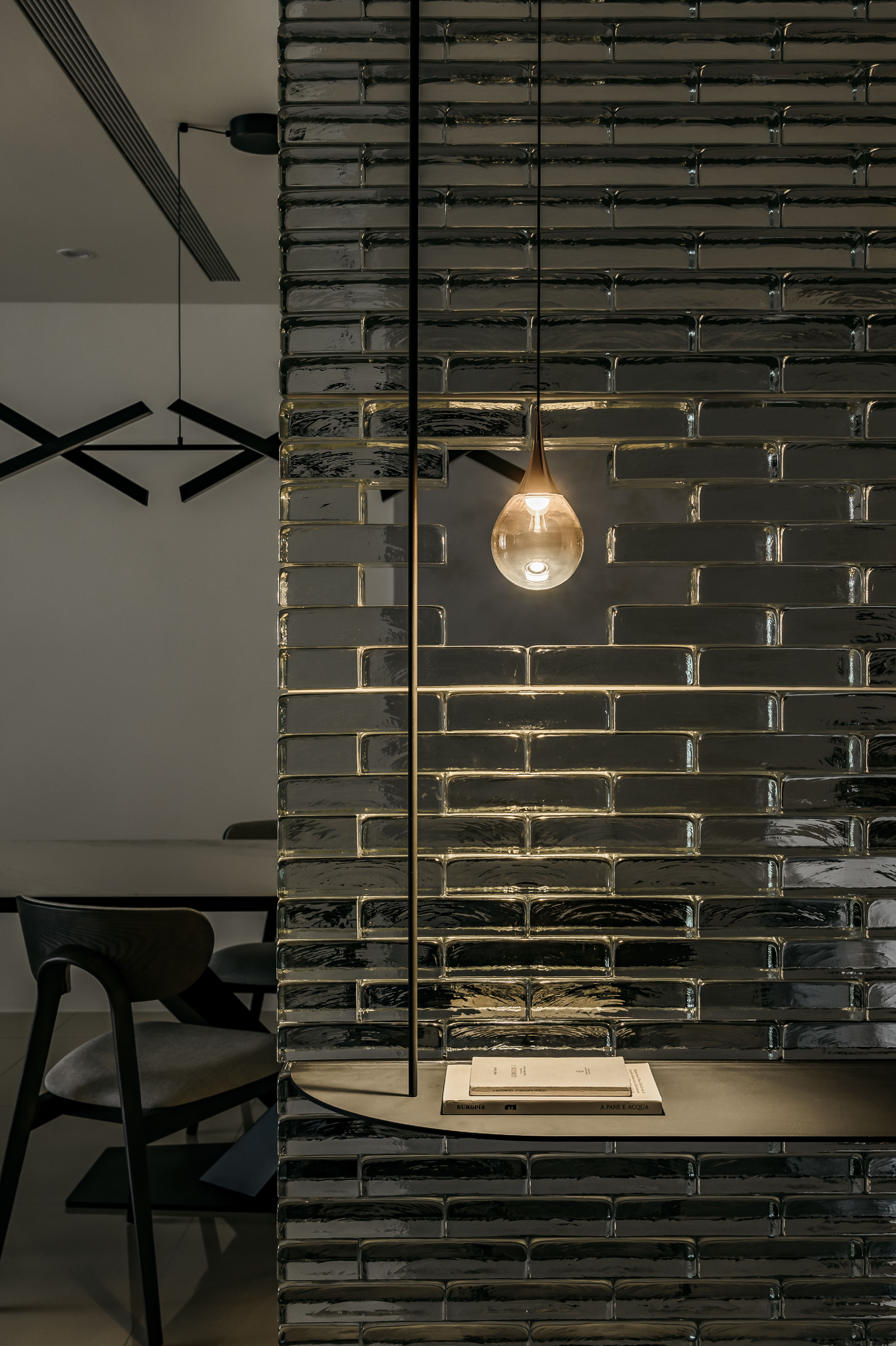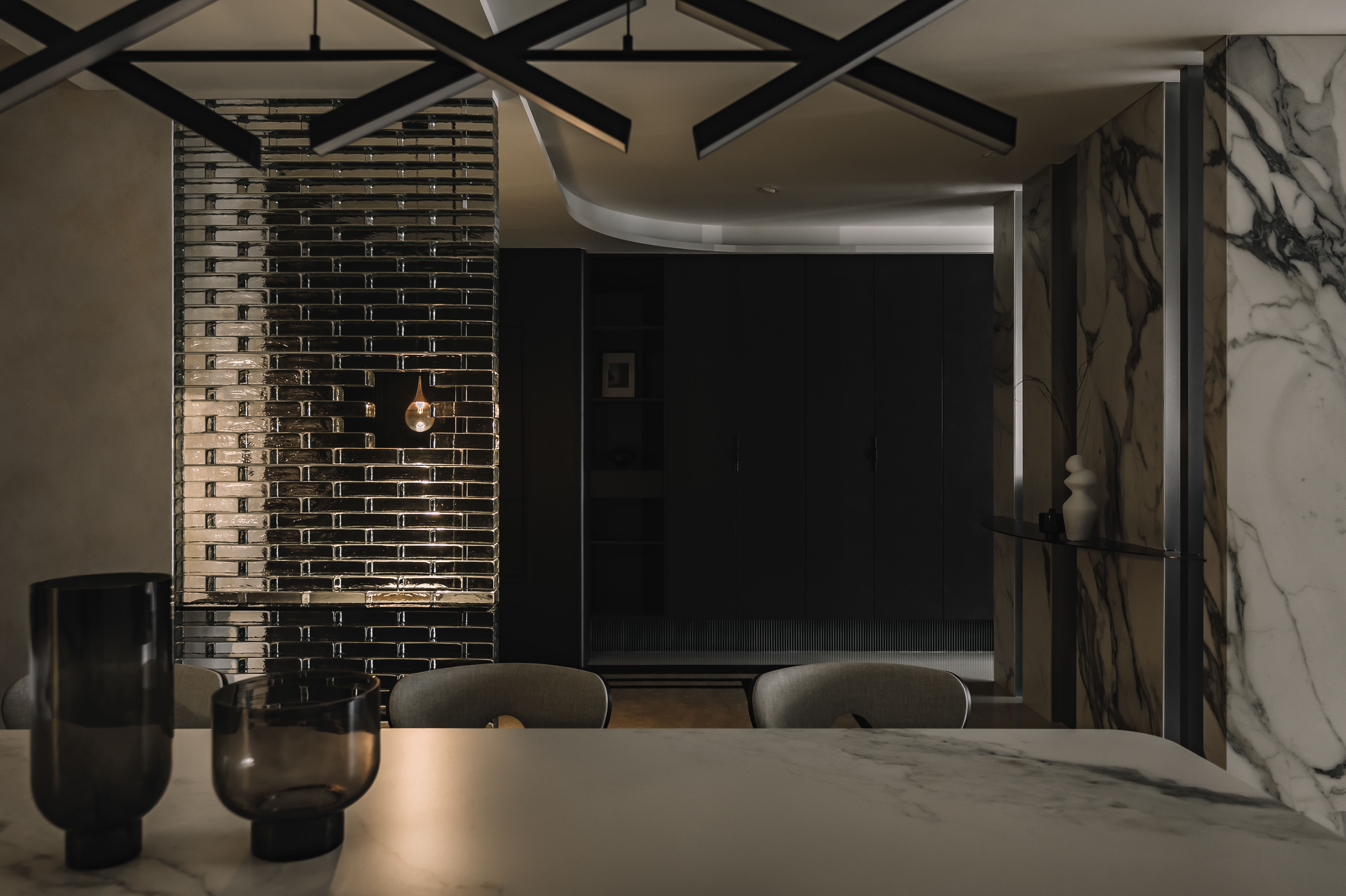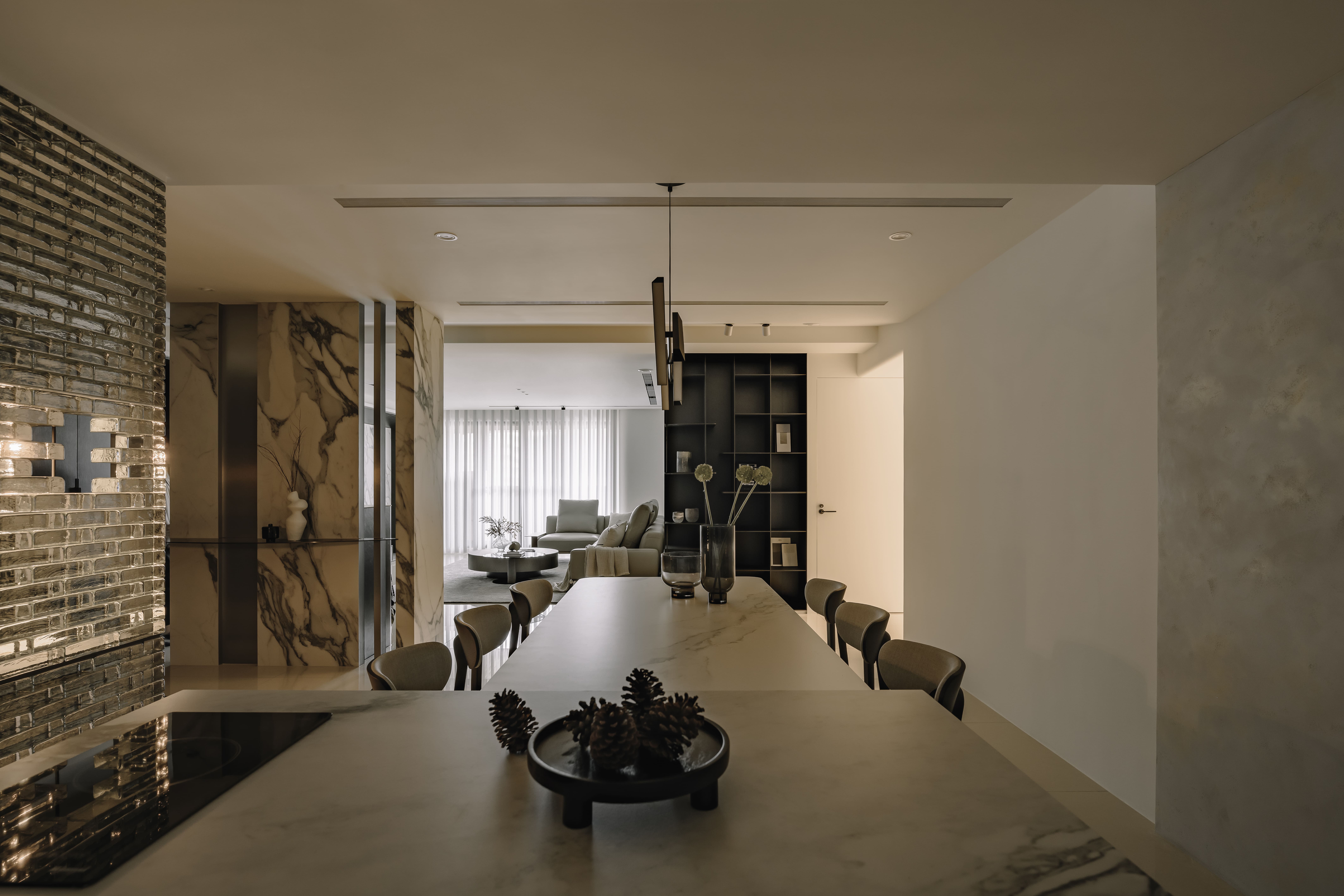 设计选材:以黑白概念為基調,大理石與不鏽鋼貼附牆體,保有線性穿透。電視牆與玄關櫃同立面,連結黑色收納櫃與鐵件展示櫃,虛化厚重牆感。延伸至餐廚,水光波玻璃磚創造冷冽美感,金屬燈具點綴,注入戲劇性魅力。