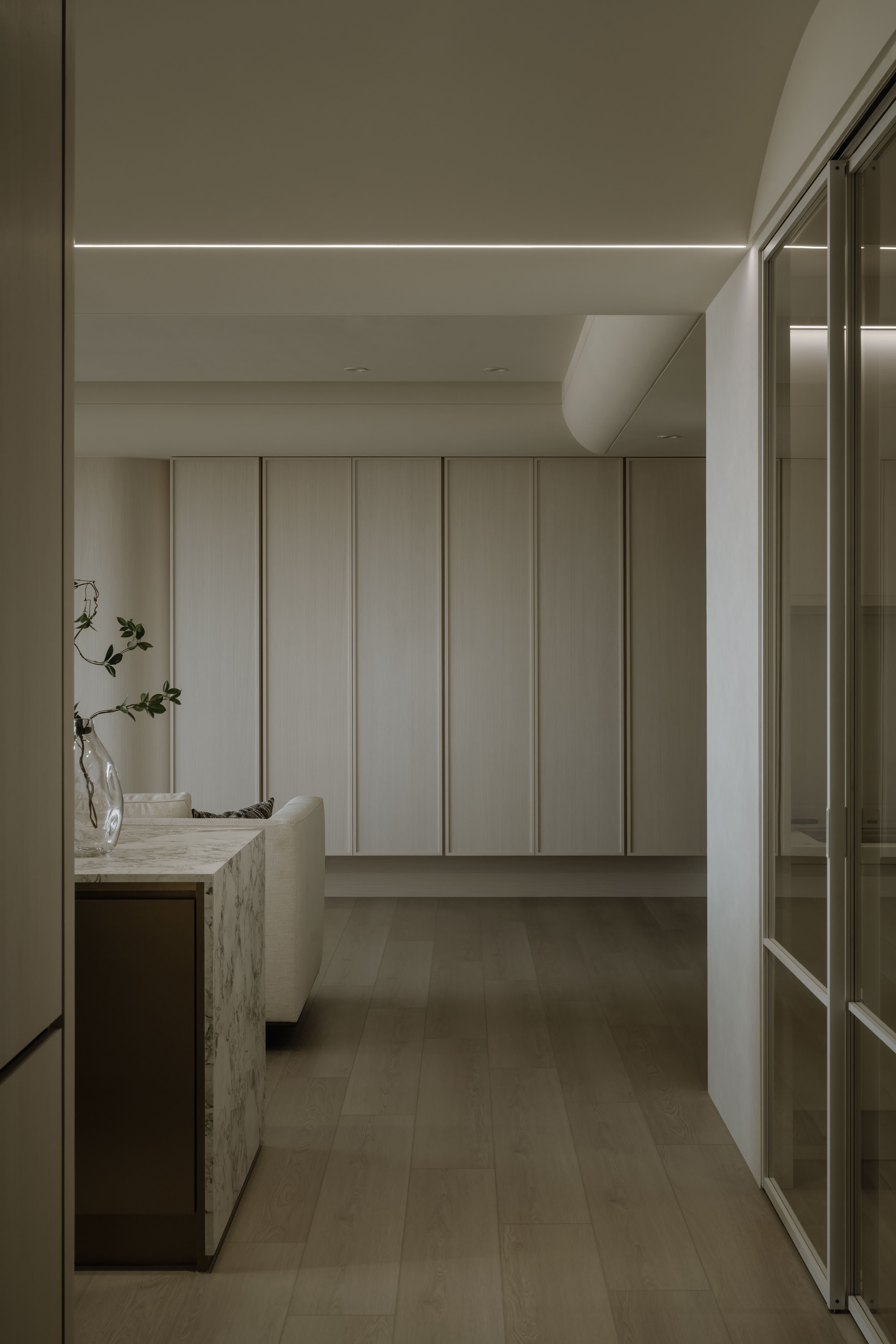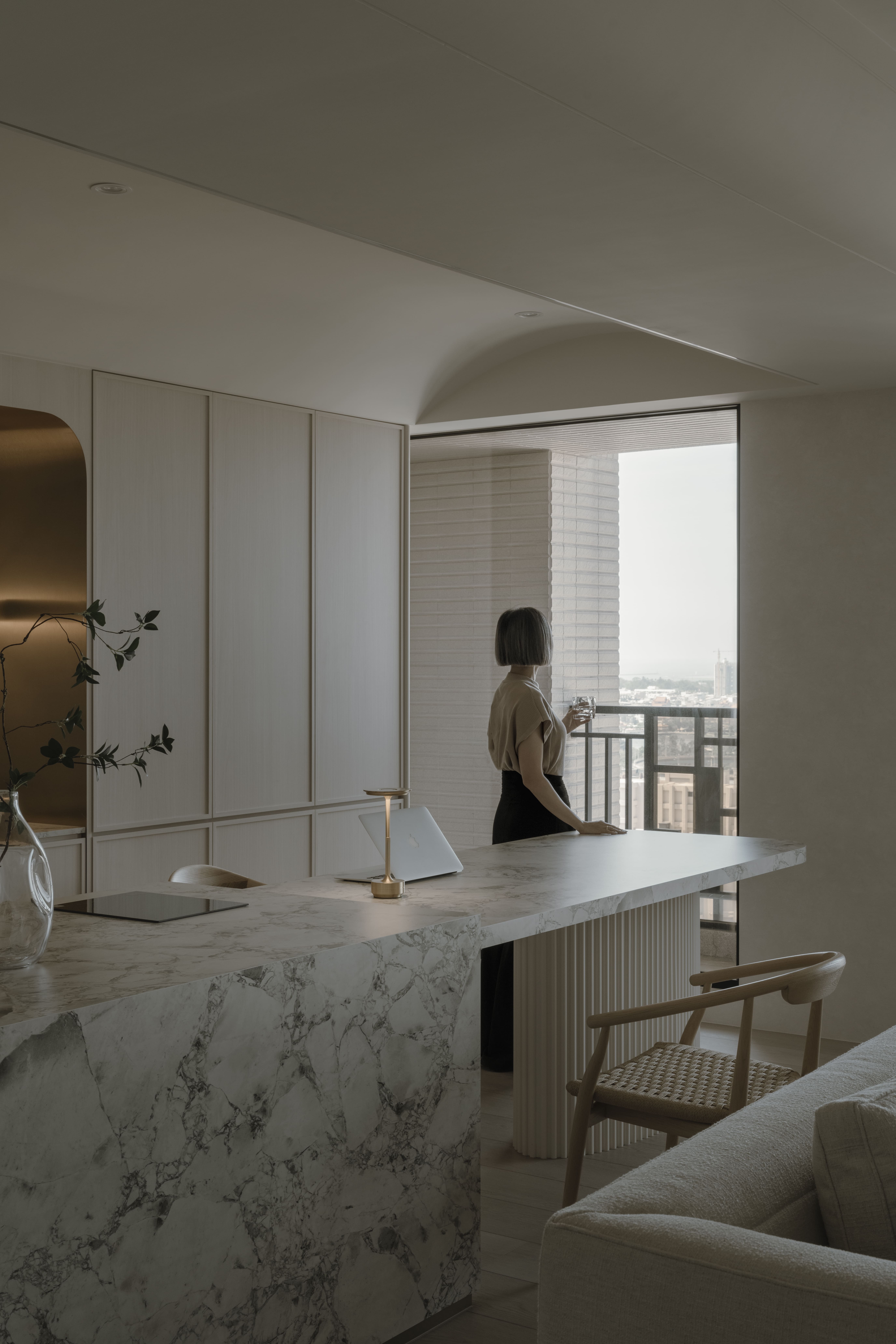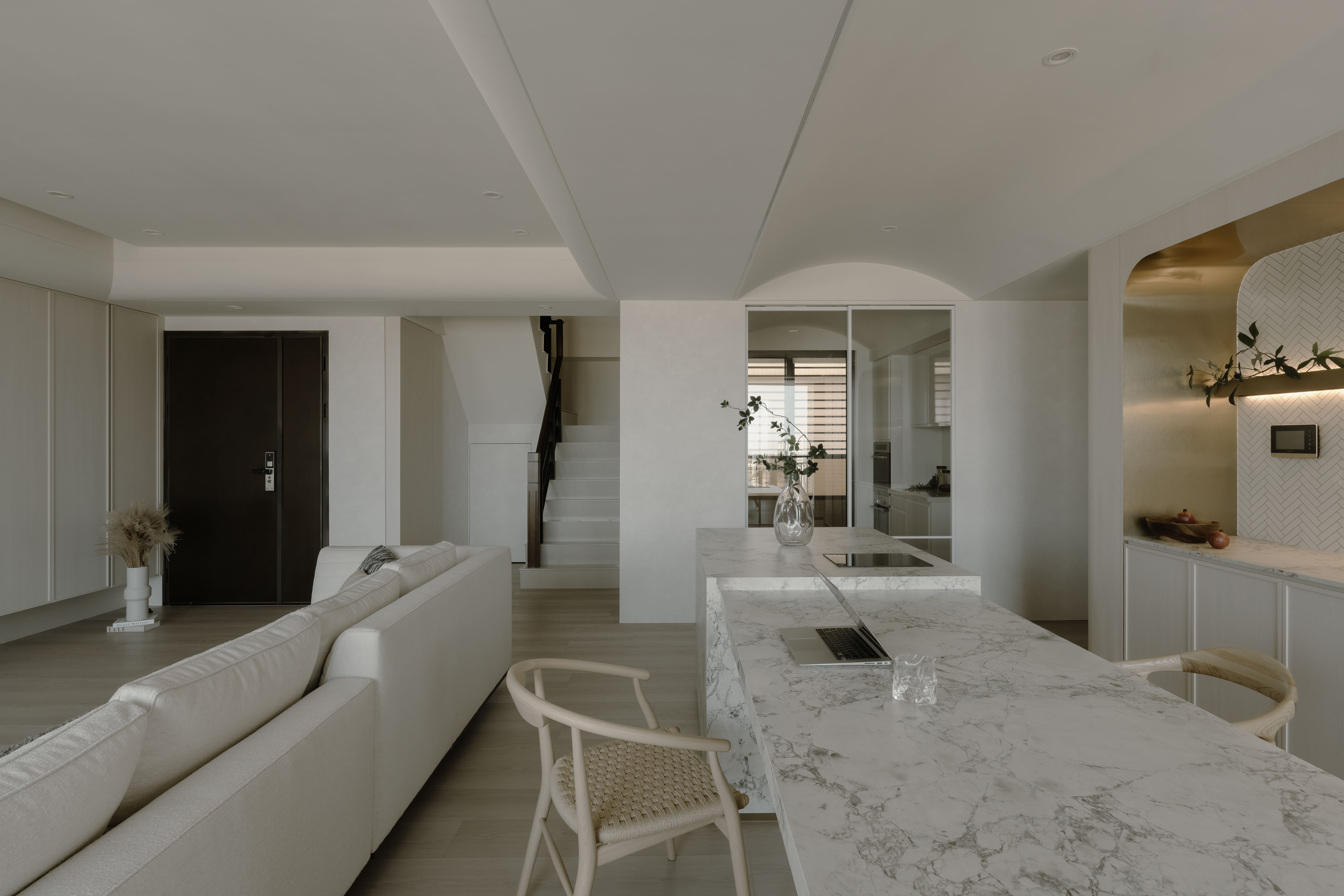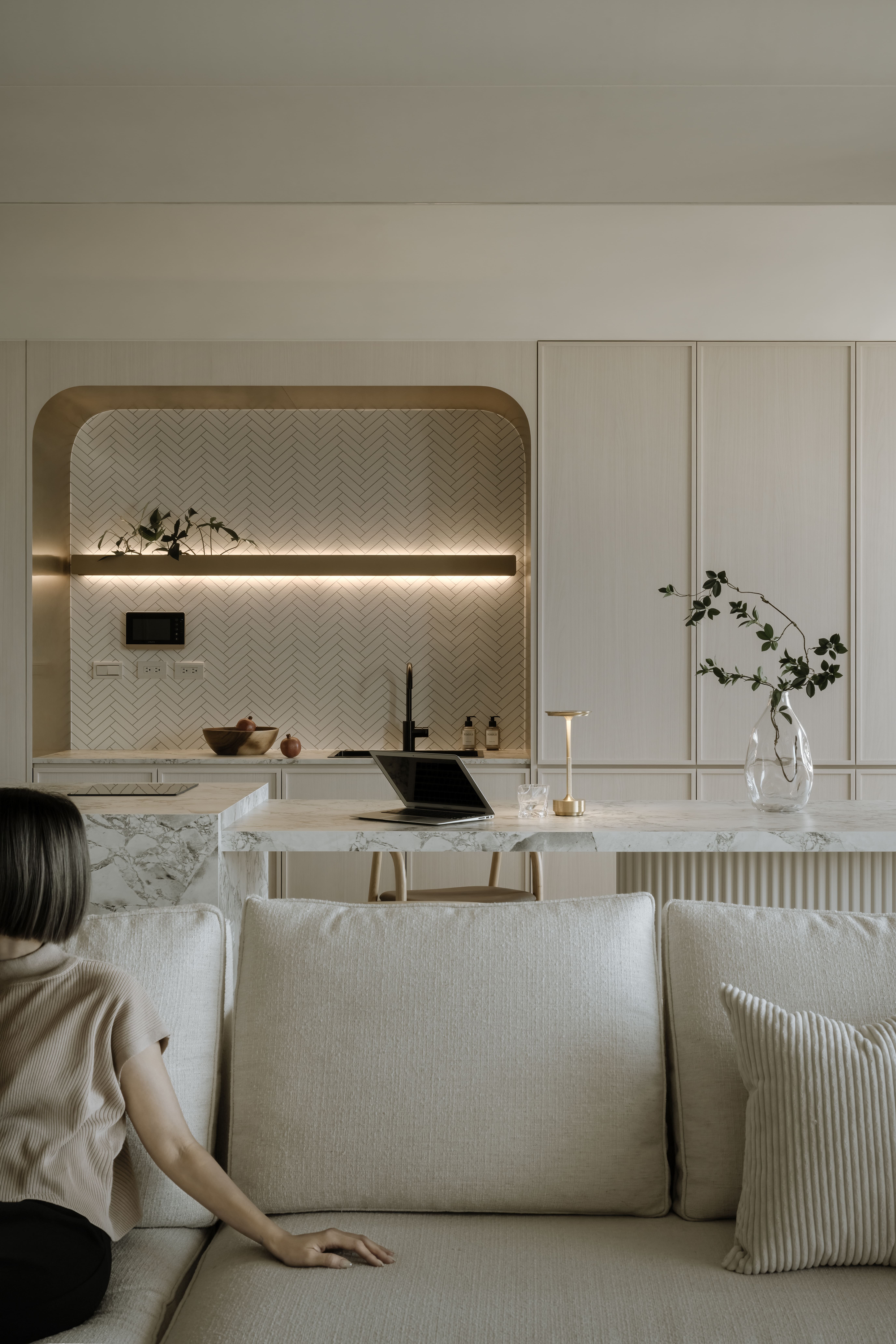 项目定位:業主偏好淡雅色彩,因此設計以米色、淺灰、乳白為主,搭配木質元素,營造乾淨寧靜且溫馨的氛圍。空間布局採開放設計,透過大面積玻璃窗引入自然光,增強通透感與明亮度。中島區成為中心,兼具儲物與社交功能,連接餐廳與客廳,提升空間流動性。