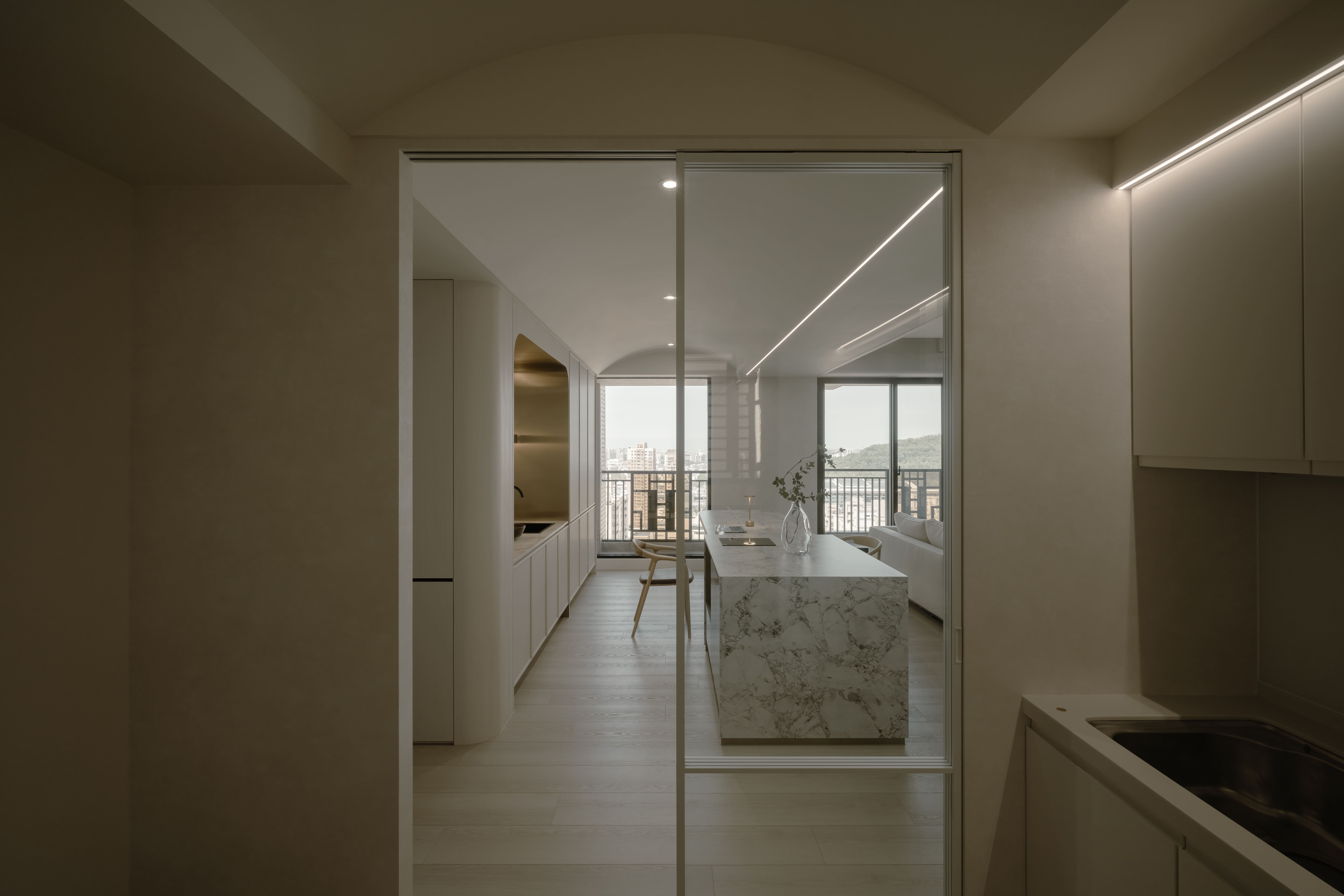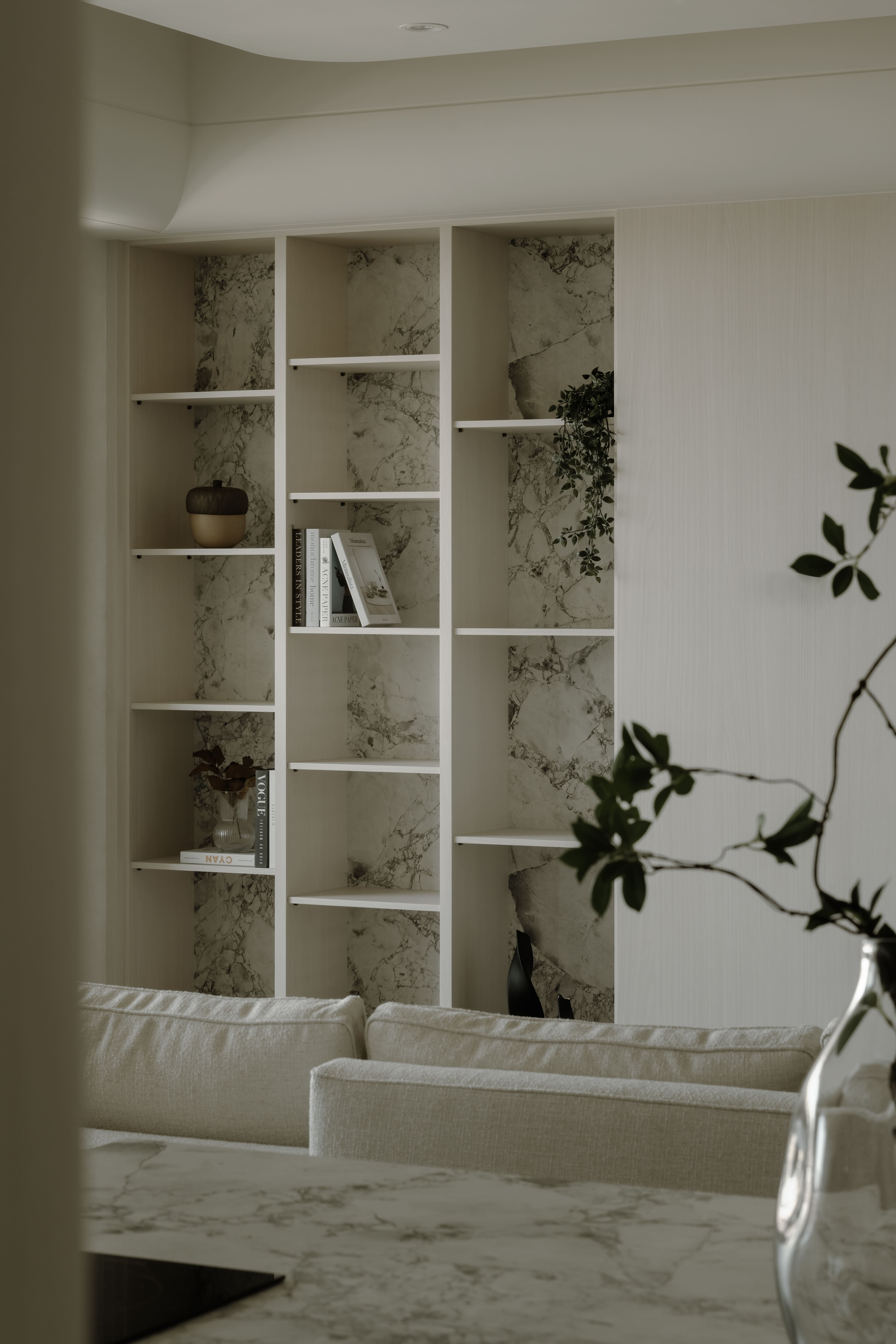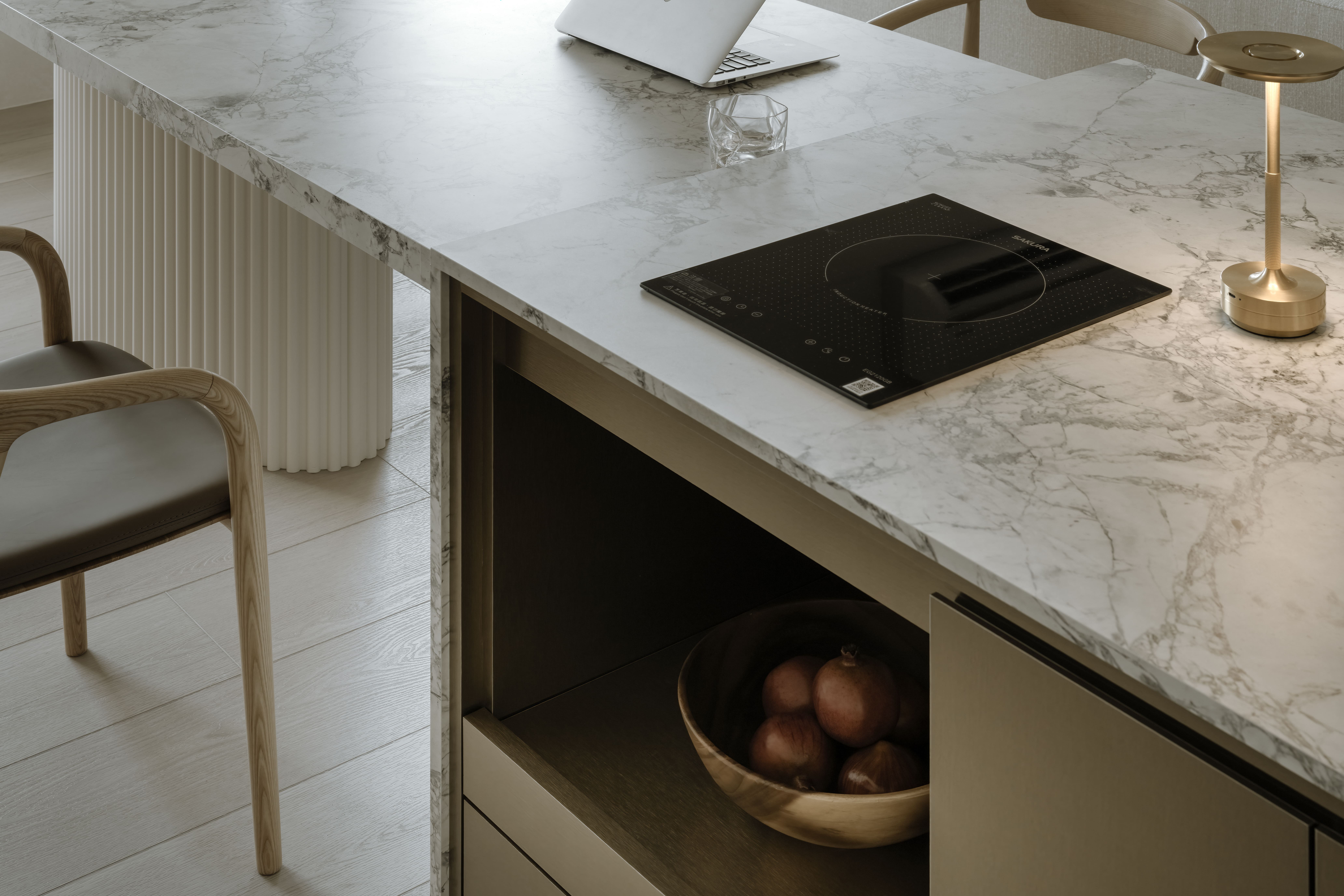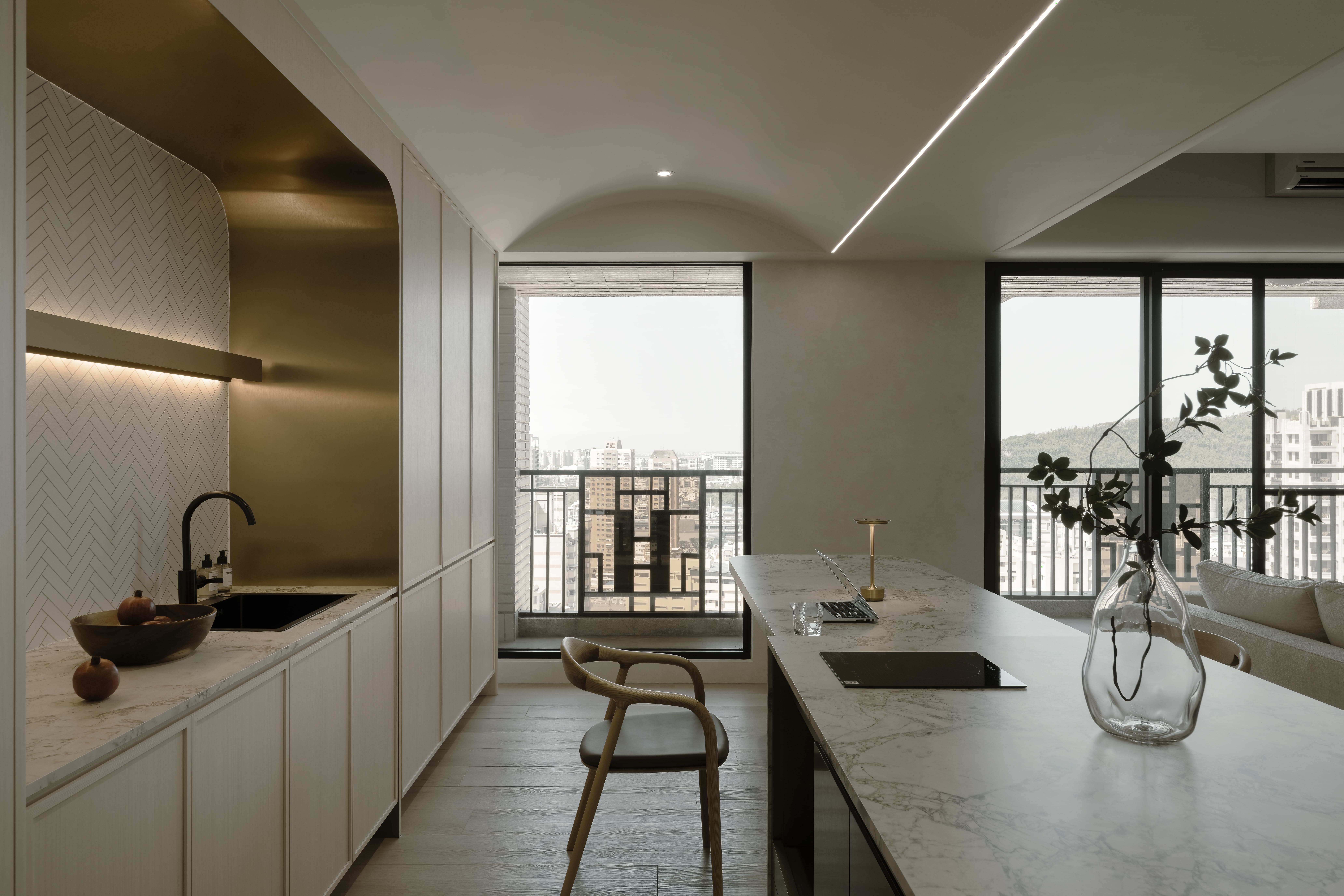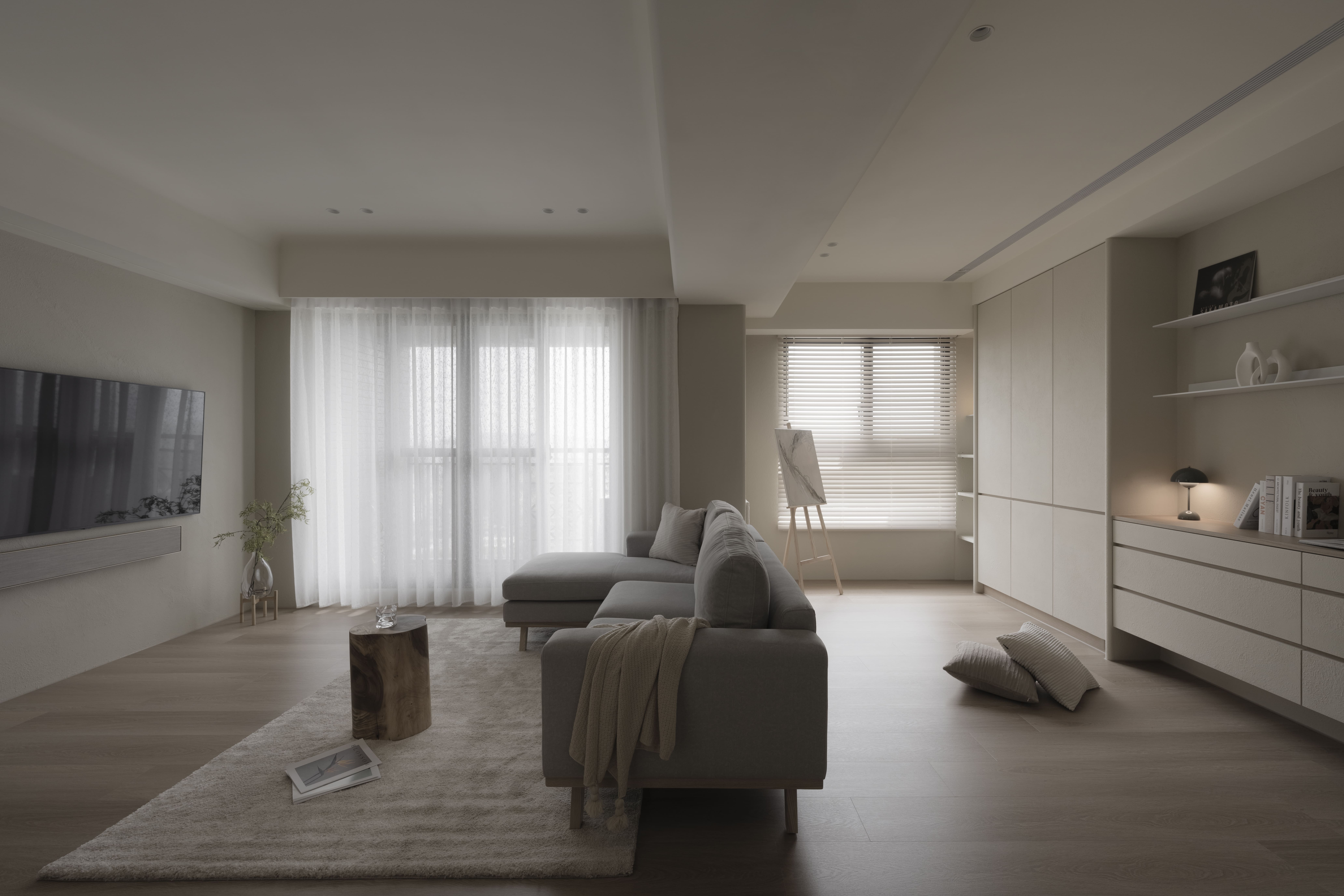 项目定位:業主偏好淡雅色彩,因此設計以米色、淺灰、乳白為主,搭配木質元素,營造乾淨寧靜且溫馨的氛圍。空間布局採開放設計,透過大面積玻璃窗引入自然光,增強通透感與明亮度。中島區成為中心,兼具儲物與社交功能,連接餐廳與客廳,提升空間流動性。
