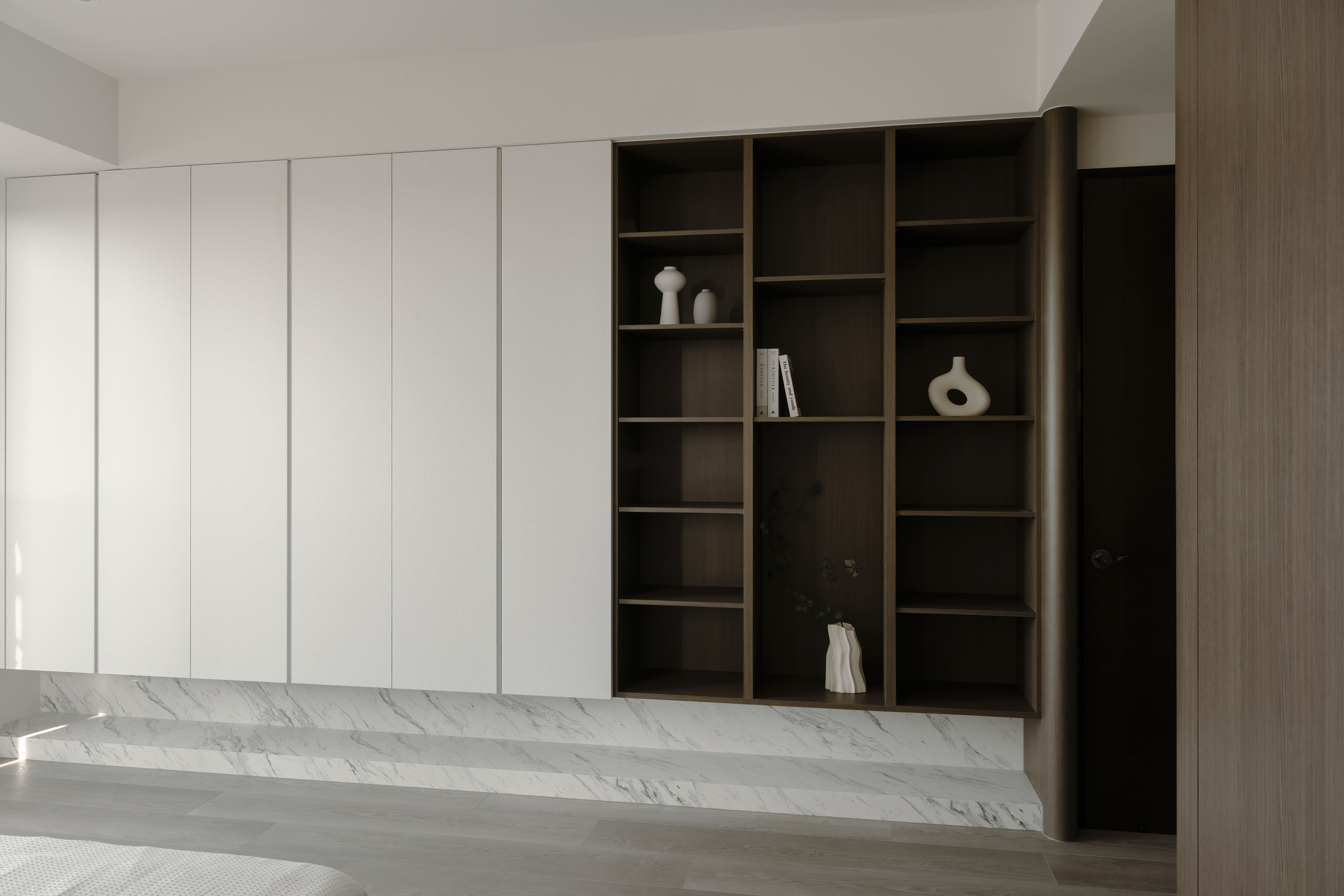 餐桌後方設計了一整排收納櫃,充分滿足儲物需求的同時,釋放了上部空間。櫃體採用紋理獨特的美耐板,成為餐廳與客廳之間的視覺焦點,巧妙地融合兩個空間,增添整體設計的細膩與層次感。 -