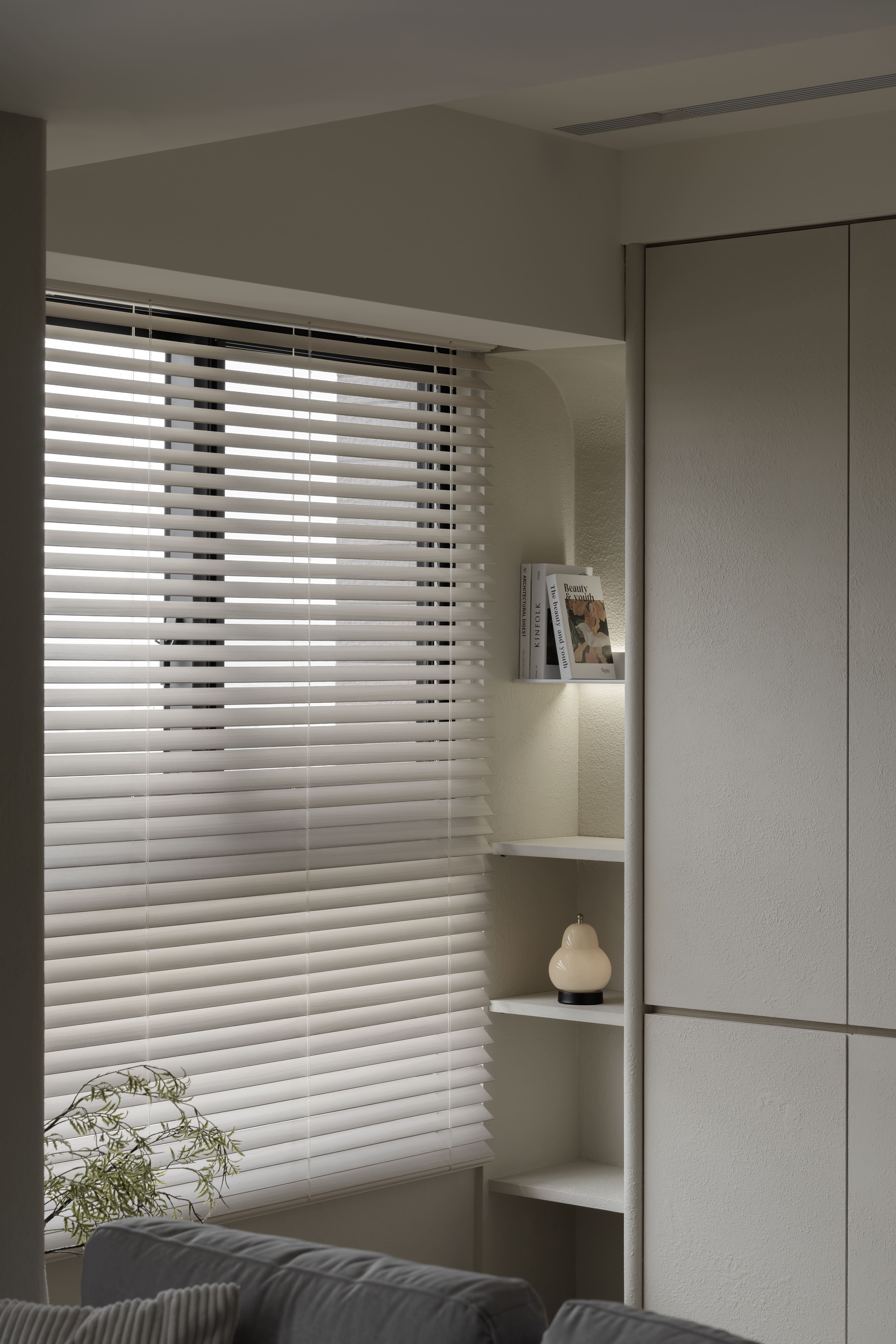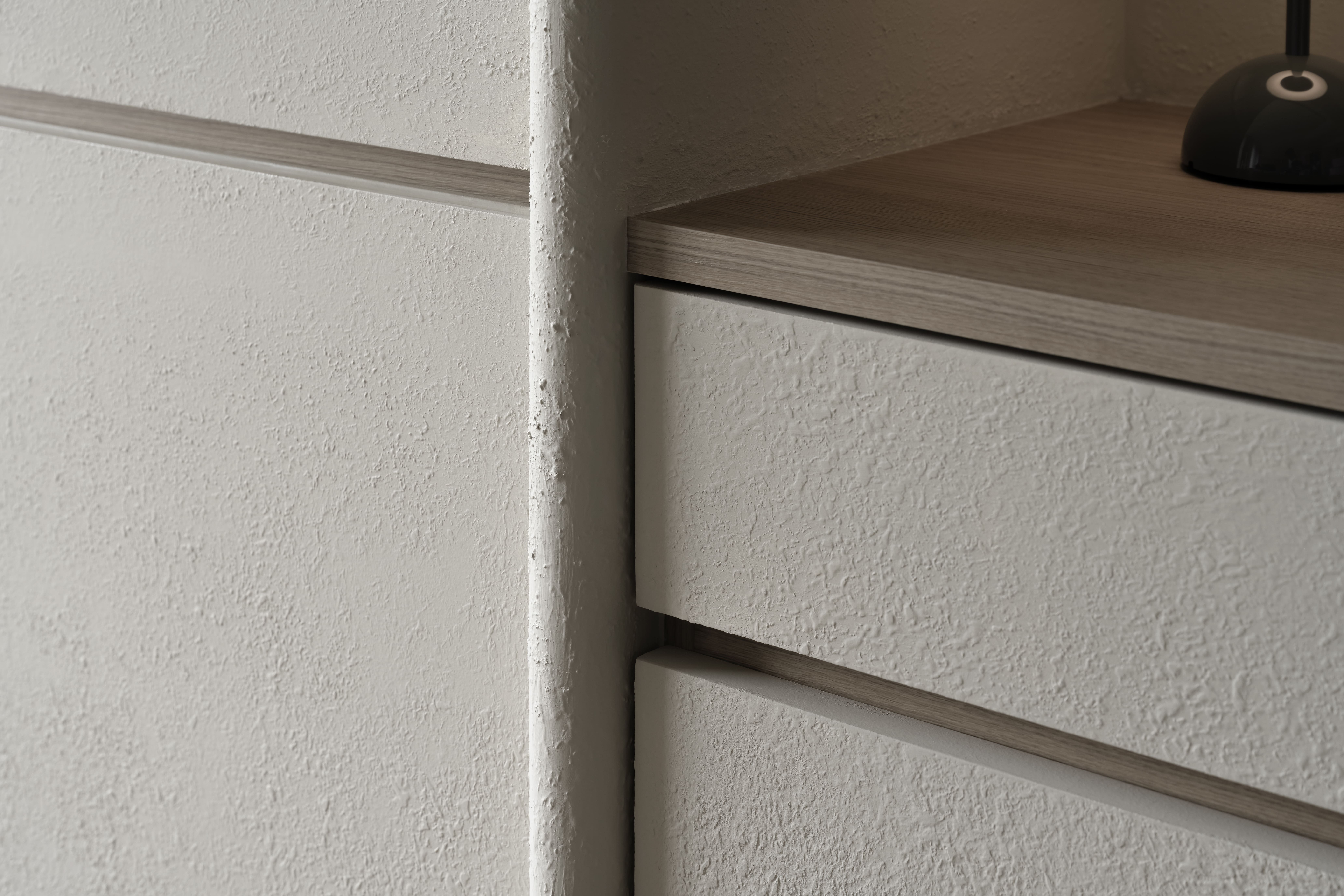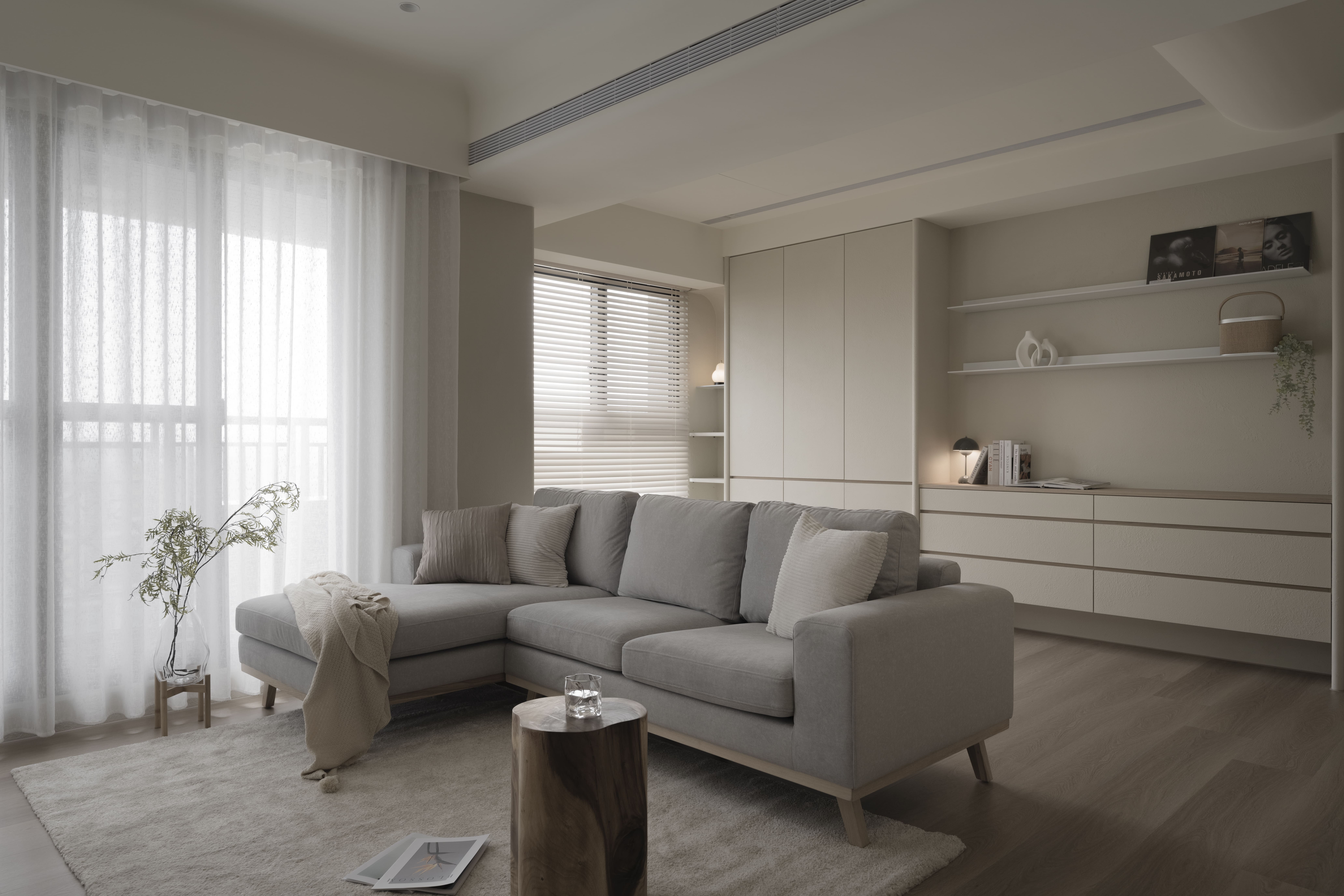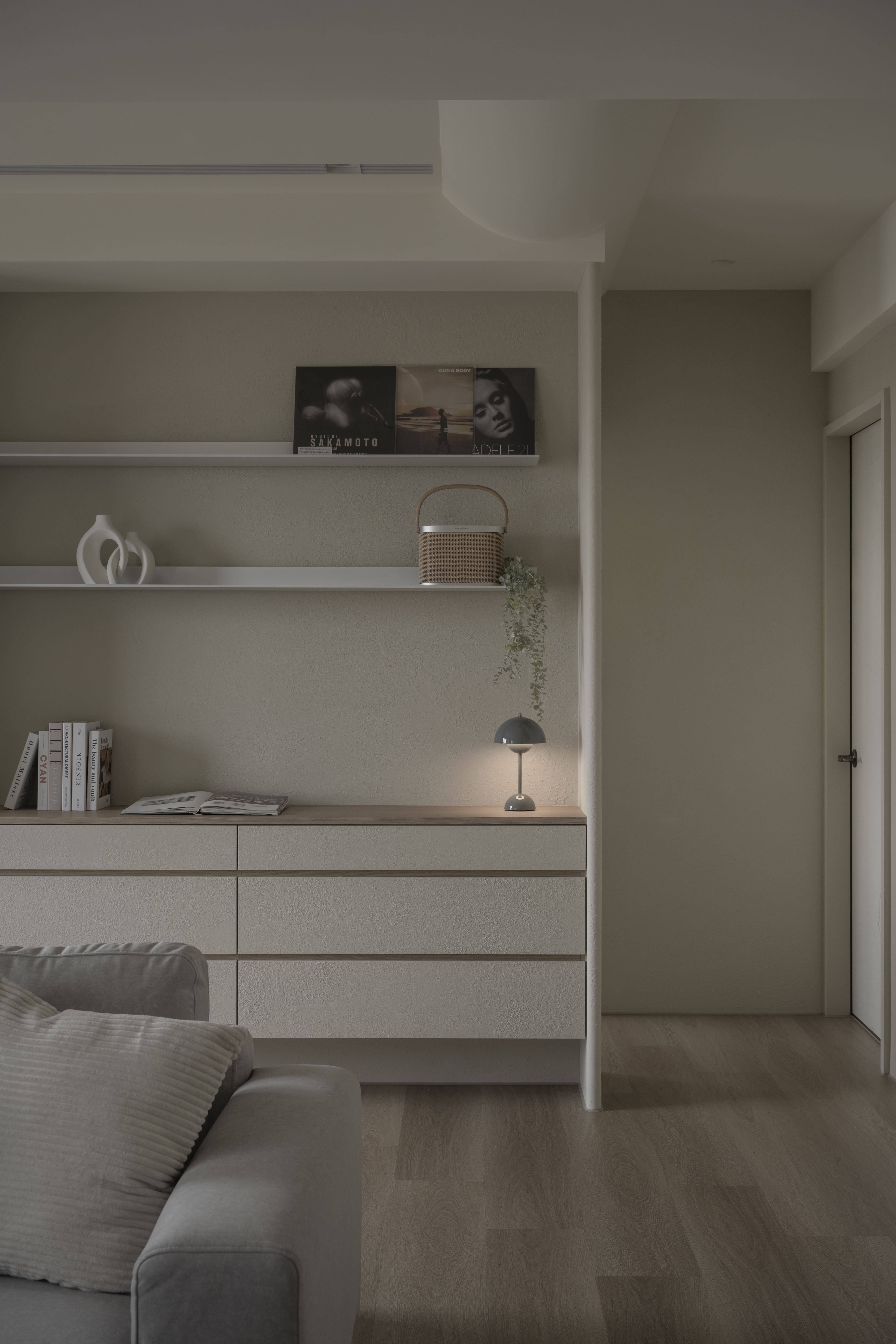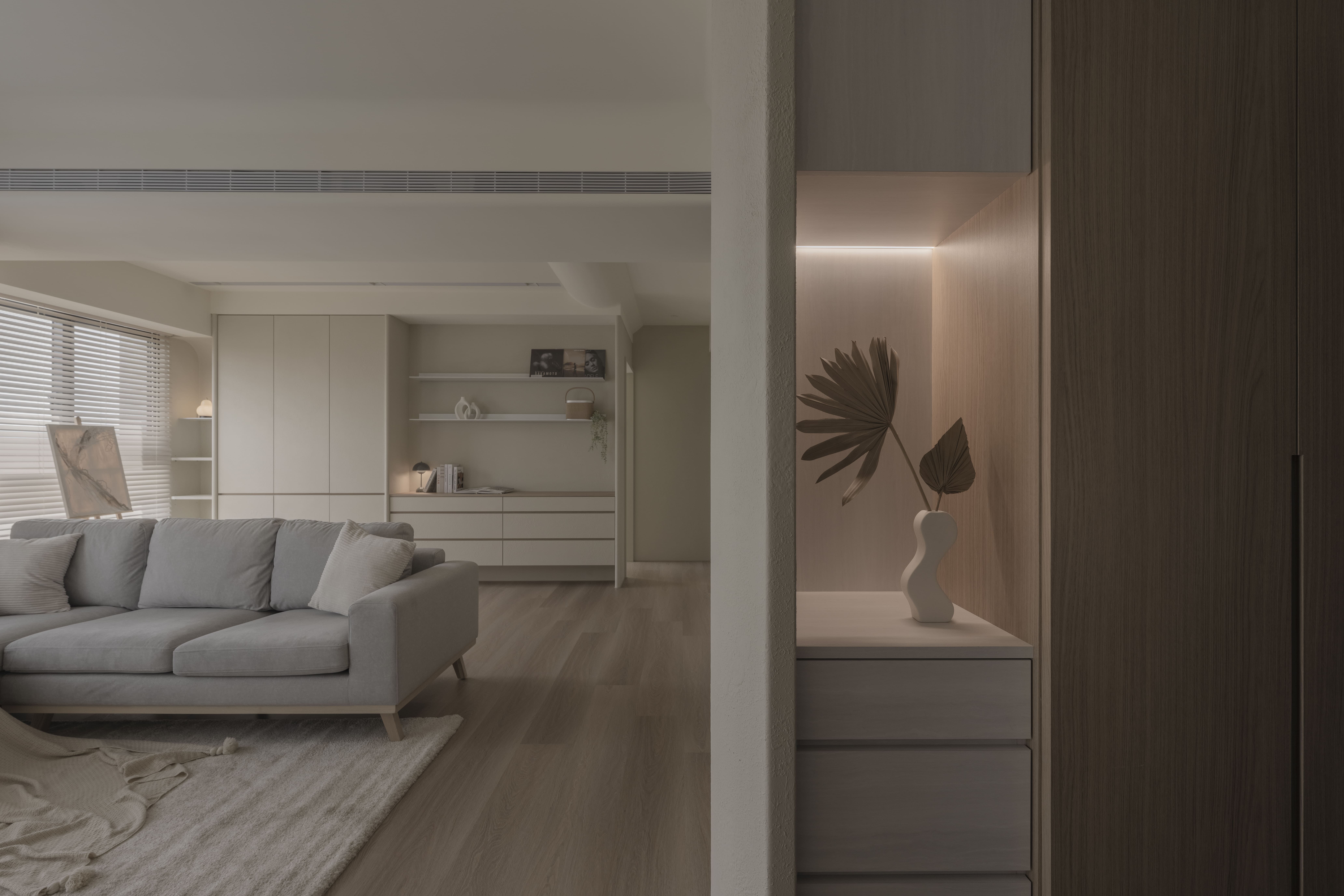 色彩以米色的藝術漆為主調,精緻紋理搭配溫潤木色,使空間更顯柔和。採用環保除甲醛建材,並結合木材、石塑地板等材質,打造節能減碳的高品質空間設計。