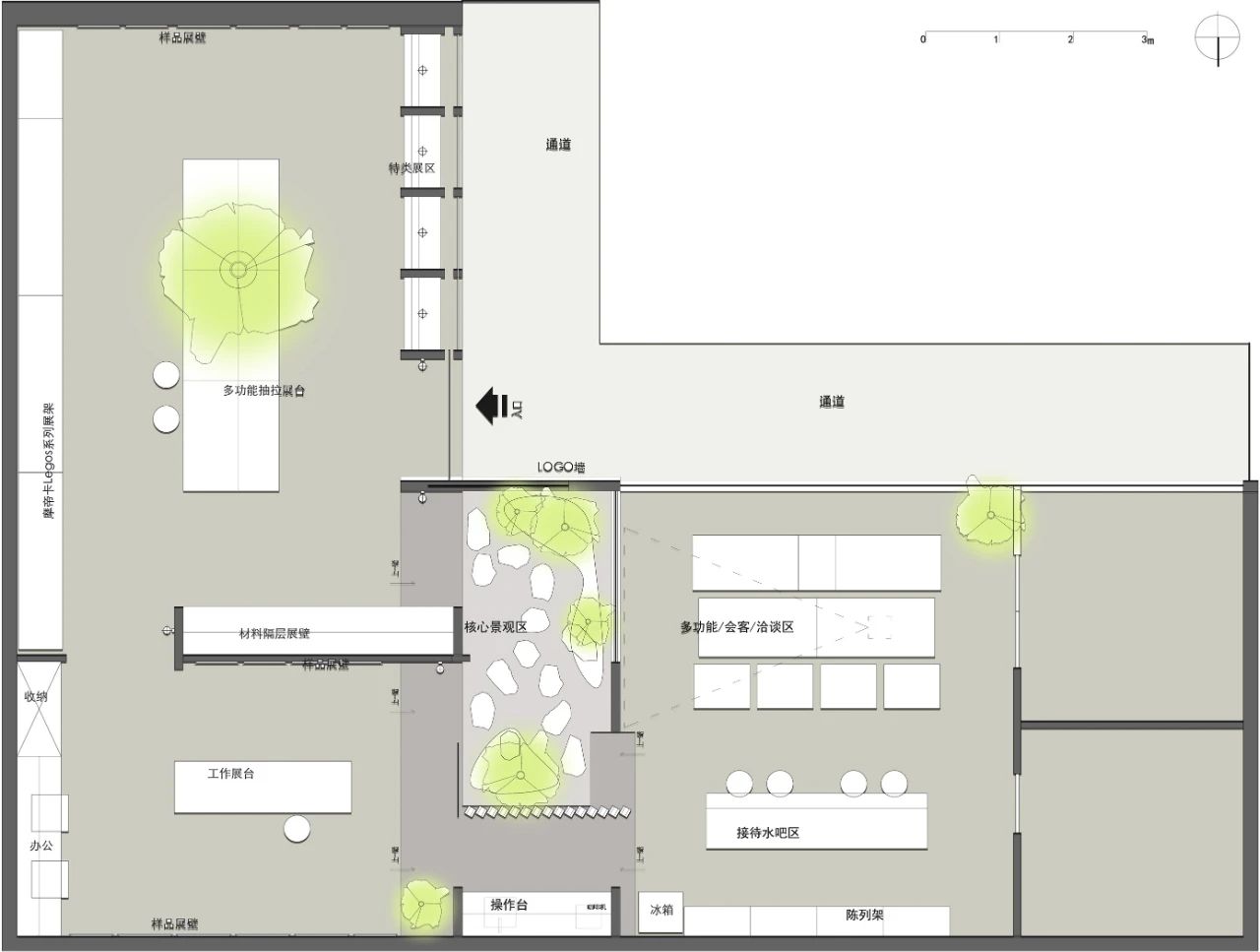 首先是外立面的重置和提升,确立品牌第一感知。引入微景观单元连接核心空间场域,产品综合展陈空间整体简洁。