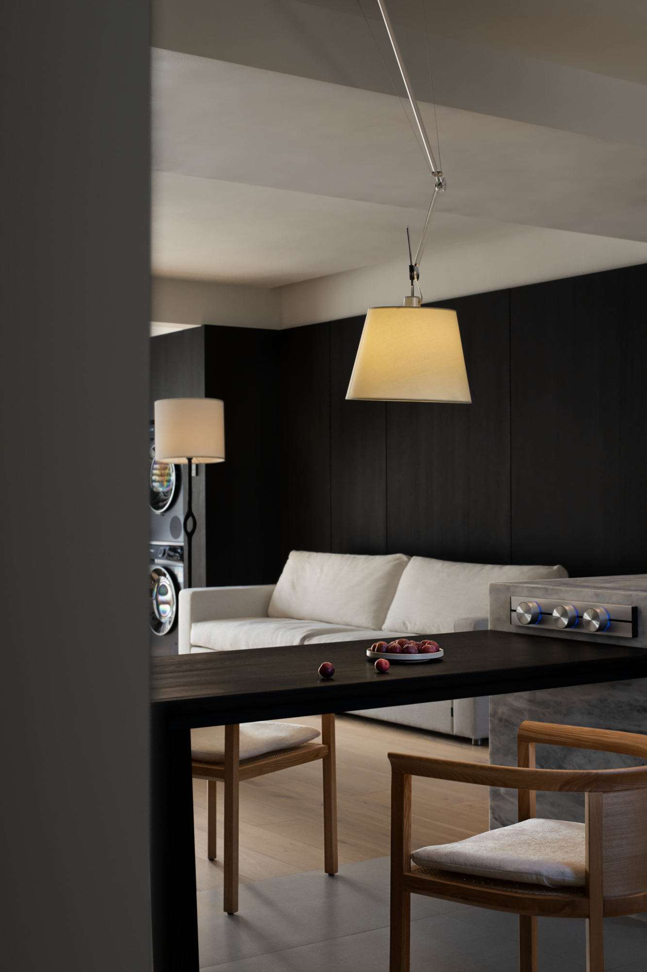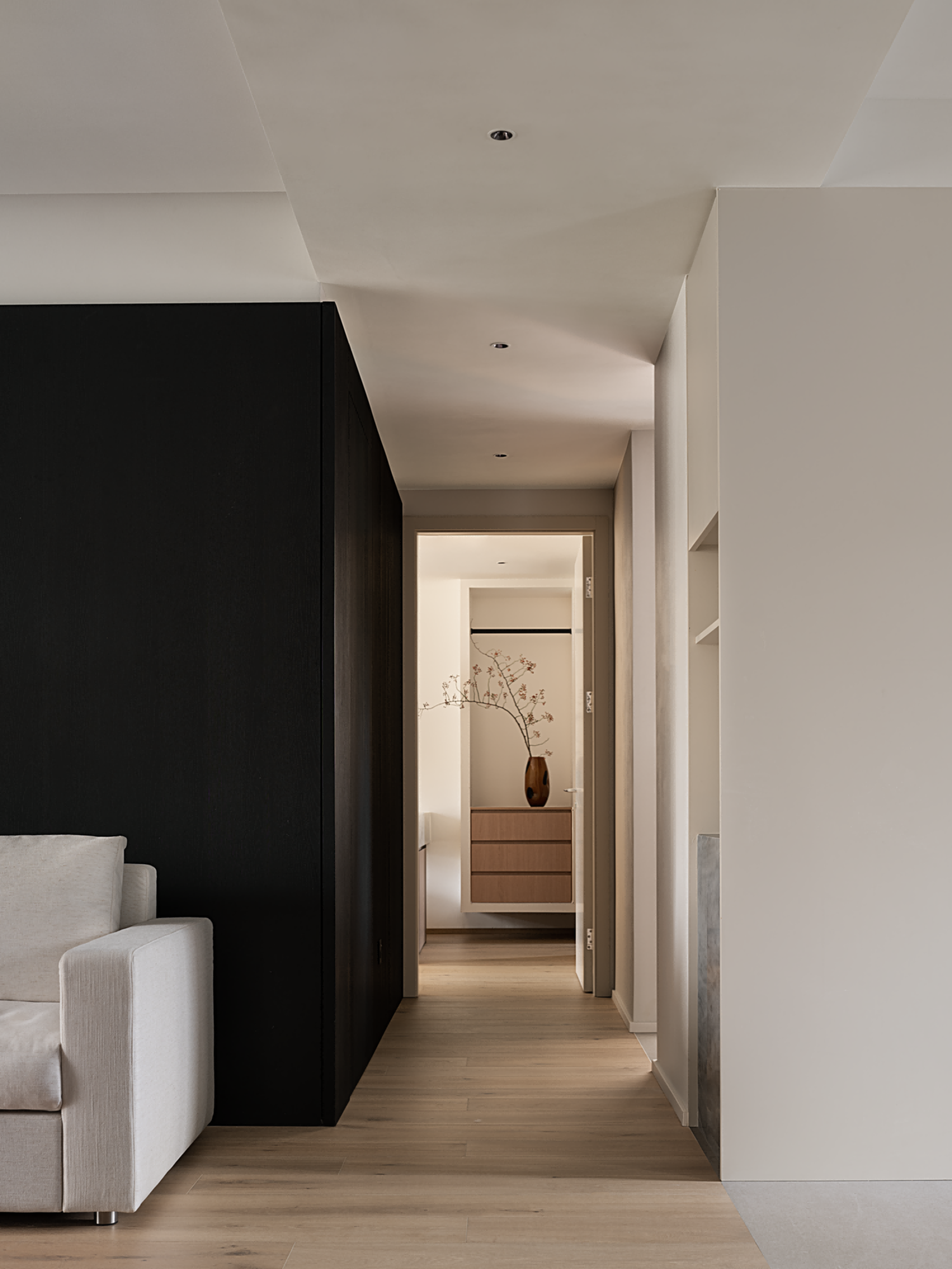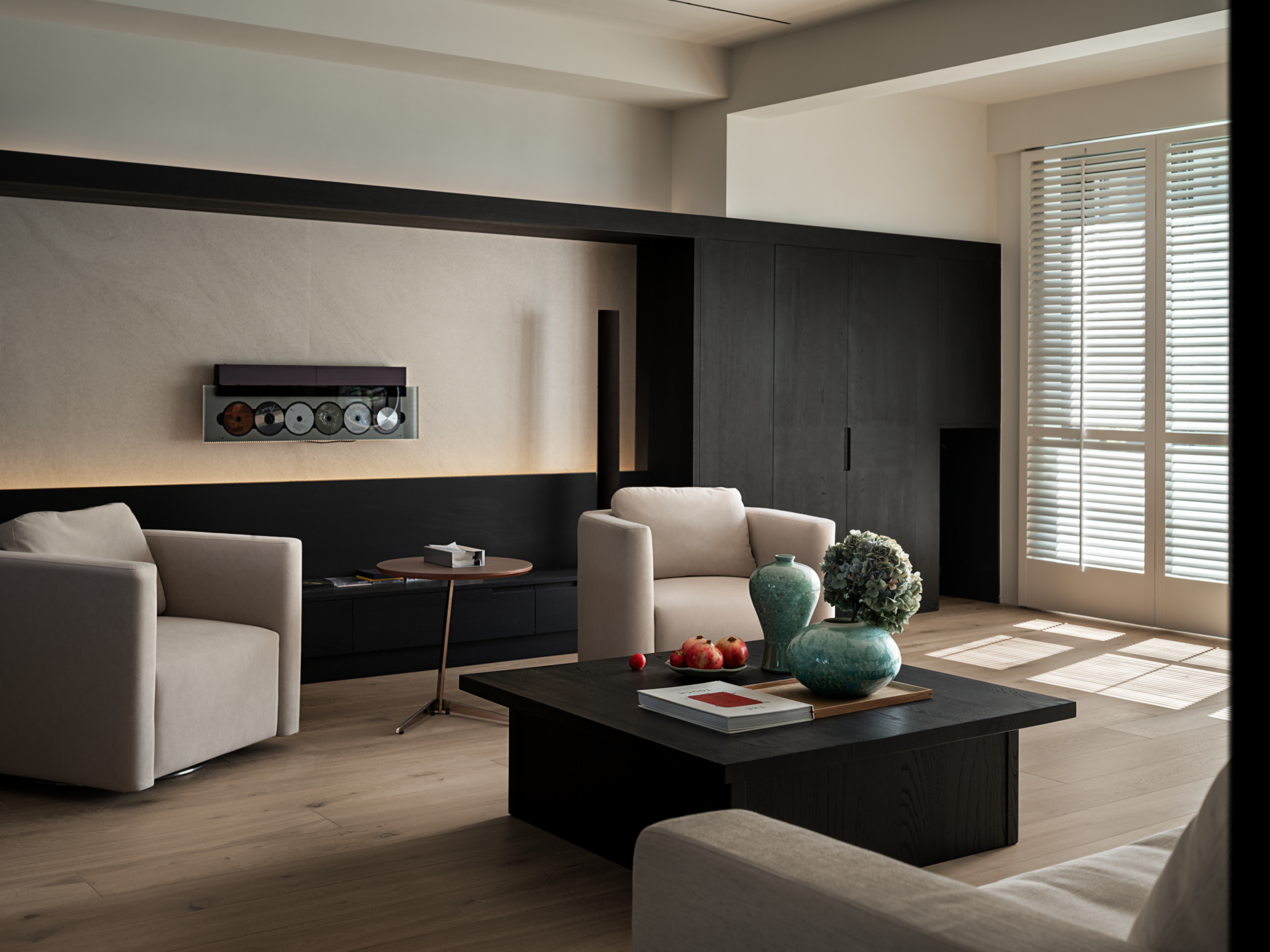 空间中大量用了复合实木地板,增加空间温润的质感,也实现光脚自由,席地而坐也不成问题。