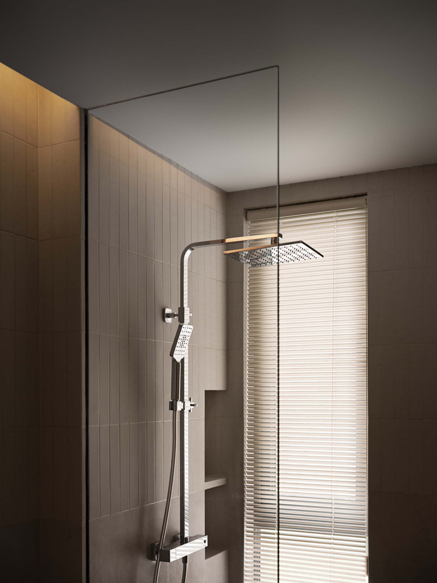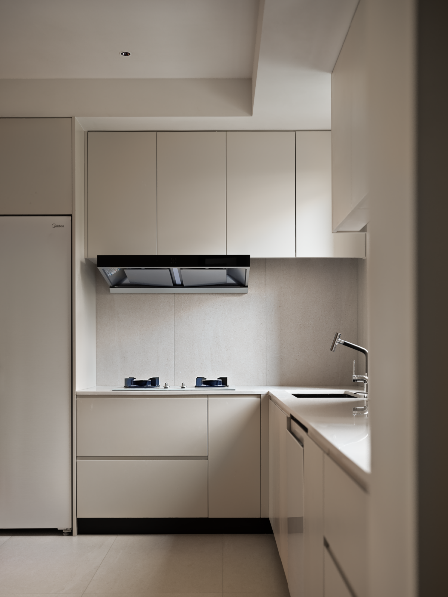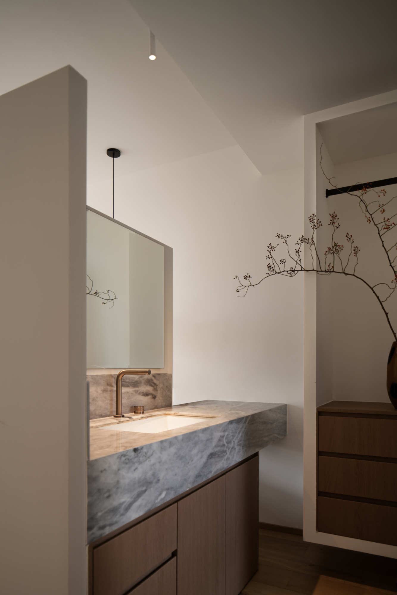 将开放通透的空间感受运用到各处,于是把干区洗手台和置物柜都做了上下留空的处理,隔而不断是放大空间感的秘诀。 -