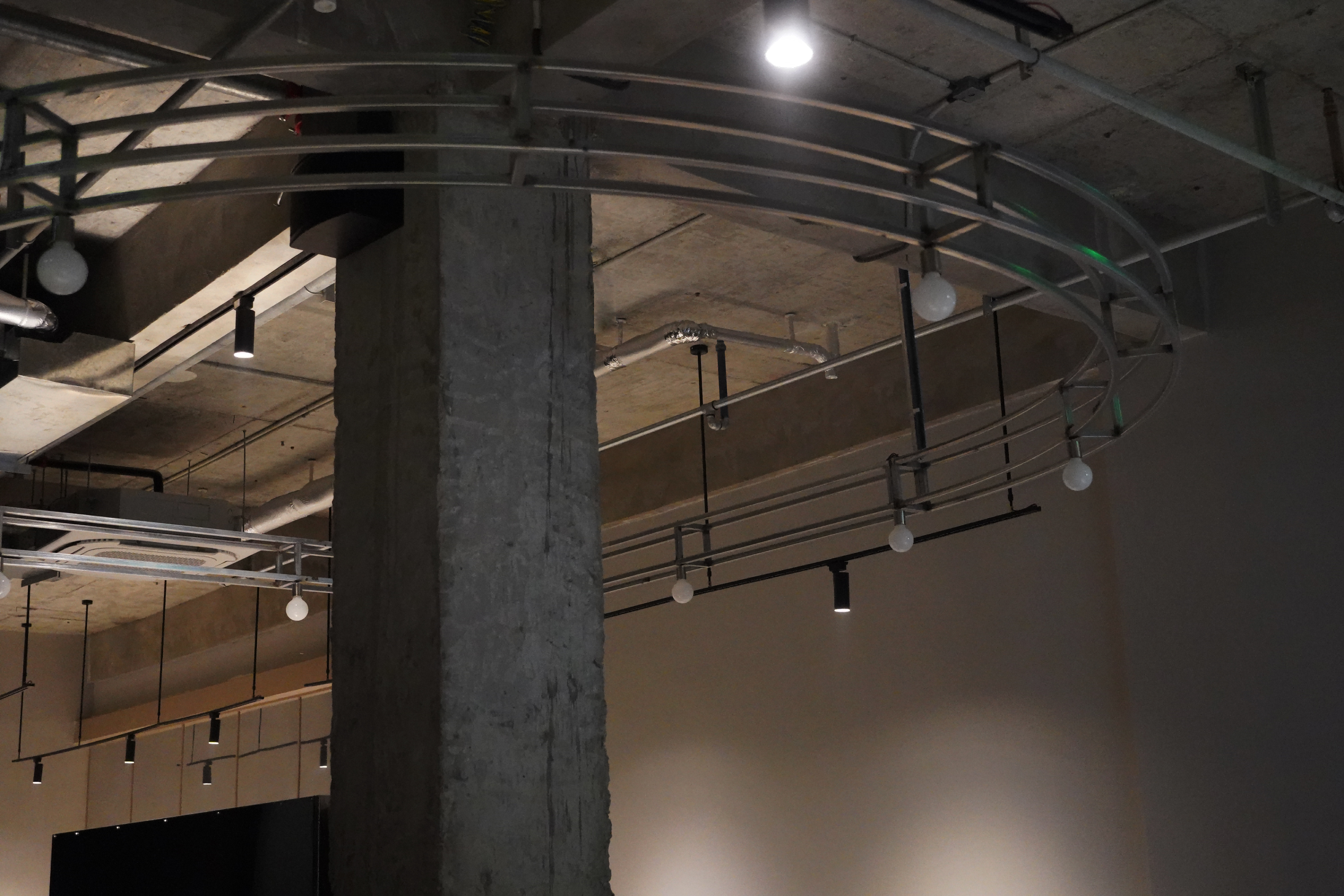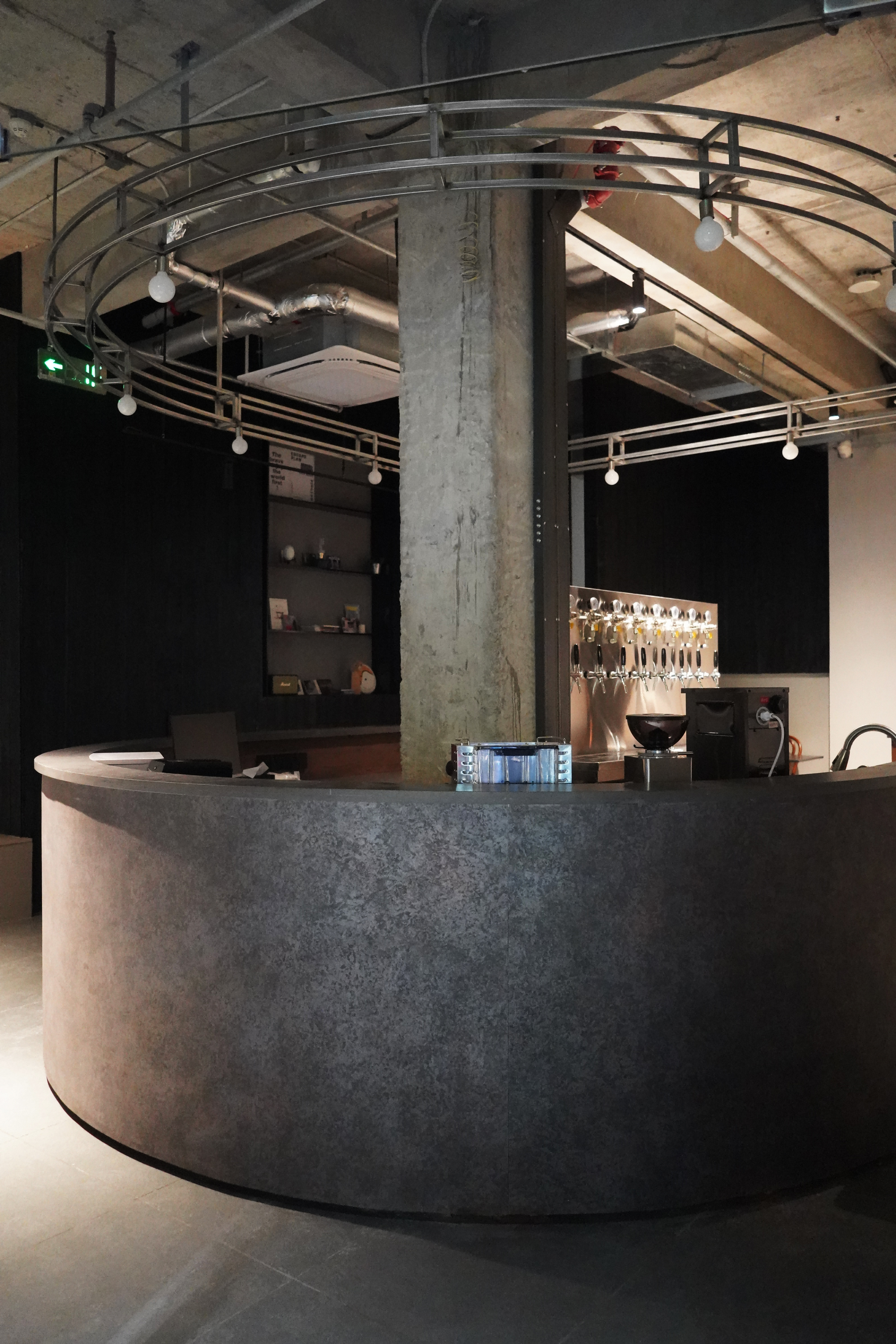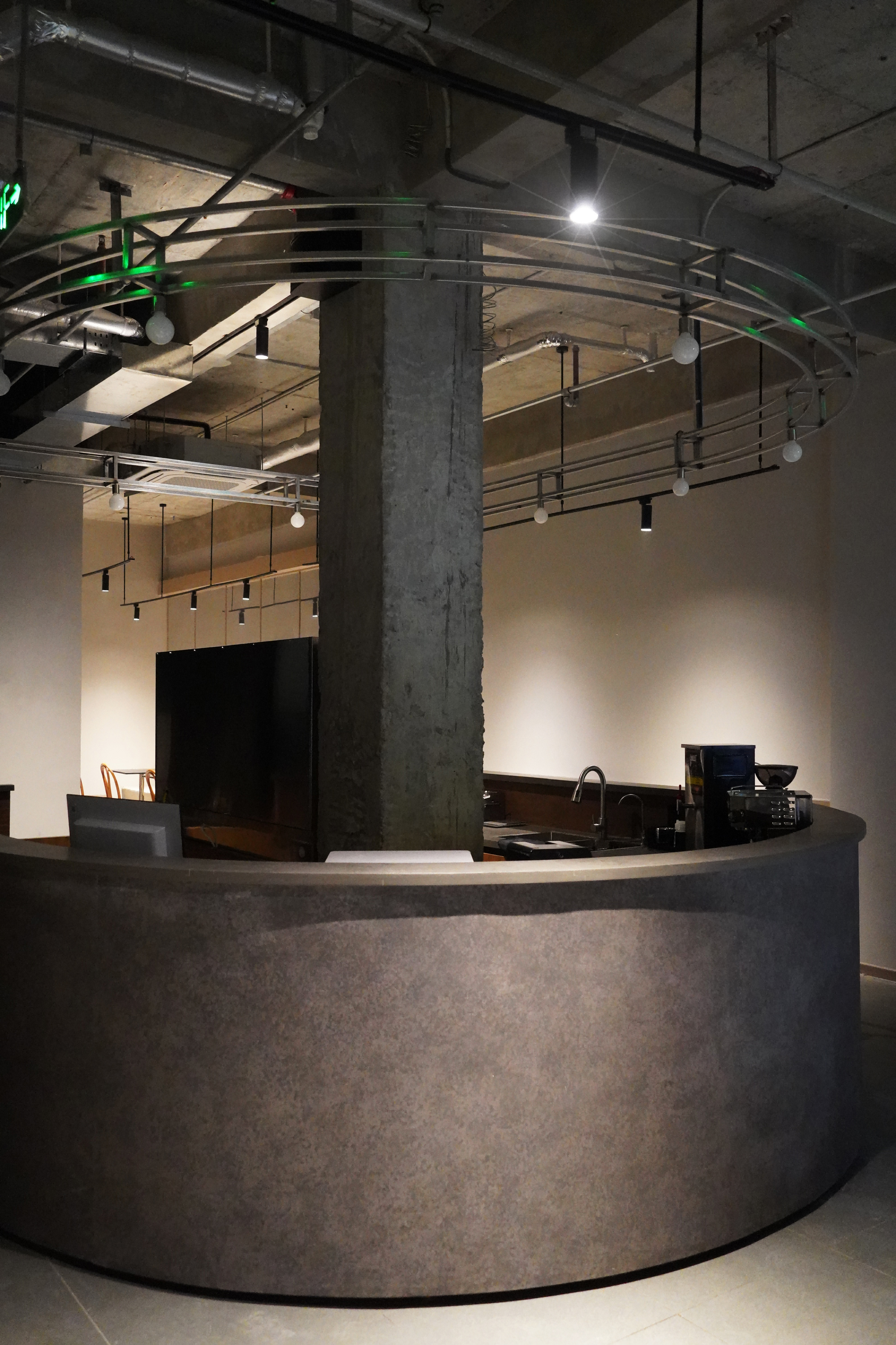空间布局:通过弧形体块处理空间,把服务台的接待属性分流,一个方向作为通往酒店客房的登记台,另一个方向分流酒店外日咖夜酒的客人。